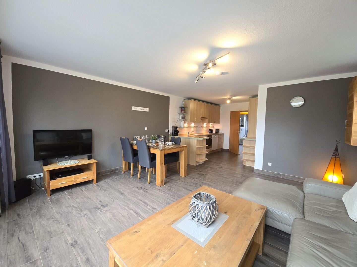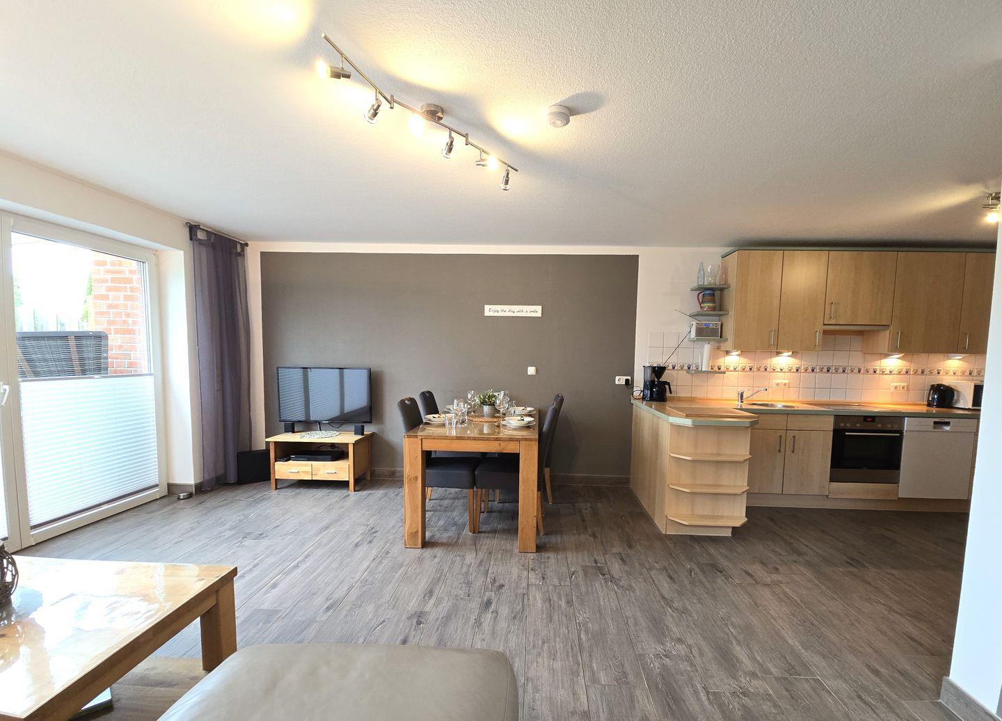 Die großzügige Wohnung bietet Platz für bis zu vier Personen und einen Hund, der dank des eingezäunten Gartens sorglos draußen spielen und die frische Meeresluft genießen könnt. Mit zwei gemütlichen Schlafzimmern, einem modernen Bad und einer offenen Küche, die nahtlos in den gemütlichen Wohn- / Essbereich übergeht, bietet das Appartement den perfekten Raum für gesellige Abende und entspannte Stunden.
