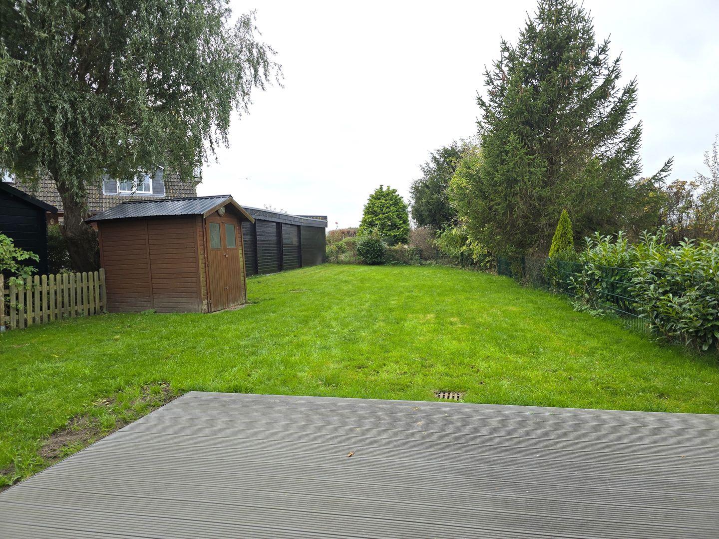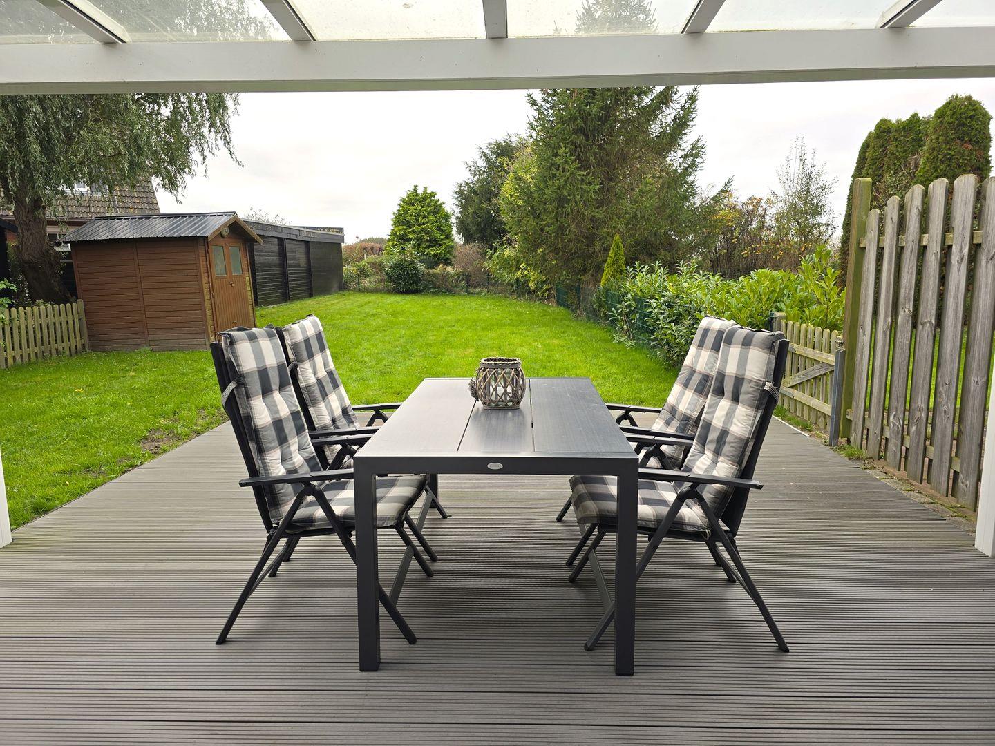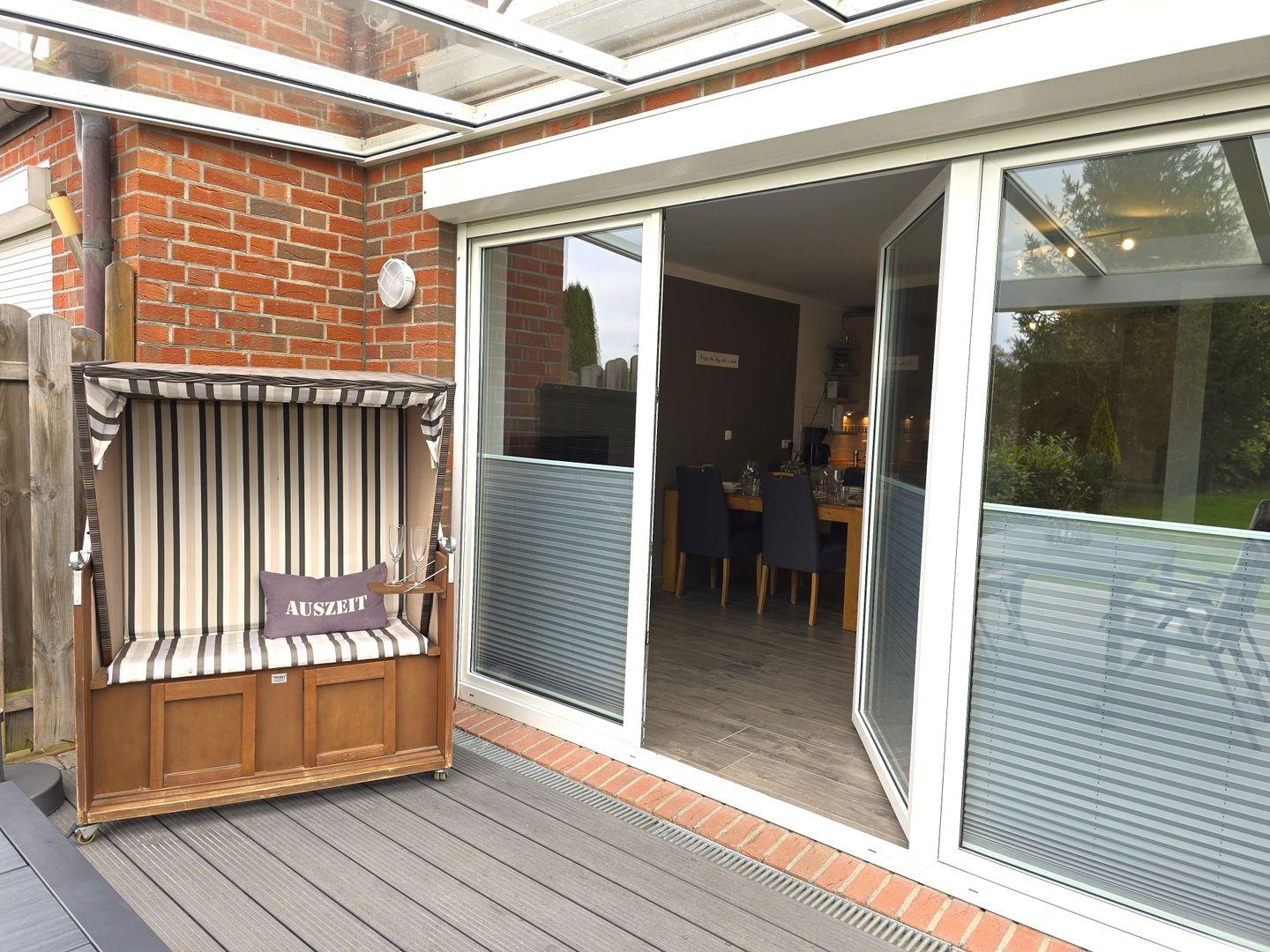 Außenbereich: überdachte Terrasse / 250qm eingezäunter Garten / Gartenhaus / Holzkohlegrill / Strandkorb am Haus / Tisch / 4 Hochlehner