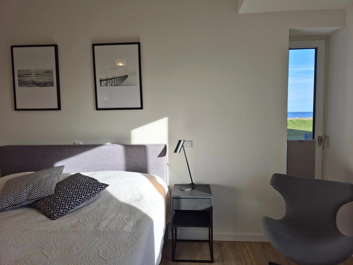 Schlafzimmer: Doppelbett (180x200) / Schrank / Sessel / Schreibtisch mit Stuhl / Plissees / Meerblick