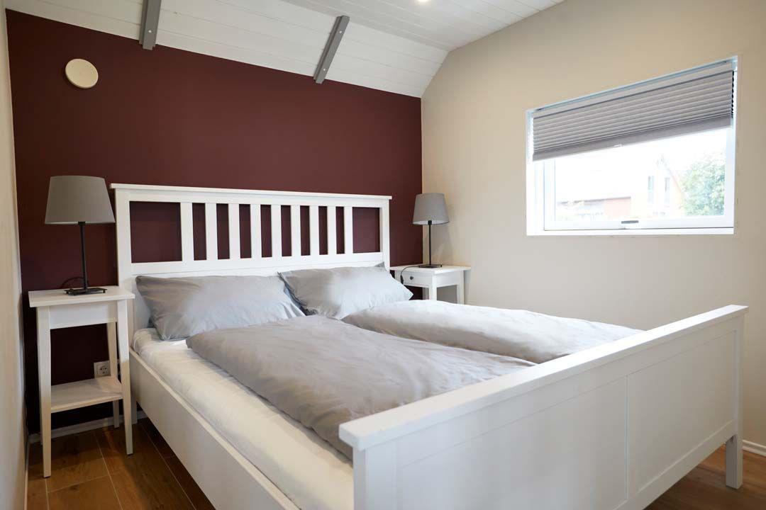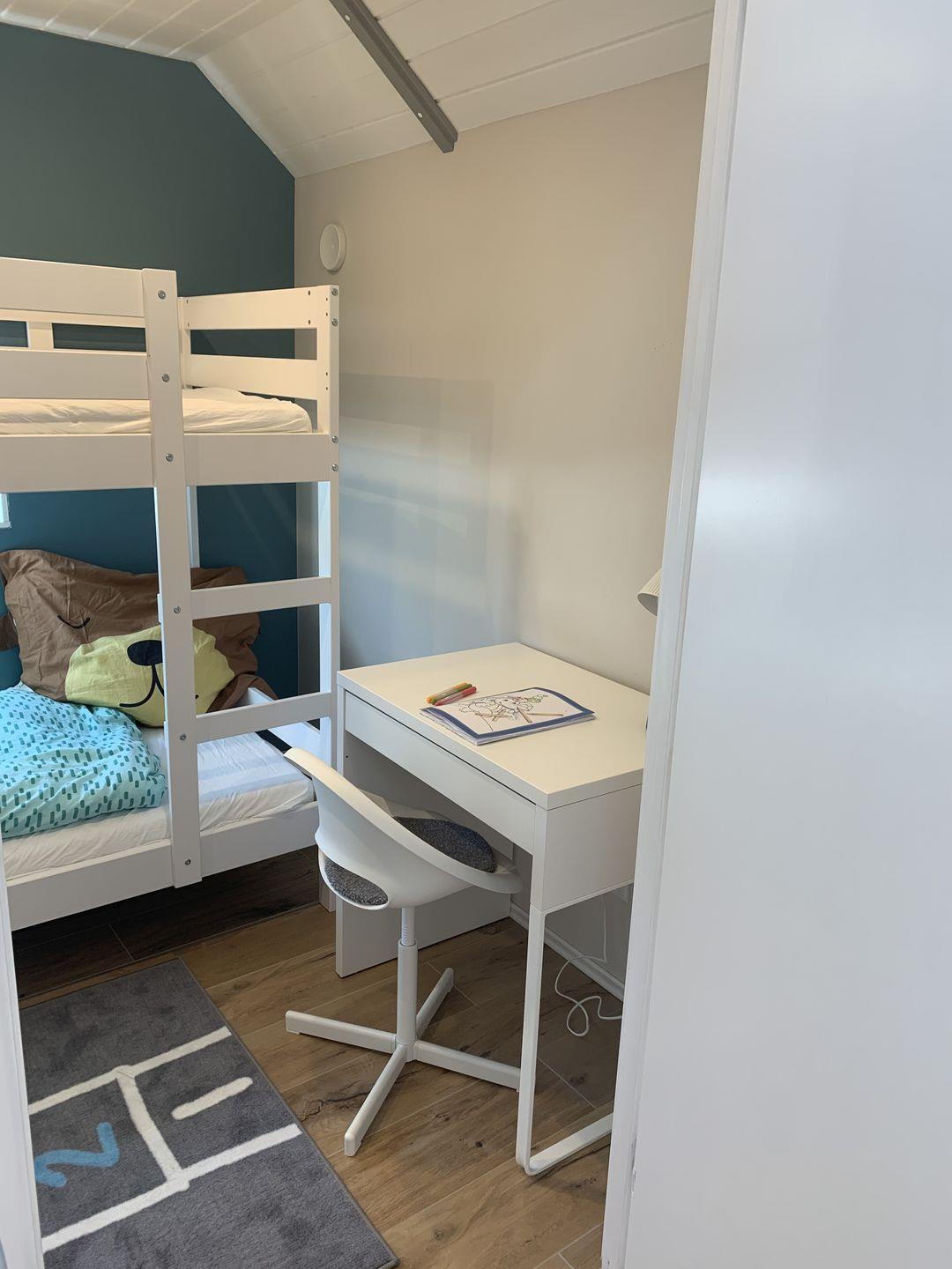 Das Ferienhaus verfügt über zwei gemütliche Schlafzimmer im Erdgeschoss. Das erste Schlafzimmer bietet ein komfortables Doppelbett mit Vorhängen und Rollos für eine angenehme Nachtruhe. Ein geräumiger Kleiderschrank bietet ausreichend Platz für Ihre persönlichen Gegenstände. Im zweiten Schlafzimmer finden Sie ein Etagenbett, das perfekt für die Kinder geeignet ist. Auch hier sorgen Vorhänge und Rollos für Privatsphäre, während ein Schreibtisch den Raum funktional abrundet.
