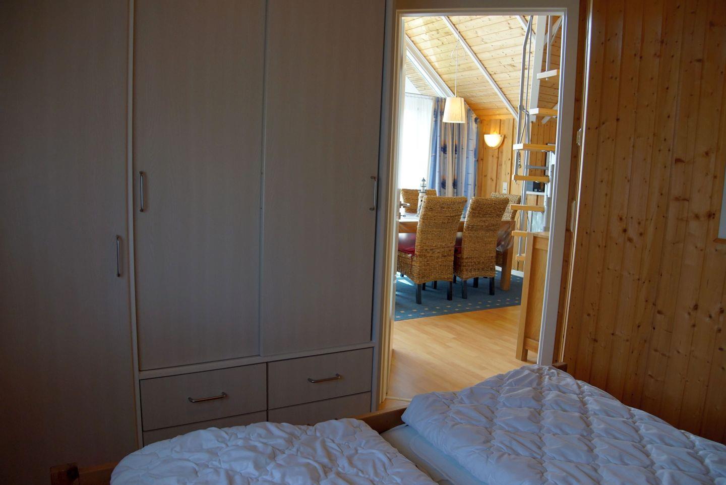 Das Ferienobjekt verfügt über zwei Schlafzimmer, die Ihnen nach einem ereignisreichen Tag Ruhe und Erholung bieten. Im ersten Schlafzimmer erwartet Sie ein großzügiges Doppelbett mit zwei komfortablen Matratzen und verdunkelnden Rollos, die Ihnen einen erholsamen Schlaf garantieren. Das zweite Schlafzimmer ist ebenfalls mit einem Doppelbett ausgestattet und verfügt über Verdunklungsrollos. Zudem steht ein Kinderreisebett bereit, um auch den jüngsten Mitgliedern Ihrer Gruppe einen gemütlichen Schlafplatz zu bieten. Darüber hinaus besteht die Möglichkeit, eine weitere Person im offenen Obergeschoss unterzubringen, was zusätzlichen Freiraum für Ihre Gäste schafft.