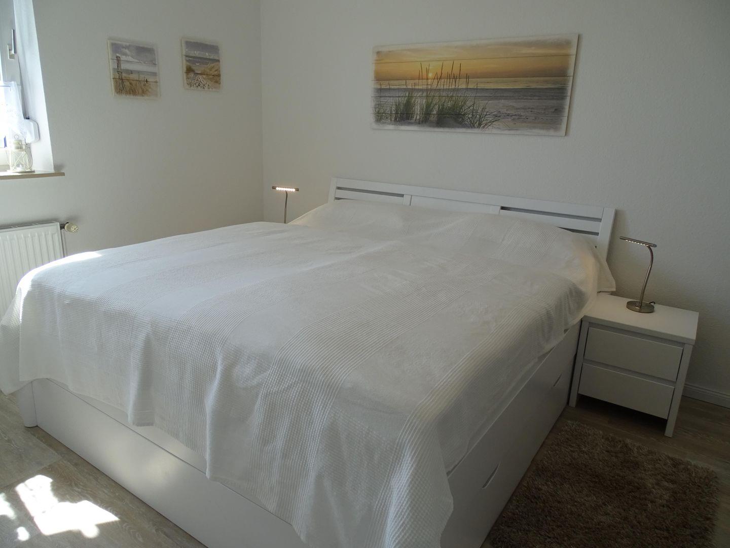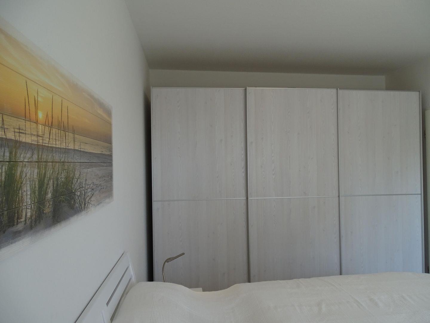 Das Schlafzimmer bietet Ihnen erholsame Nächte in einem komfortablen Doppelbett mit großem Kleiderschrank für Ihre Garderobe. Für einen angenehmen Schlaf sorgen der Insektenschutz und die Außenjalousien.