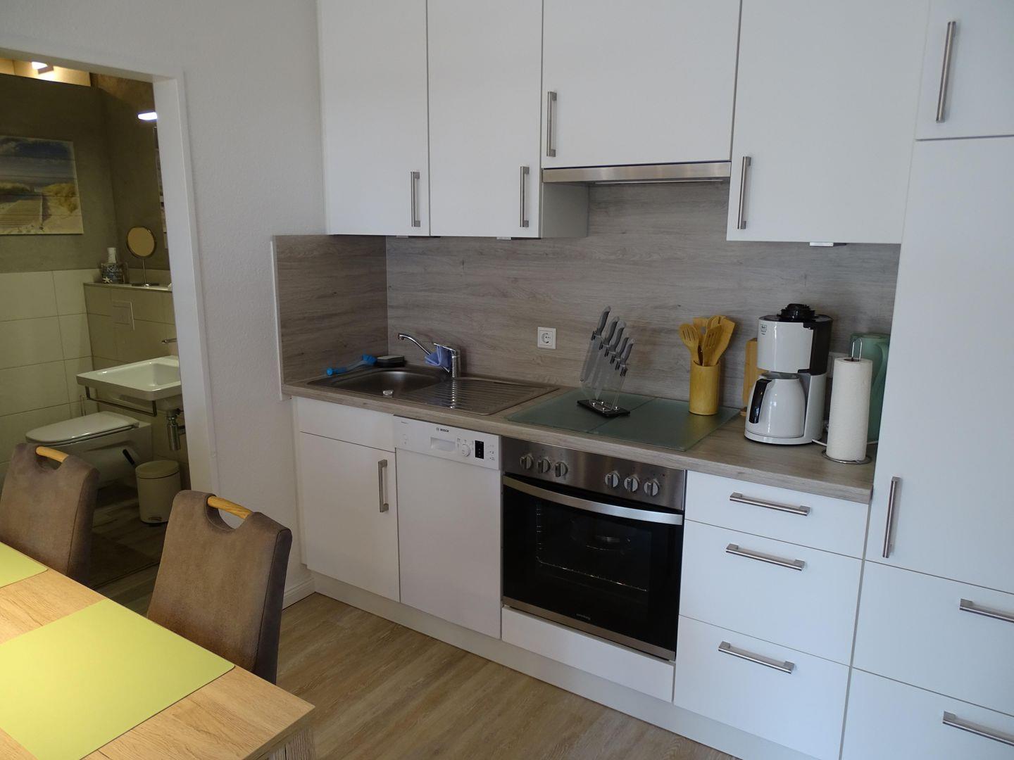 Im Inneren erwartet Sie ein offener und einladender Raum, der Küche, Essbereich und Wohnzimmer vereint. Die komplett eingerichtete Einbauküche bietet Ihnen alle Annehmlichkeiten, die Sie für die Zubereitung Ihrer Mahlzeiten benötigen. Ein 4-Platten-Herd, Backofen, Kühlschrank mit Gefrierfach, Mikrowelle, Geschirrspüler und weitere Küchenutensilien stehen Ihnen zur Verfügung. Starten Sie den Tag mit einer Tasse frisch gebrühtem Kaffee aus der Kaffeemaschine und genießen Sie Ihr Frühstück am Esstisch mit vier Stühlen.