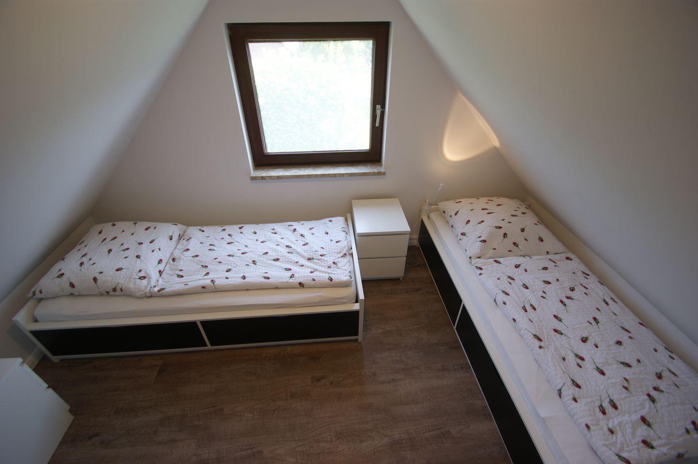 Für Ihre erholsame Nachtruhe stehen Ihnen drei gemütliche Schlafzimmer zur Verfügung. Das erste und zweite Schlafzimmer im Obergeschoss sind mit jeweils einem komfortablen Doppelbett ausgestattet, das mit einer Größe von 1,60 x 2 m (1 große Matratze) für eine angenehme Schlafumgebung sorgt. Die Matratzen bieten besten Liegekomfort, sodass Sie ausgeruht in den neuen Tag starten können. Im dritten Schlafzimmer finden Sie zwei Einzelbetten vor, die perfekt für Kinder oder zusätzliche Gäste geeignet sind.