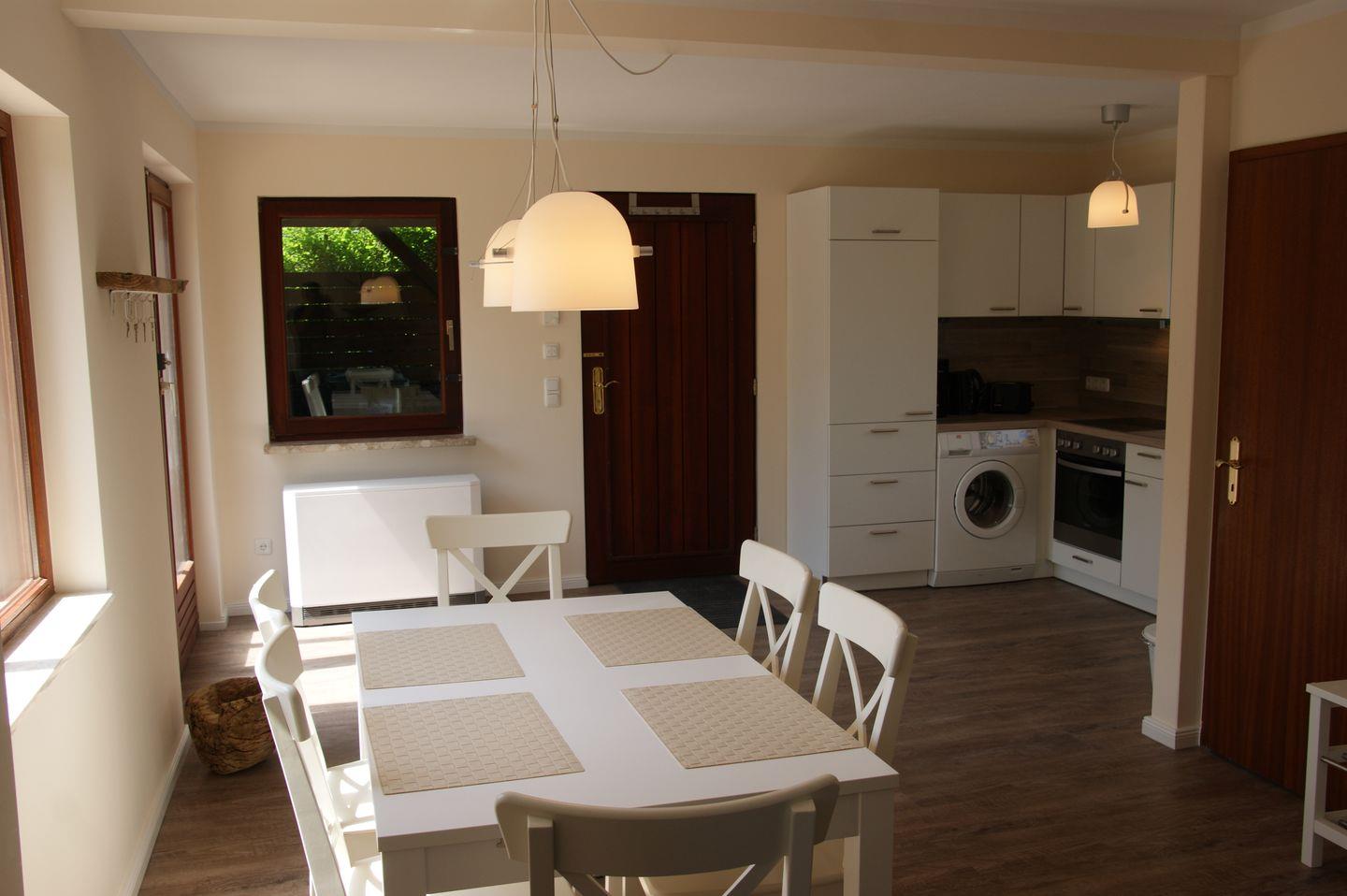 Der Essbereich lädt mit einem stilvollen Esstisch und bequemen Stühlen zu gemeinsamen Mahlzeiten ein. Hier können Sie kulinarische Köstlichkeiten genießen und sich über die Erlebnisse des Tages austauschen. Falls Sie mit Kindern reisen, stellen wir Ihnen gerne einen Kinderhochstuhl zur Verfügung, damit auch die Kleinen bequem und sicher am Tisch sitzen können.