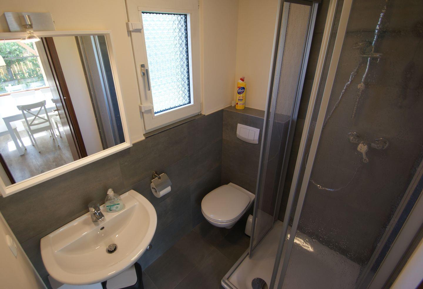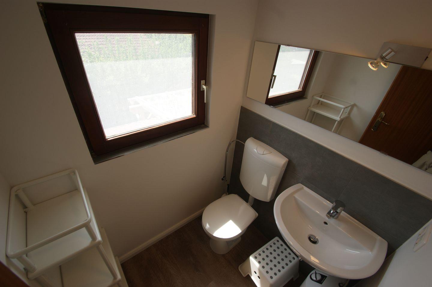 Das Badezimmer im Erdgeschoss verfügt über eine Dusche, ein WC und ein Waschbecken. Hier können Sie sich nach einem aktiven Tag erfrischen und entspannen. Zudem steht Ihnen eine Waschmaschine zur Verfügung, sodass Sie auch während Ihres Aufenthalts Ihre Wäsche bequem reinigen können.