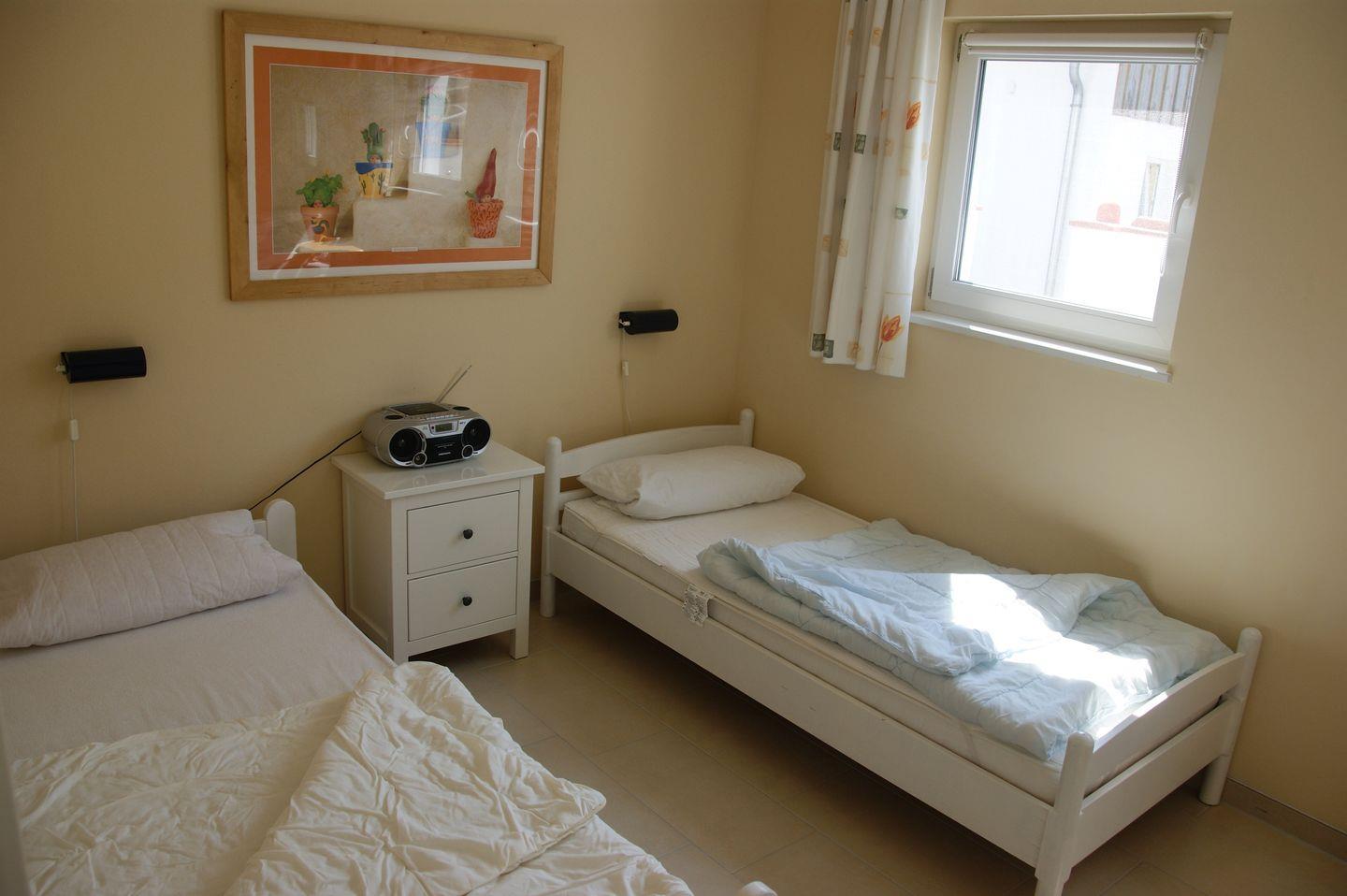 Die Ferienwohnung verfügt über zwei gemütliche Schlafzimmer. Das erste Schlafzimmer ist mit einem komfortablen Doppelbett ausgestattet, das 2016 neue Matratzen erhielt. Ein großer Kleiderschrank und eine Kommode bieten ausreichend Stauraum für Ihre persönlichen Gegenstände. Hier steht Ihnen außerdem ein Flachbildfernseher zur Verfügung. Das zweite Schlafzimmer verfügt über zwei Einzelbetten mit ebenfalls neuen Matratzen von 2016 sowie einen geräumigen Kleiderschrank.