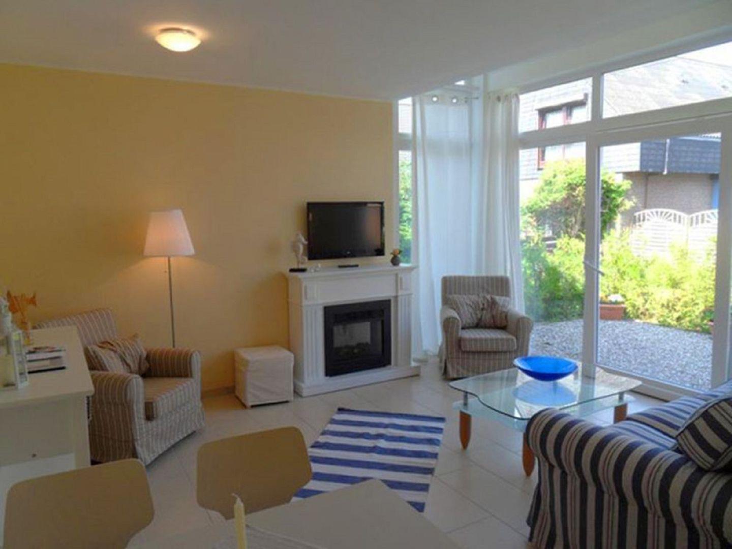 Im Wohnzimmer erwartet Sie eine gemütliche Atmosphäre. Ein bequemes Sofa und zwei Sessel laden zum Entspannen ein, während ein großer Elektrokamin für eine behagliche Wärme sorgt. Durch die große Fensterfront strömt viel natürliches Licht in den Raum und schafft eine freundliche Atmosphäre. Ein Flachbildfernseher, eine Bose-Stereoanlage, ein Radio, ein CD-/DVD-Player und ein Blue-Ray-Player stehen für Ihre Unterhaltung bereit.