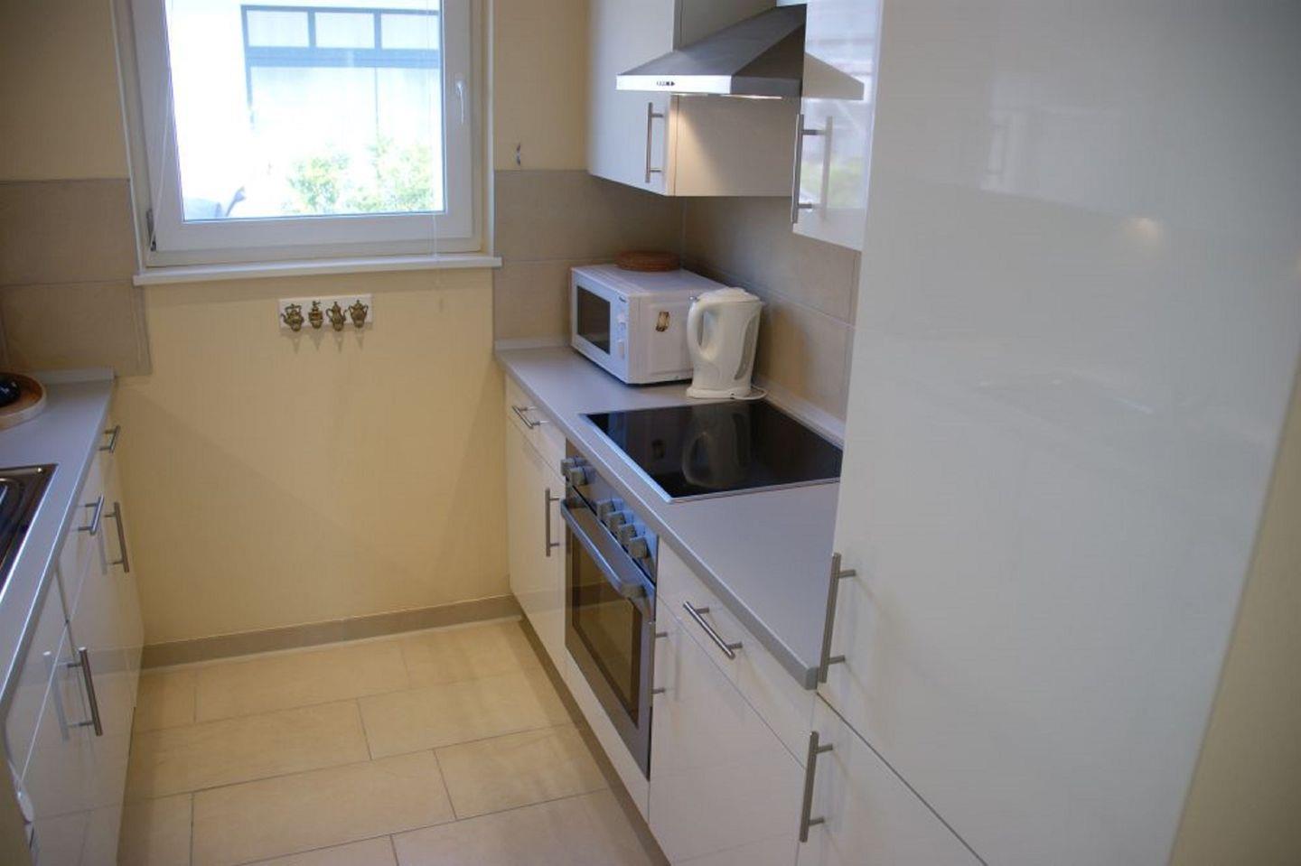 Das Innere der Wohnung bietet eine perfekte Kombination aus Komfort und Funktionalität. Eine komplett eingerichtete Einbauküche erwartet Sie mit modernen Geräten wie einem Ceran-Kochfeld, Kaffeemaschine, Geschirrspüler, Kühlschrank mit Gefrierfach, Backofen, Wasserkocher, Toaster, Mixer, Dunstabzugshaube, Mikrowelle, Eierkocher, Bügelbrett und Bügeleisen. Hier können Sie nach Lust und Laune köstliche Gerichte zubereiten.