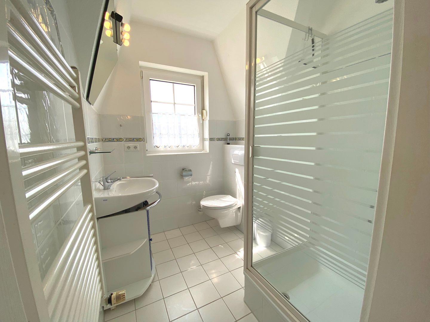 Die Wohneinheit für 4 Personen besticht im Erdgeschoss ebenfalls mit einem offenen Wohnzimmer und einer voll ausgestatteten Küche. Der Zugang zur Terrasse lädt dazu ein, die frische Meeresluft und den schönen Gartenbereich mit viel Privatsphäre zu genießen. Im Obergeschoss befinden sich zwei Schlafzimmer, eines davon mit eigenem kleinen Bad en Suite und Balkon, sowie ein weiteres Badezimmer mit Dusche und Fenster.
