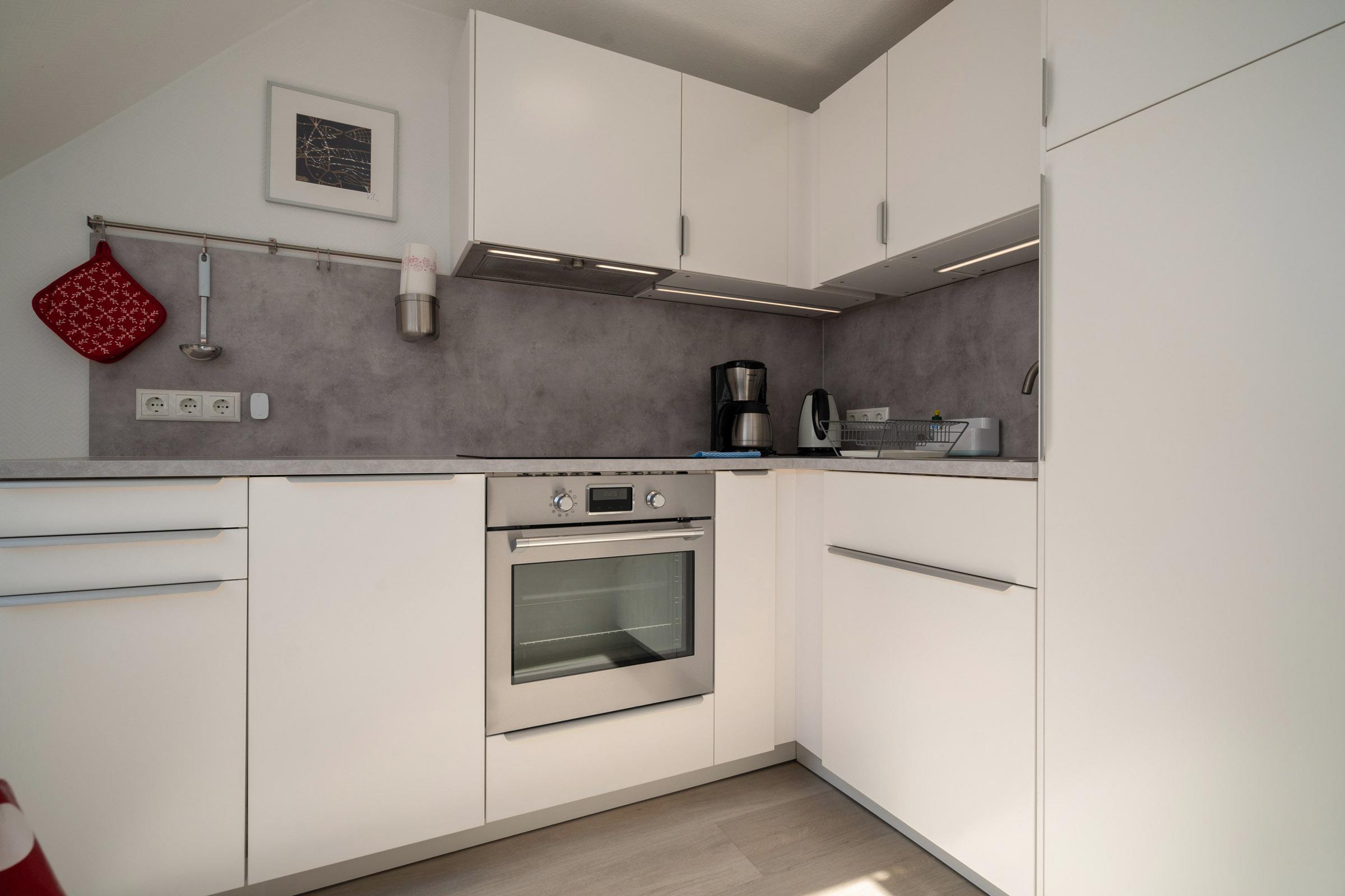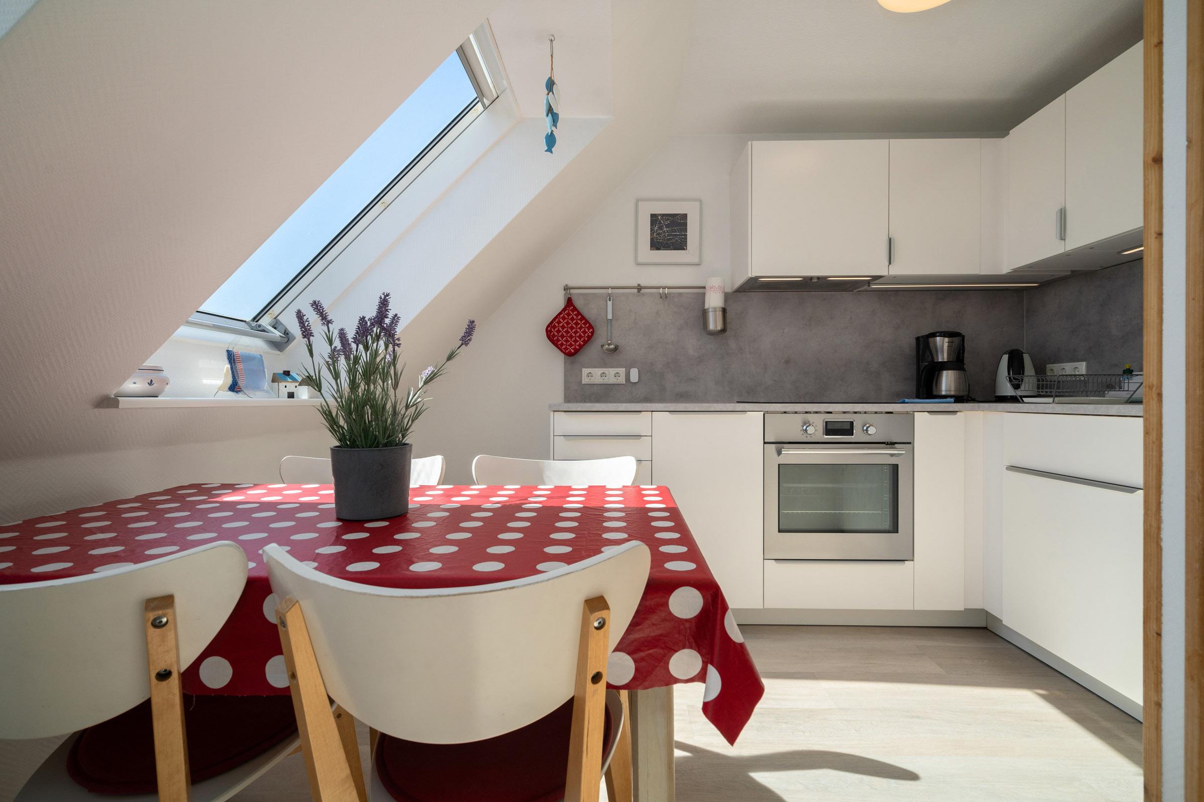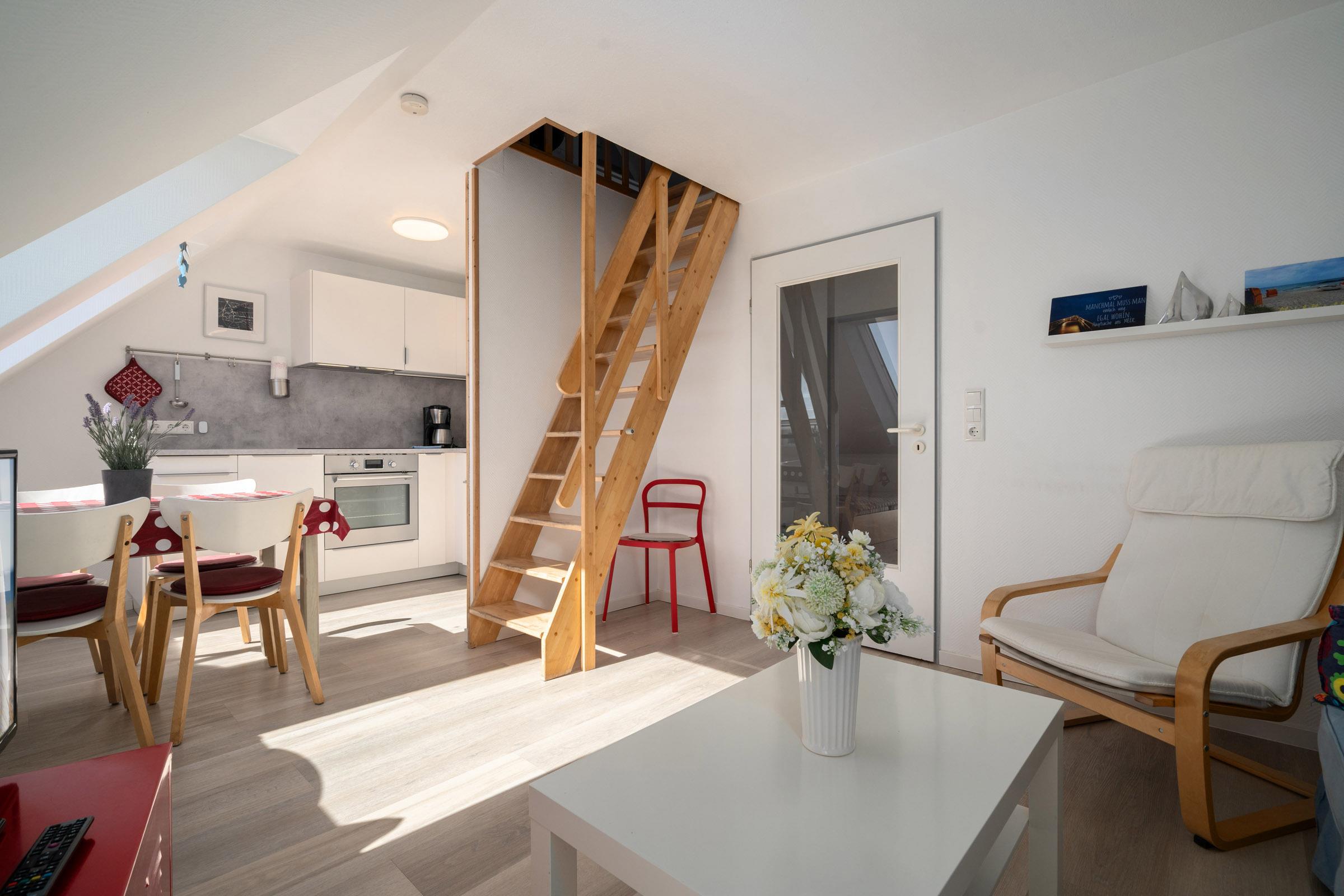 Im 2. Obergeschoss befindet sich das Wohnzimmer mit Südbalkon, Küchenzeile mit Essbereich, ein Duschbad und ein Schlafzimmer mit Doppelbett. In der offenen Galerie im Dachgeschoss befindet sich ein weiteres Schlafzimmer, das mit zwei Einzelbetten ausgestattet ist. Ein kostenloser WLAN–Anschluss verbindet Sie auch im Urlaub mit dem "Rest der Welt".
