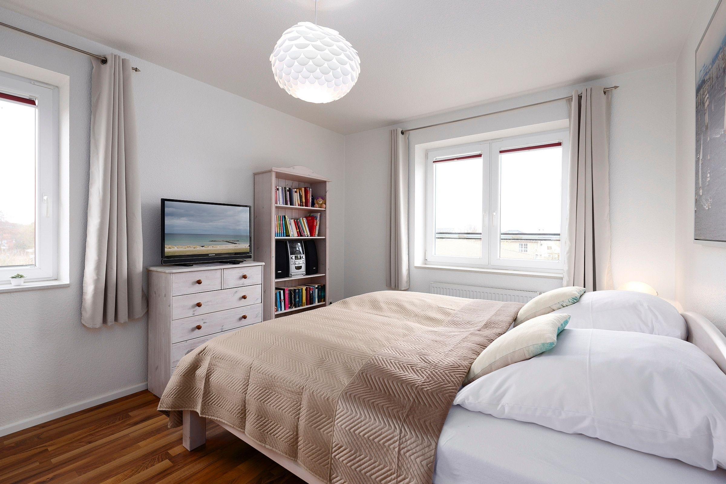 Schlafzimmer 2: 1 Doppelbett (2x 90x200 cm), TV, Kleiderschrank, Verdunkelung: Plissees, Gardinen