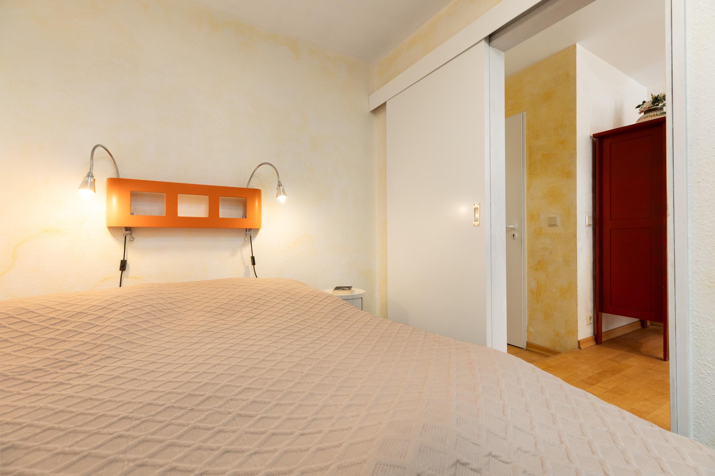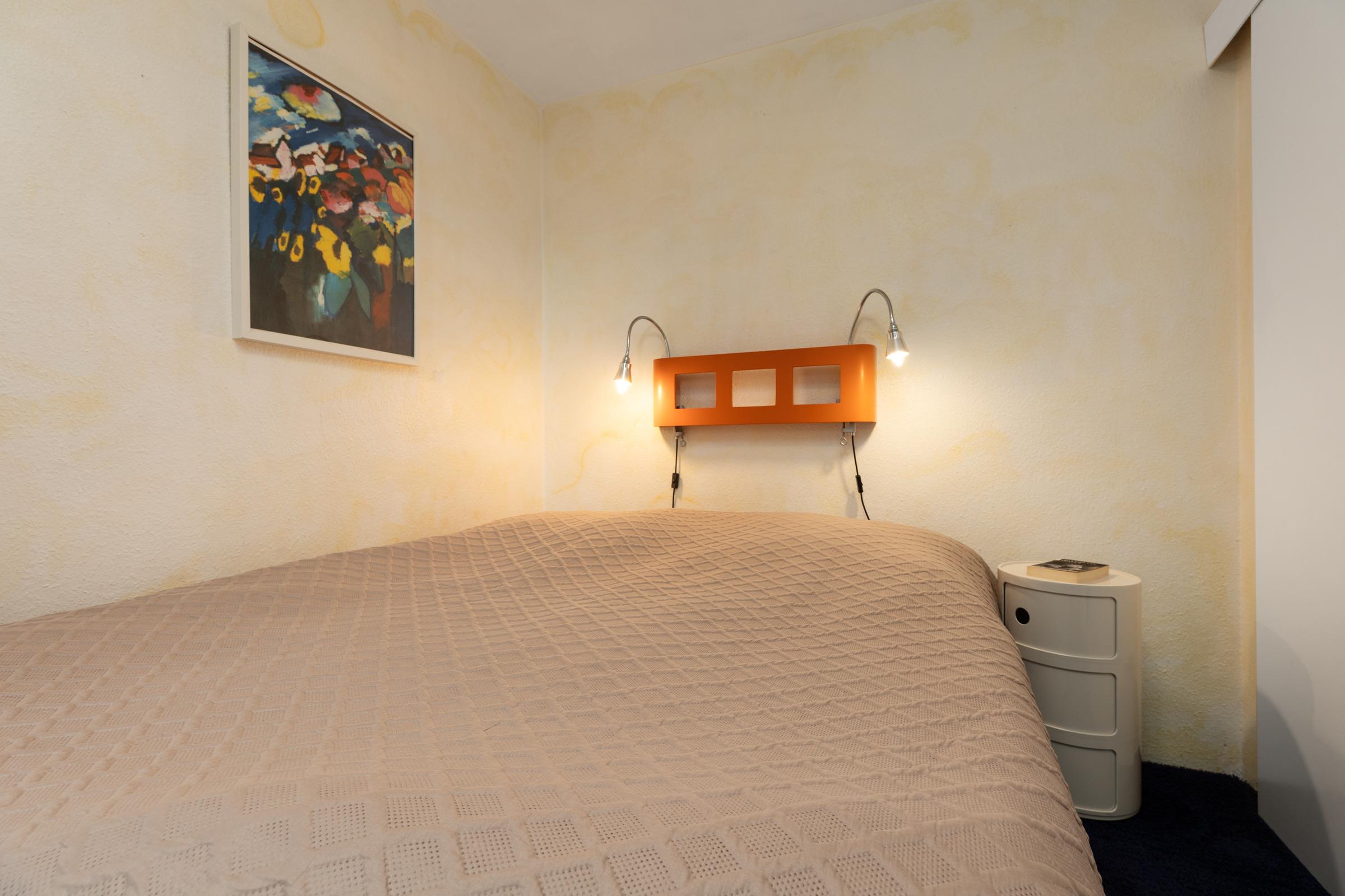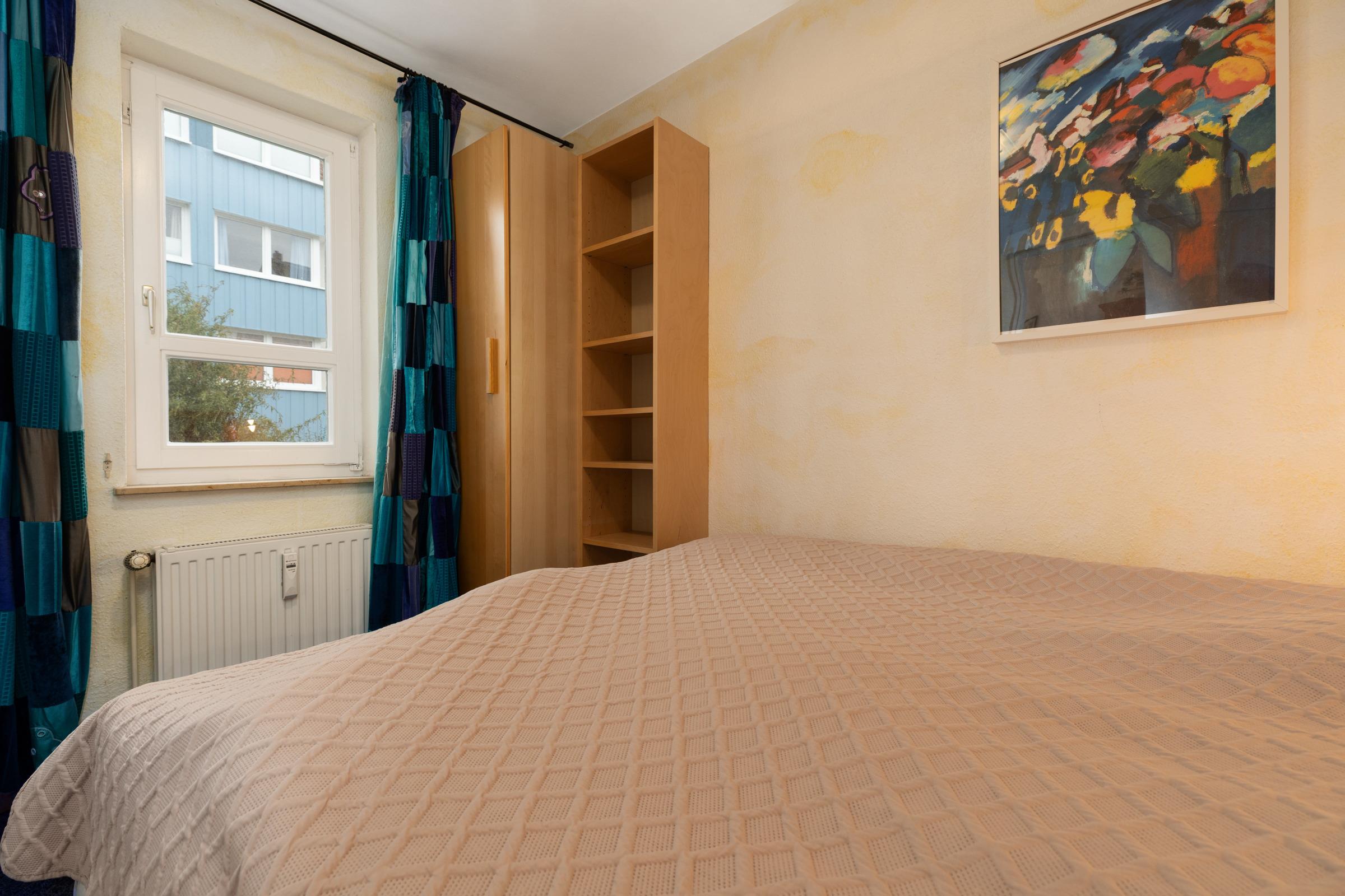 Schlafzimmer: 1 Boxspringdoppelbett (160x190 cm), Kleiderschrank, Verdunkelung: Gardine, kein Platz für ein Babybett vorhanden