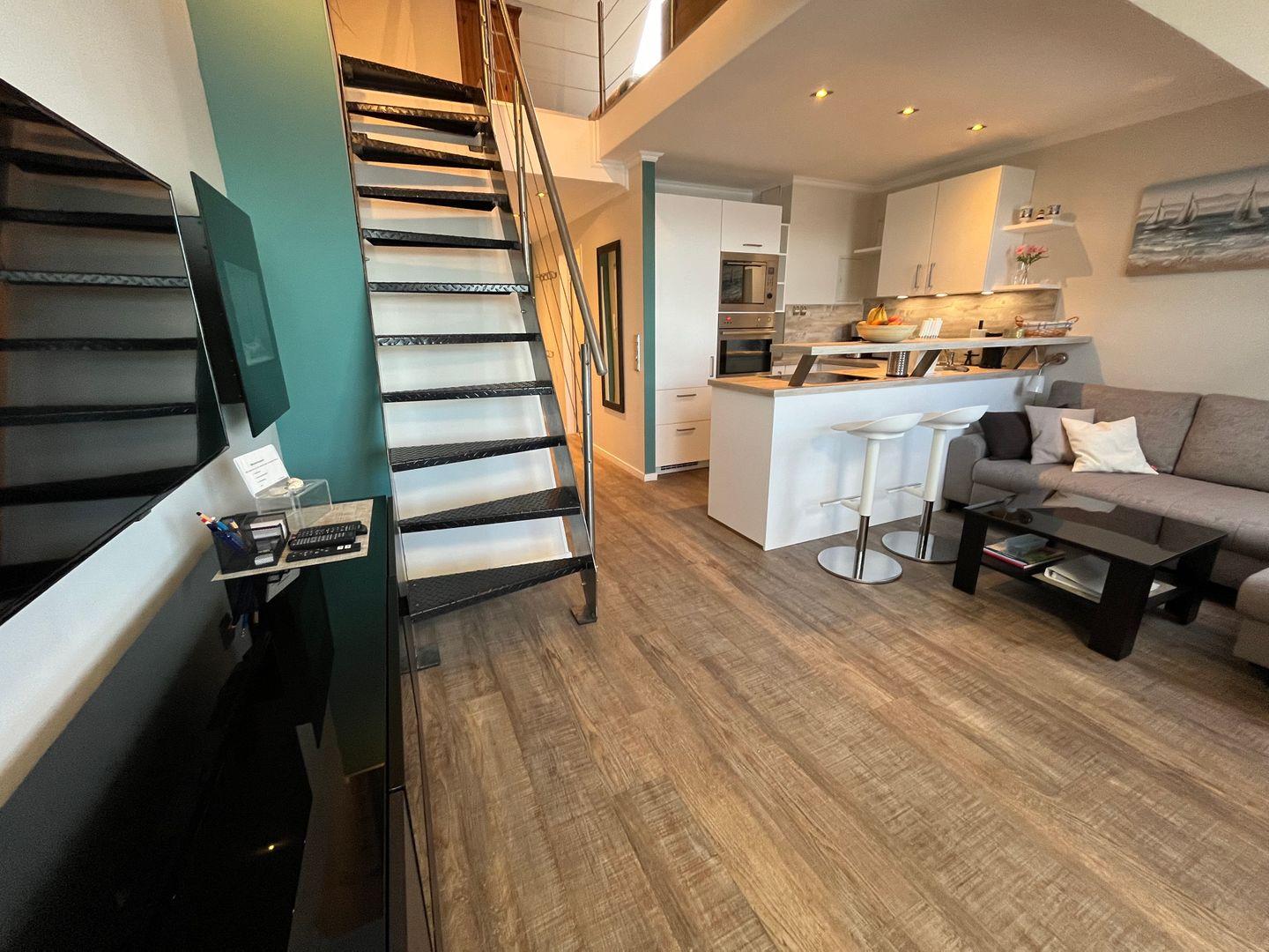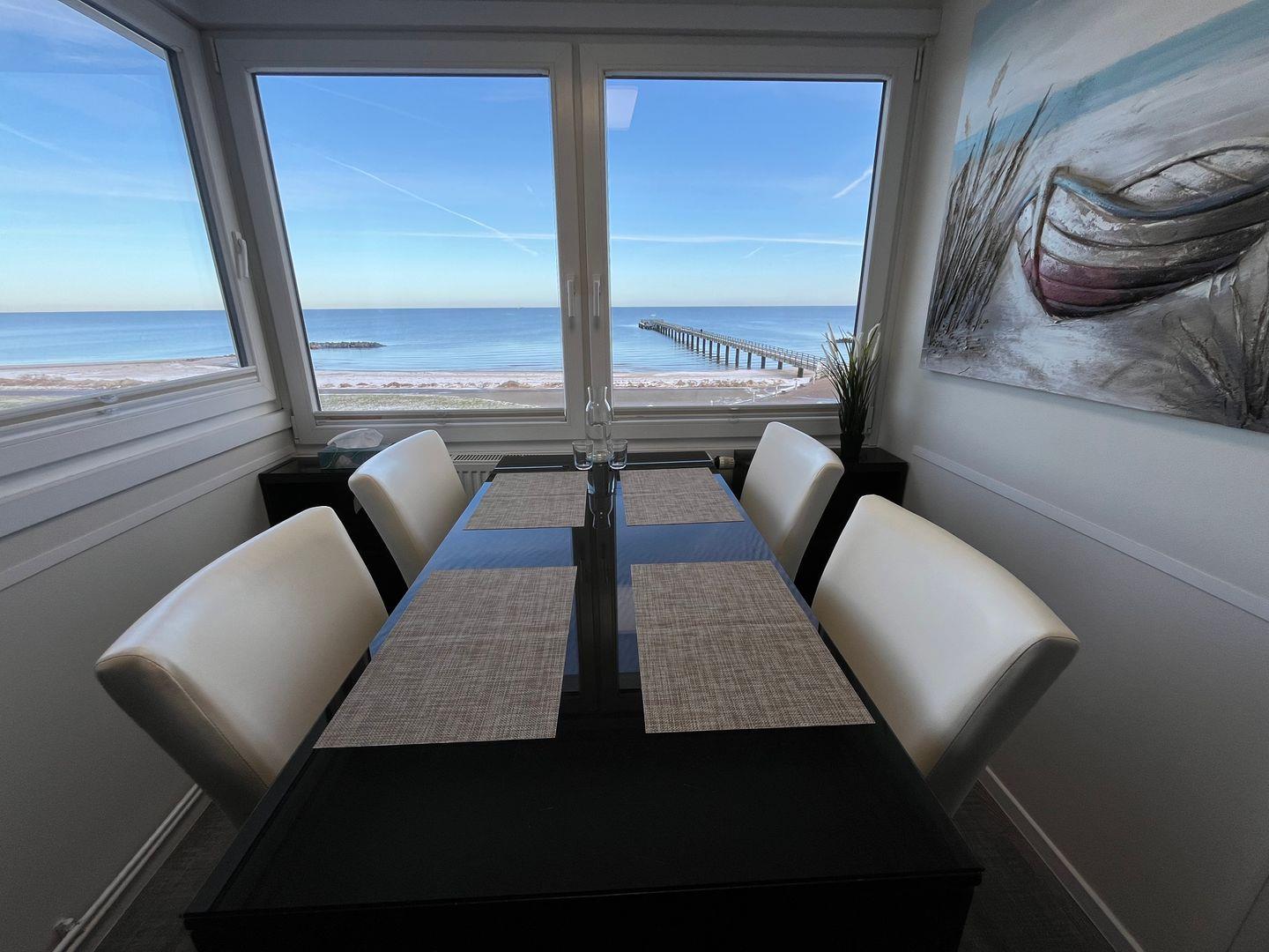Moderne Ferienwohnung Ostseefee mit WLAN-Internet, Kamin (Elektro) und Infrarotsauna am Schönberger Strand mit direktem Meerblick aus 1. Reihe auf die 40 m entfernte Ostsee und mit Blick auf die Schönberger Seebrücke. Aus Ihrem Logenplatz im 3. Stock können Sie z. B. Schiffen beim Auslaufen aus der Kieler Bucht zusehen oder Surfer und Wellenreiter beobachten. 2 Schlafzimmer, 1 Bad. Für max. 4 Personen.