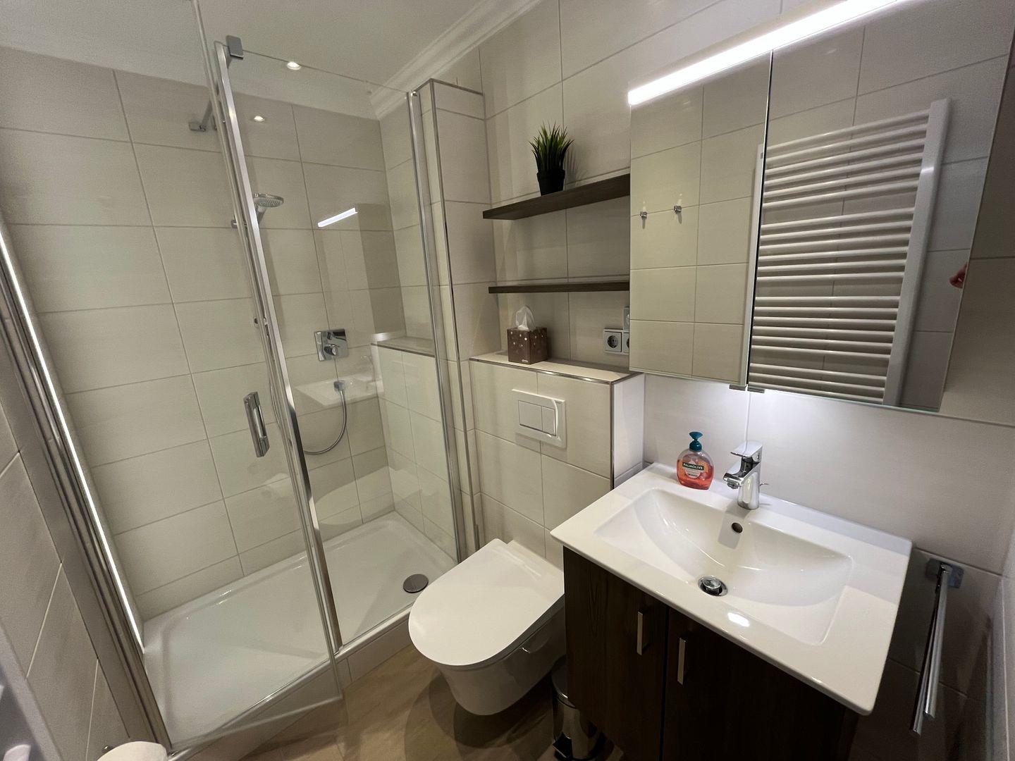 Das Badezimmer (renoviert Ende 2023) ist mit einer erfrischenden Dusche, einem WC und einem Waschbecken mit Unterschrank sowie einem Spiegelschrank ausgestattet, so dass Sie sich jeden Morgen und Abend rundum wohlfühlen können.