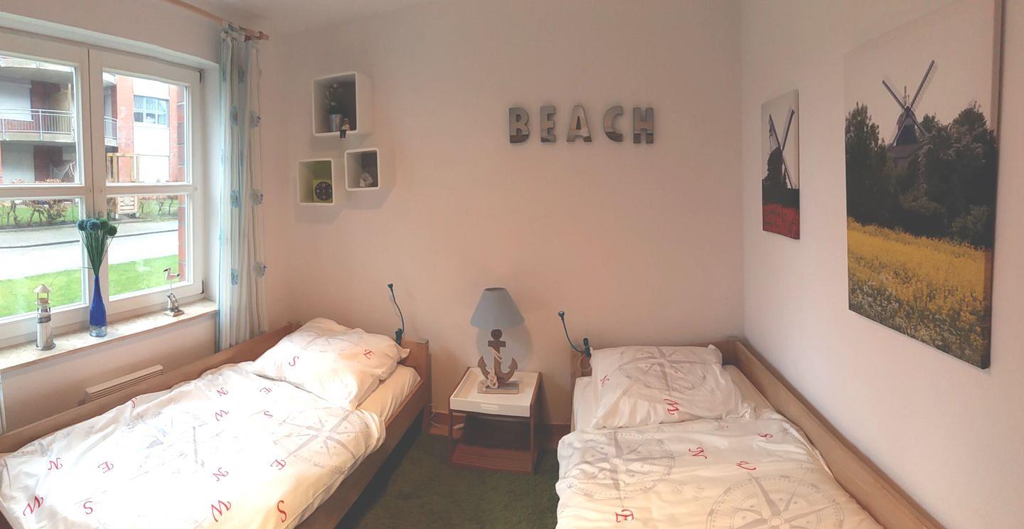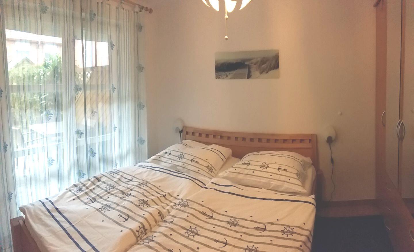 Die zwei Schlafzimmer bieten ausreichend Platz für erholsame Nächte. Im ersten Schlafzimmer erwartet Sie ein gemütliches Doppelbett mit zwei Matratzen, ideal für einen erholsamen Schlaf. Ein großer Kleiderschrank bietet ausreichend Stauraum für Ihre Kleidung. Von hier aus gelangen Sie direkt in den liebevoll gestalteten Garten, wo Sie den Tag mit einer Tasse Kaffee im Freien beginnen können. Das zweite Schlafzimmer verfügt über zwei Einzelbetten, die ebenfalls für erholsame Nächte sorgen. Auch hier finden Sie einen geräumigen Kleiderschrank, um Ihre persönlichen Dinge unterzubringen.