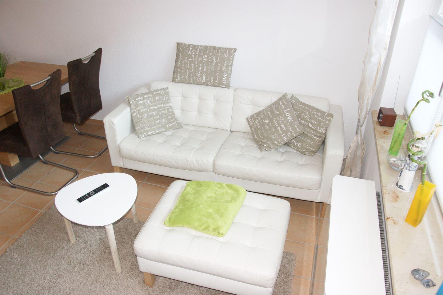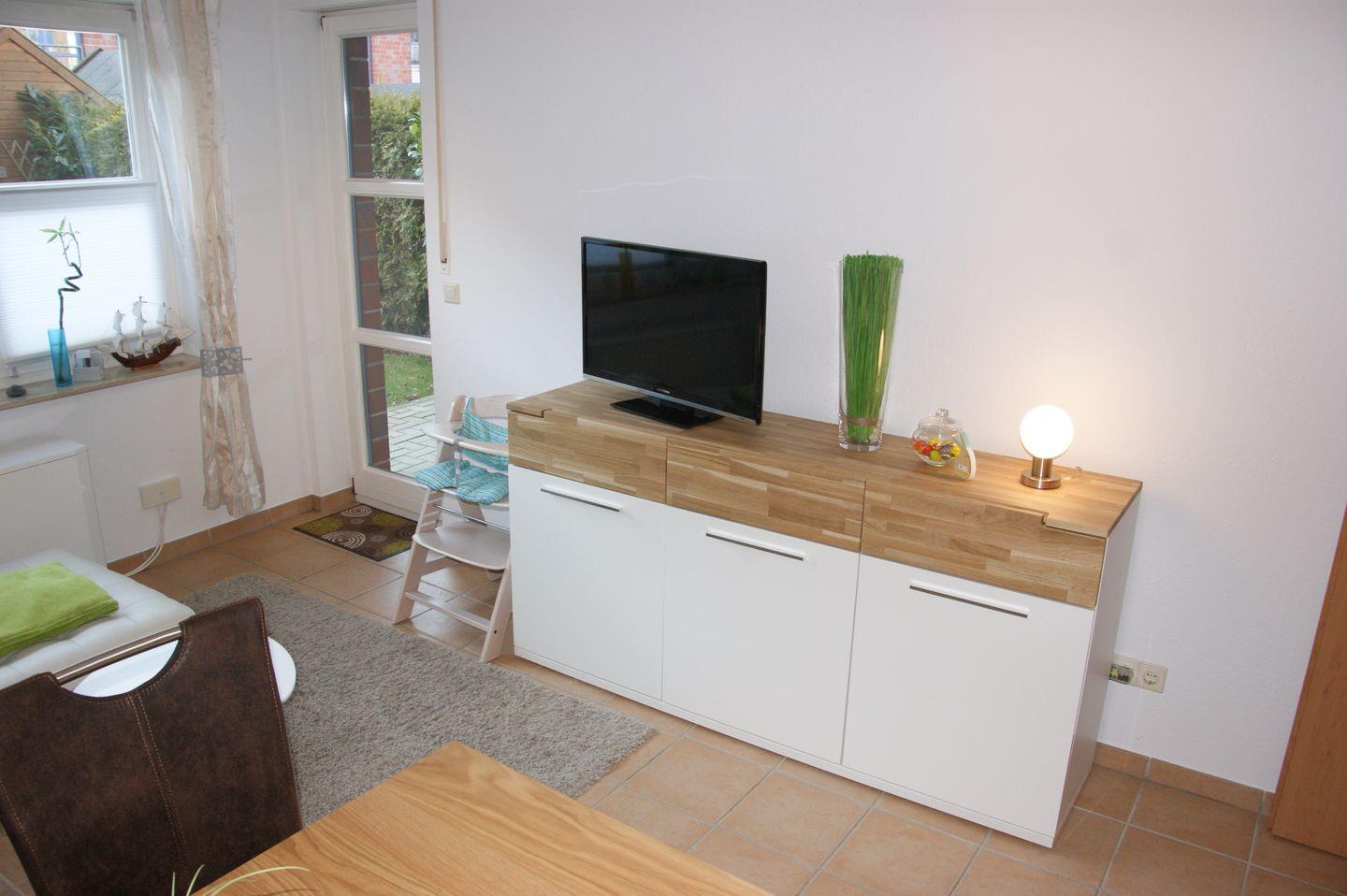 Das Wohnzimmer lädt zum Verweilen ein. Nehmen Sie Platz auf dem bequemen Sofa und entspannen Sie sich. Ein Sideboard bietet Stauraum für Ihre persönlichen Gegenstände, und ein Flachbildfernseher steht bereit, um Ihnen unterhaltsame Stunden zu bieten. Auch ein Radio/CD-Player und ein DVD-Player/Rekorder sind vorhanden, damit Sie Ihre Lieblingsmusik hören oder einen Filmabend veranstalten können. Vom Wohnzimmer aus gelangen Sie direkt auf die Terrasse, wo Sie die frische Meeresluft genießen können.