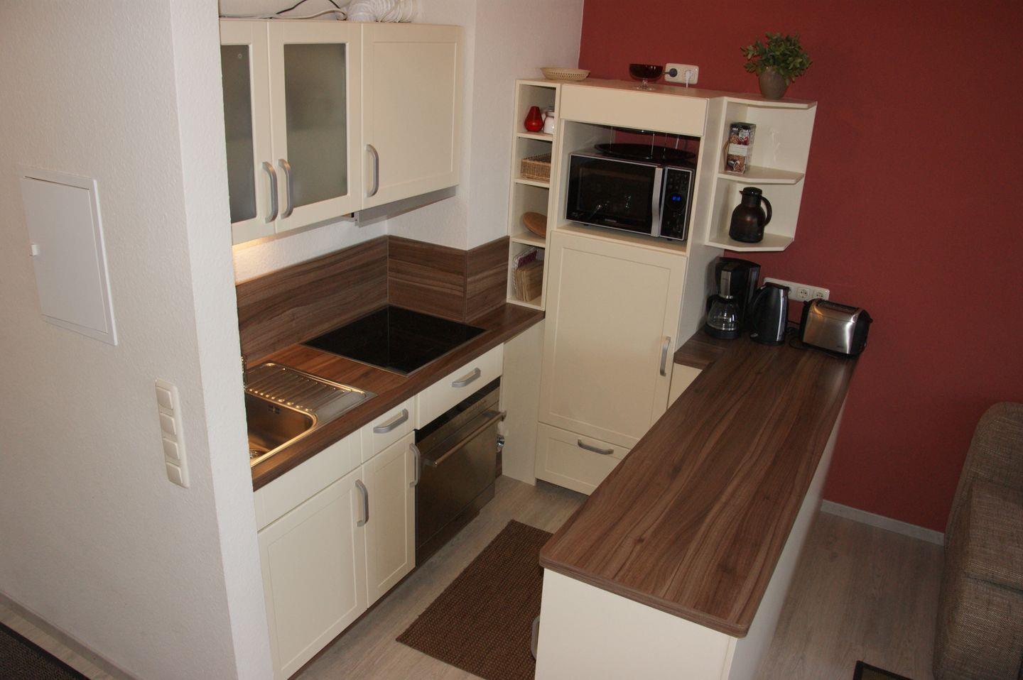 Die offene Küche ist komplett eingerichtet und lässt das Herz eines jeden Hobbykochs höherschlagen. Sie finden hier alles, was Sie benötigen, um köstliche Mahlzeiten zuzubereiten: eine Mikrowelle mit Grill- und Umluftfunktion, ein Cerankochfeld, ein Geschirrspüler, eine Kaffeemaschine, ein Kühlschrank mit Gefrierfach, ein Mikrowellenherd mit Grill- und Umluftfunktion, ein Wasserkocher, ein Toaster und eine Dunstabzugshaube. Egal, ob Sie ein romantisches Dinner zu zweit planen oder Ihre Familie verwöhnen möchten, diese Küche bietet Ihnen alle Möglichkeiten.