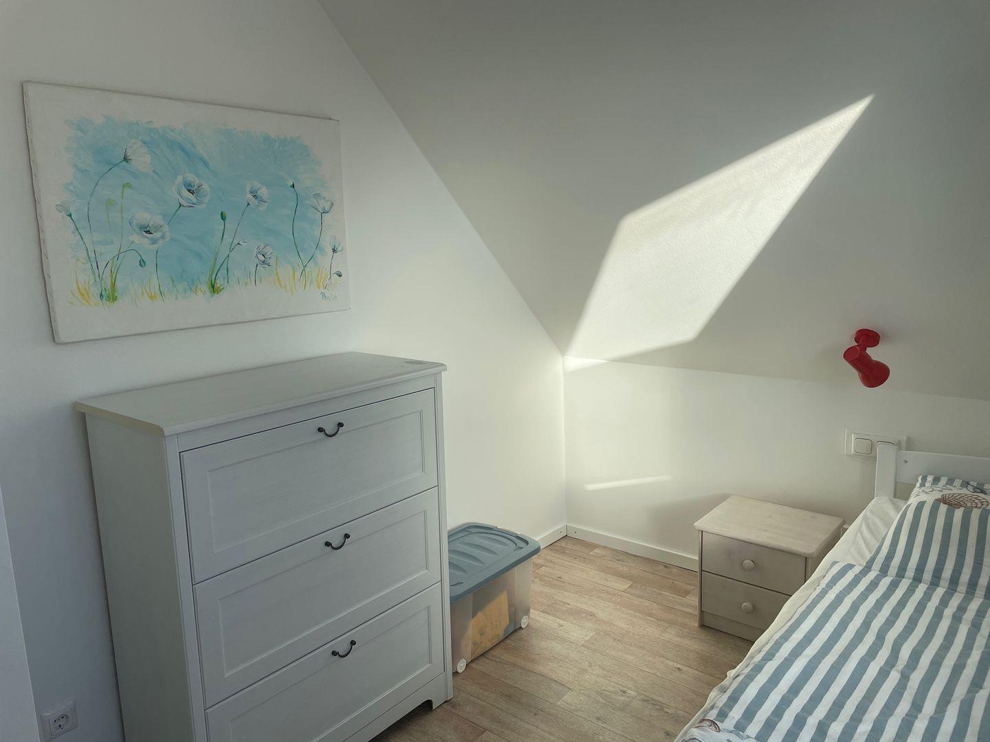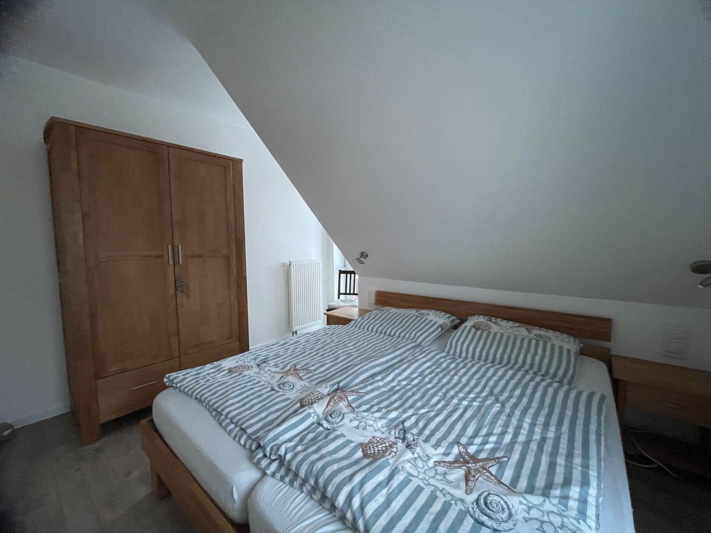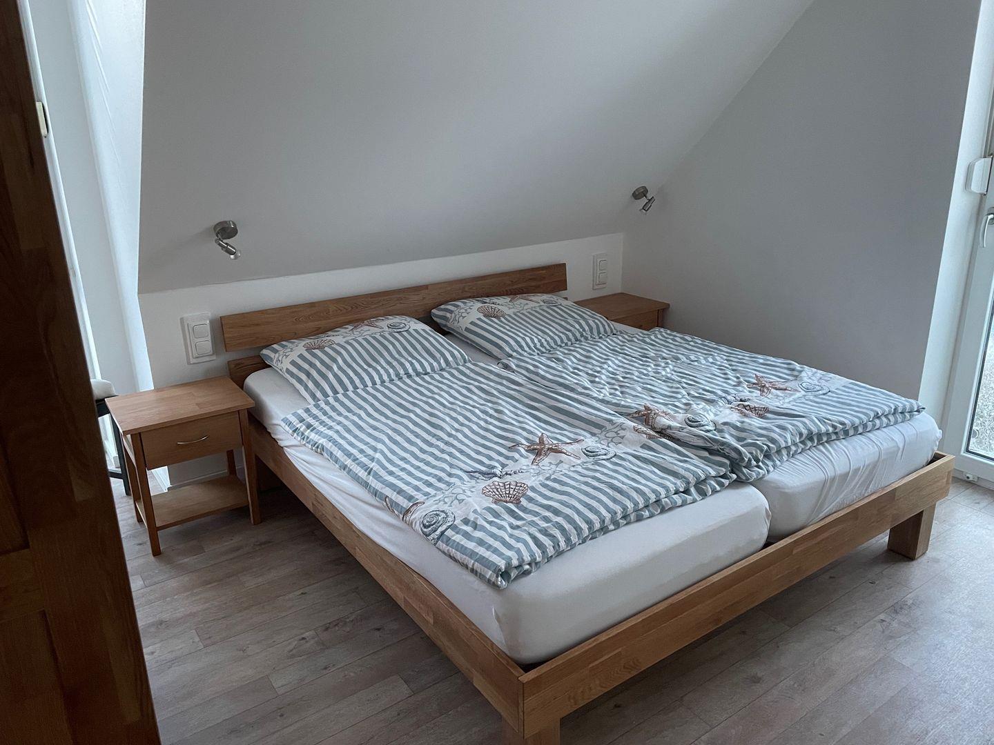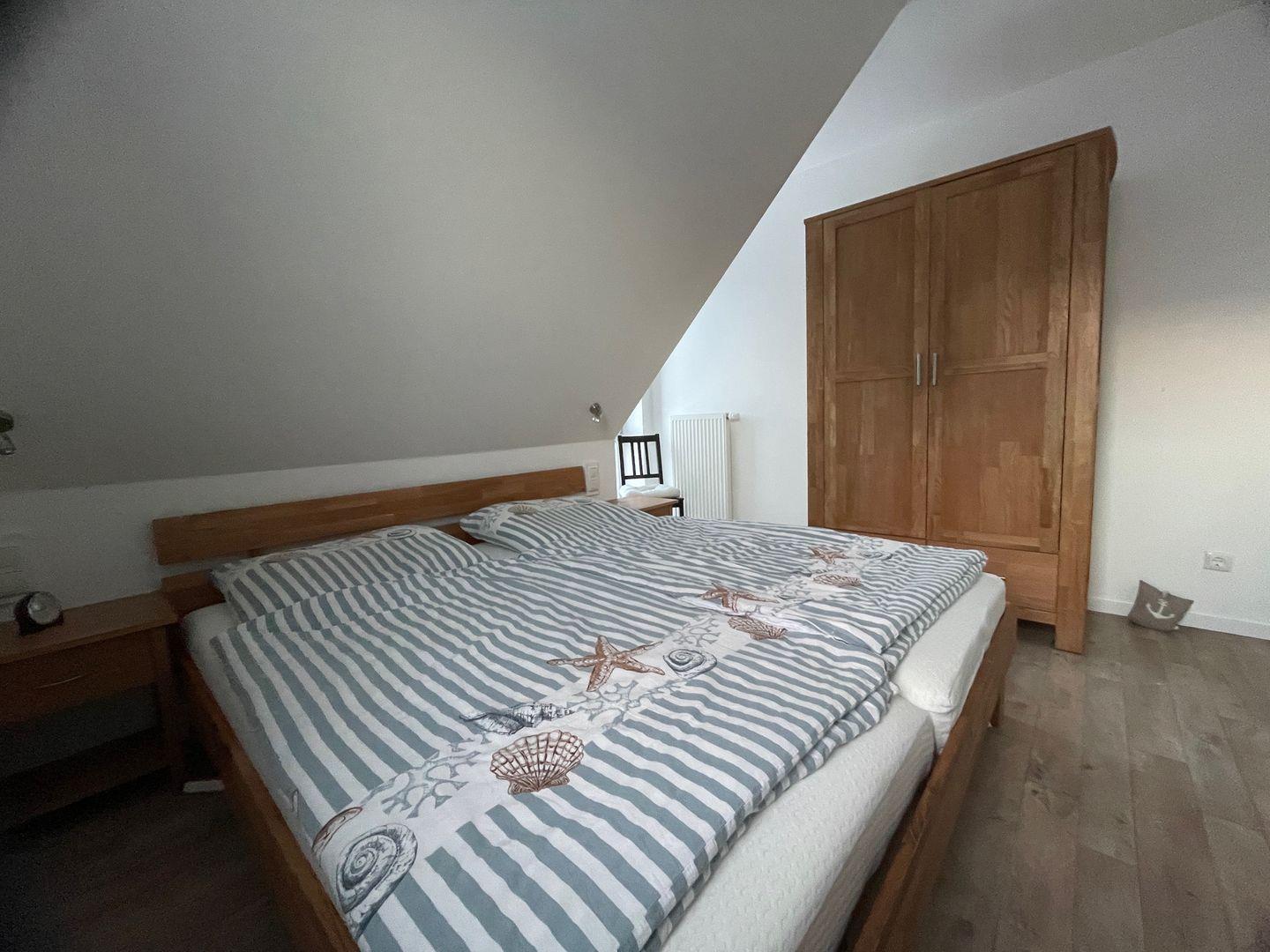 Insgesamt verfügt das Haus über drei gemütliche Schlafzimmer, die Ihnen einen erholsamen Schlaf bieten. Im ersten Schlafzimmer im Obergeschoss erwartet Sie ein komfortables Doppelbett mit einer Größe von 1,80 m. Hier finden Sie auch einen geräumigen Kleiderschrank und eine Außenjalousie, die Ihnen den Raum nach Bedarf abdunkeln lässt. Das zweite Schlafzimmer bietet ebenfalls ein großes Doppelbett und die gleichen Annehmlichkeiten wie das erste. Im dritten Schlafzimmer steht Ihnen ein Einzelbett zur Verfügung, das bei Bedarf zu einem Doppelbett erweitert werden kann. Eine Kommode und eine Außenjalousie runden die Ausstattung ab.