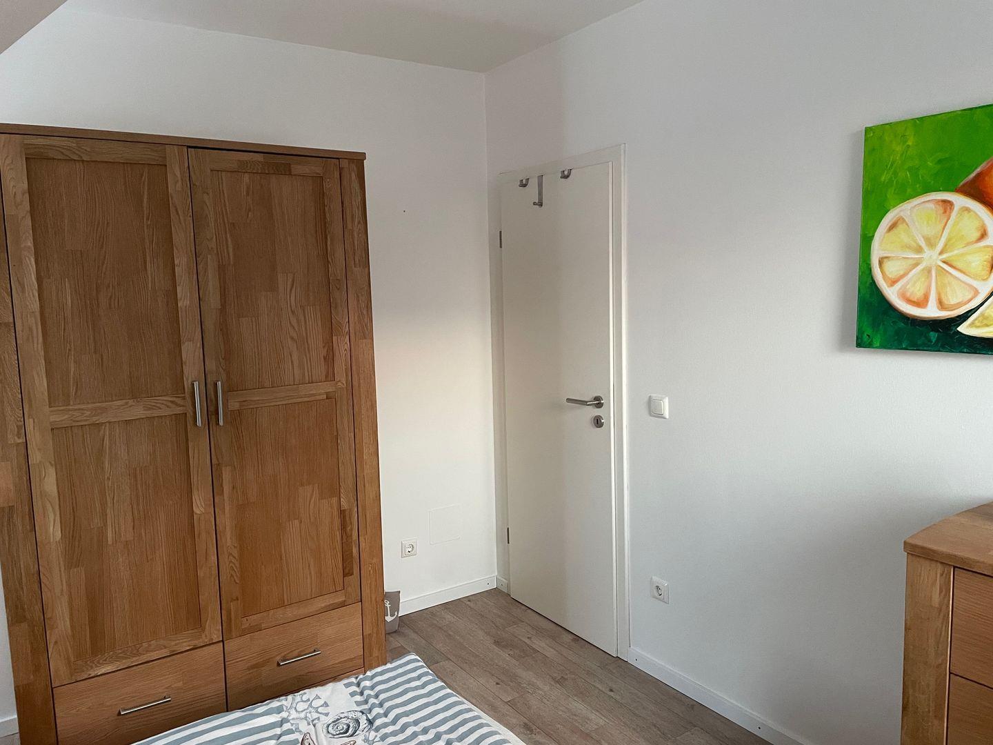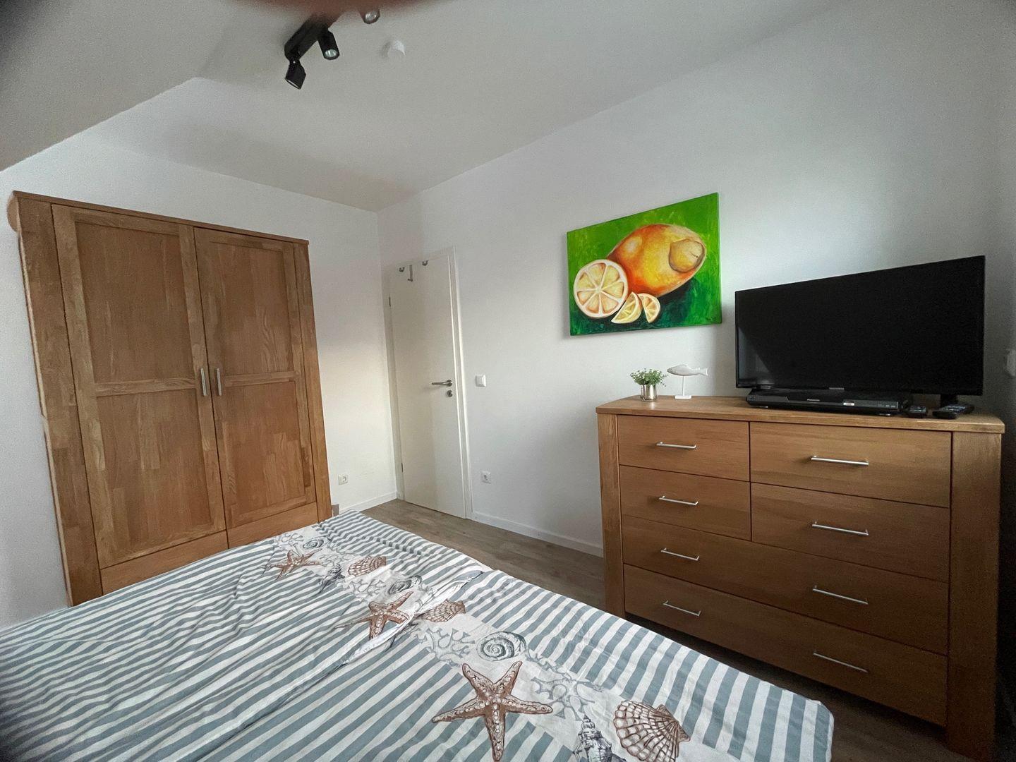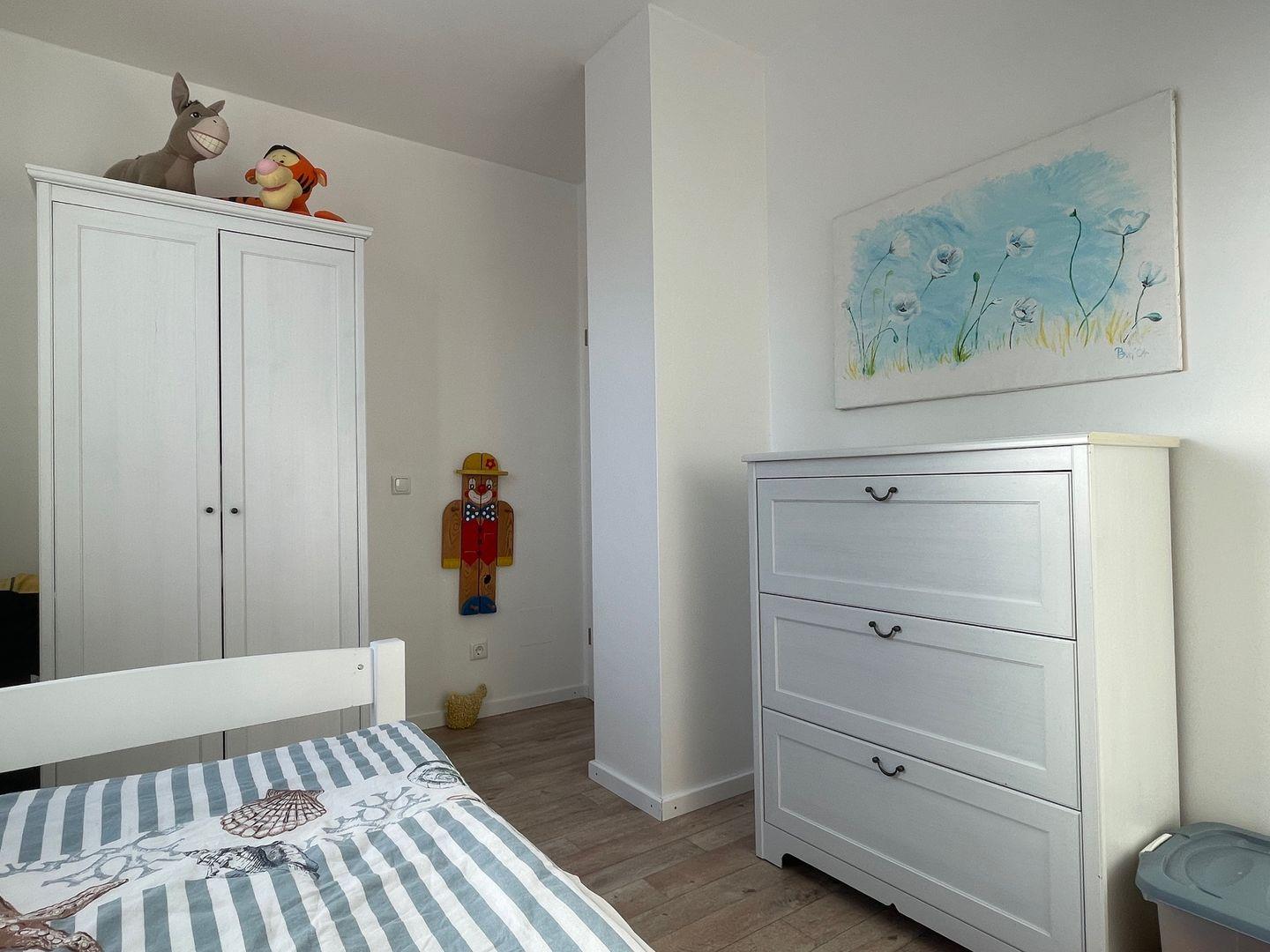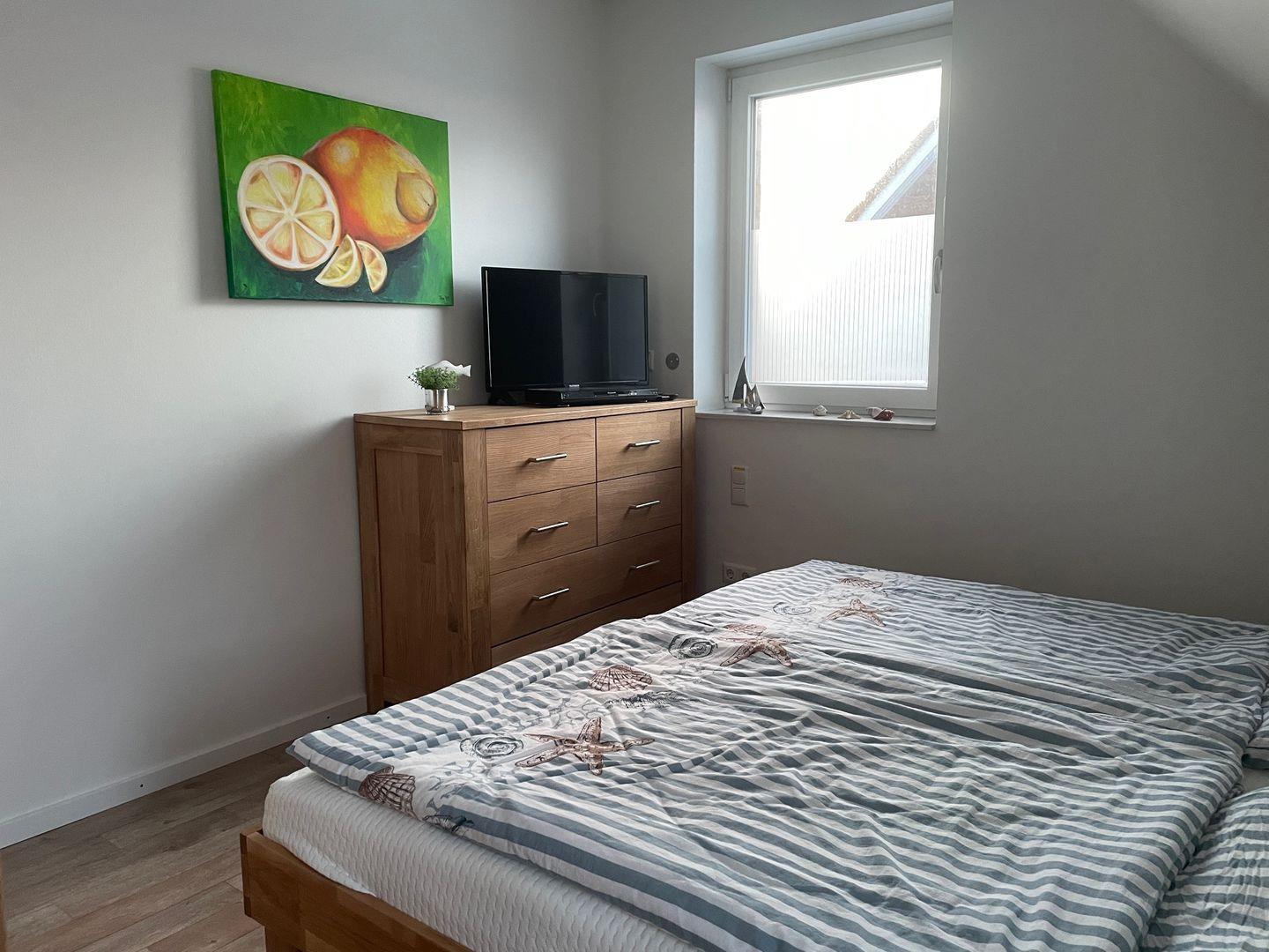 Insgesamt verfügt das Haus über drei gemütliche Schlafzimmer, die Ihnen einen erholsamen Schlaf bieten. Im ersten Schlafzimmer im Obergeschoss erwartet Sie ein komfortables Doppelbett mit einer Größe von 1,80 m. Hier finden Sie auch einen geräumigen Kleiderschrank und eine Außenjalousie, die Ihnen den Raum nach Bedarf abdunkeln lässt. Das zweite Schlafzimmer bietet ebenfalls ein großes Doppelbett und die gleichen Annehmlichkeiten wie das erste. Im dritten Schlafzimmer steht Ihnen ein Einzelbett zur Verfügung, das bei Bedarf zu einem Doppelbett erweitert werden kann. Eine Kommode und eine Außenjalousie runden die Ausstattung ab.