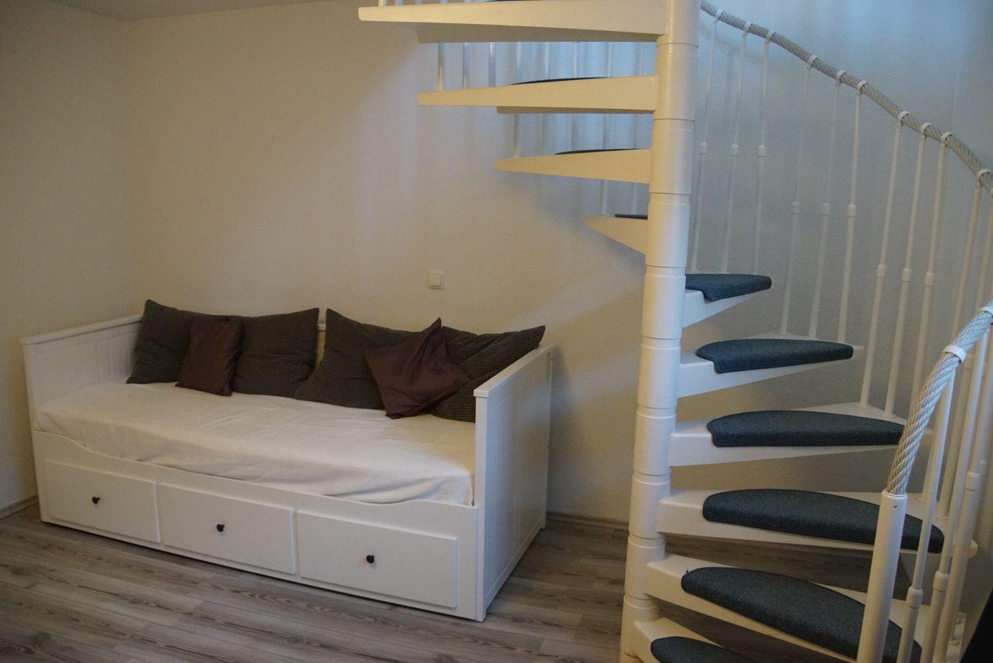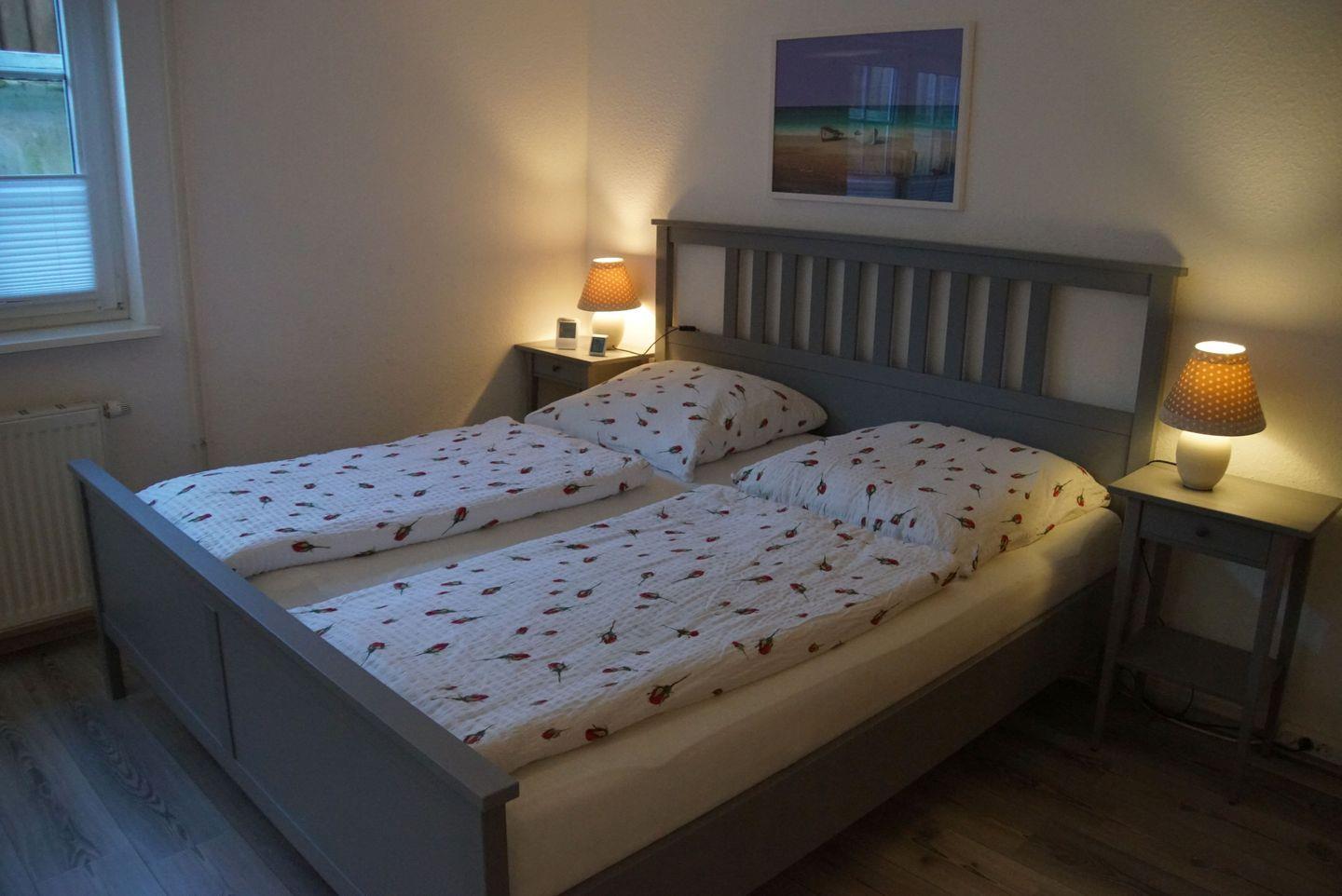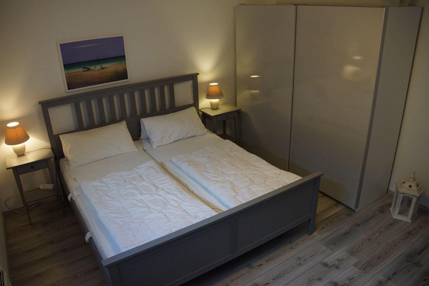 Der Schlafbereich im Souterrain erwartet Sie mit gemütlichen Betten und einem großzügigen Kleiderschrank. Das Doppelbett, bestehend aus zwei Matratzen in den Maßen 1,80 x 2 m, verspricht erholsame Nächte und süße Träume. Bei Bedarf kann das Einzelbett leicht in ein zusätzliches Doppelbett umgewandelt werden. Hier finden Sie ausreichend Platz für Ihre Kleidung und persönlichen Gegenstände, sodass Sie sich wie zu Hause fühlen können.