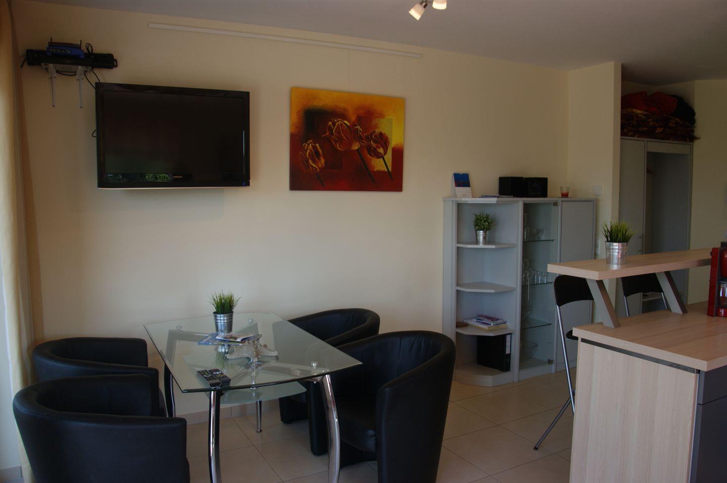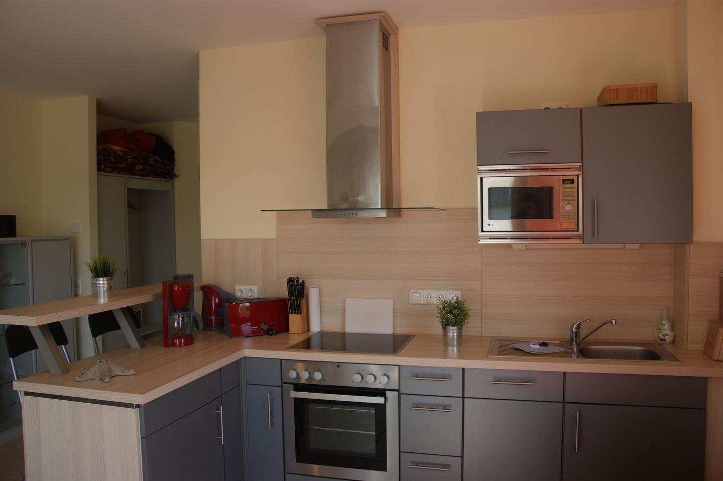 Die Ferienwohnung besteht aus einem hellen und freundlichen Wohnzimmer, das offen zur modernen Küche gestaltet ist. Hier finden Sie alle notwendigen Geräte wie Kühlschrank, Spülmaschine, Mikrowelle und einen Herd mit Ceranfeld. So steht einem gemütlichen Kochabend mit der Familie oder Freunden nichts im Wege. Ein Esstisch und Sofaecke laden zum geselligen Beisammensein ein. Zwei Fernseher sorgen dafür, dass jeder die Möglichkeit hat, seine Lieblingssendungen zu genießen – ideal, wenn Sie nach einem aktiven Tag einfach mal entspannen möchten.