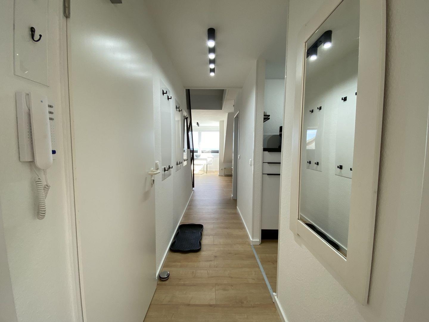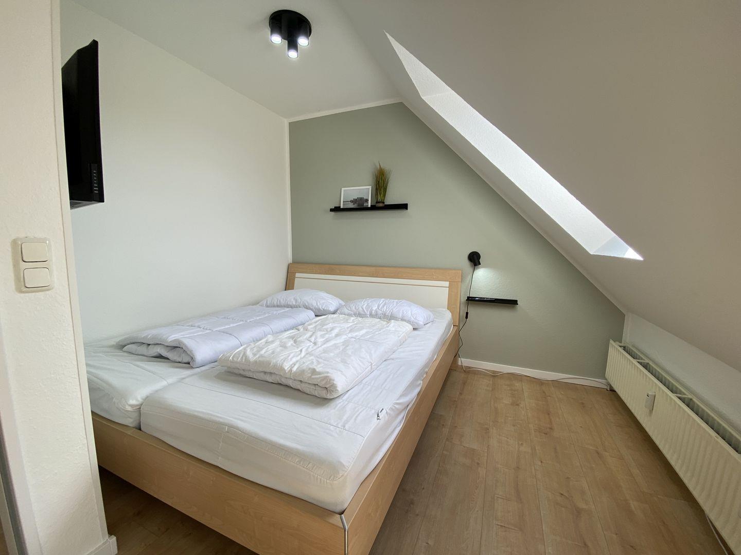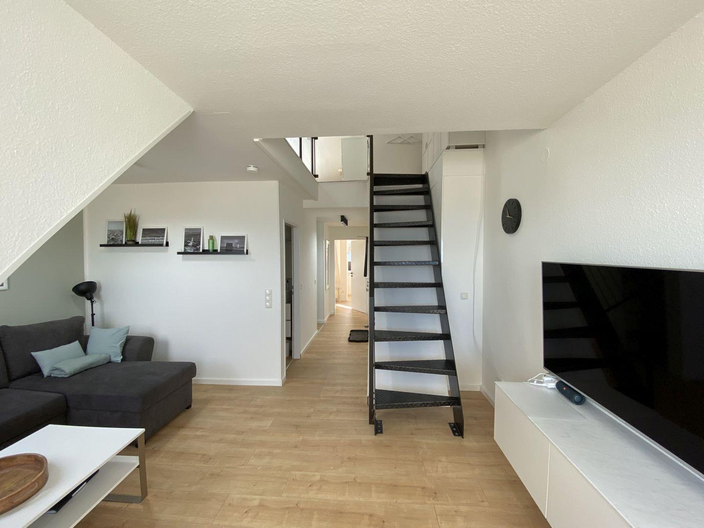 Die Ferienwohnung besteht aus insgesamt drei Zimmern, darunter zwei behagliche Schlafzimmer, die mit liebevollen Details und ausreichend Stauraum ausgestattet sind. Ein helles und einladendes Wohnzimmer bietet mit einer gemütlichen Sofaecke viel Platz zum Entspannen, Spielen oder einfach zum gemeinsamen Verweilen. Ein Esstisch lädt zu gemeinsamen Mahlzeiten ein, die Sie in der gut ausgestatteten Kochnische zubereiten können. Hier finden Sie alles, was Sie für einen kulinarischen Abend benötigen, von der Spülmaschine über den Herd bis zur Mikrowelle.