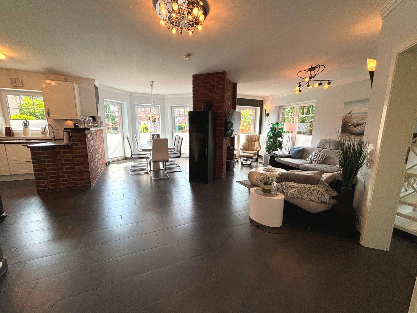 Die möblierte, blickgeschützte Terrasse ist der perfekte Ort, um in Ruhe die frische Luft zu genießen. Hier finden Sie einen gemütlichen Strandkorb, in dem Sie entspannen können, während die Kinder sich im großen Garten austoben. Eine Sandkiste und eine Schaukel bieten zusätzlichen Spielspaß für die Kleinen.