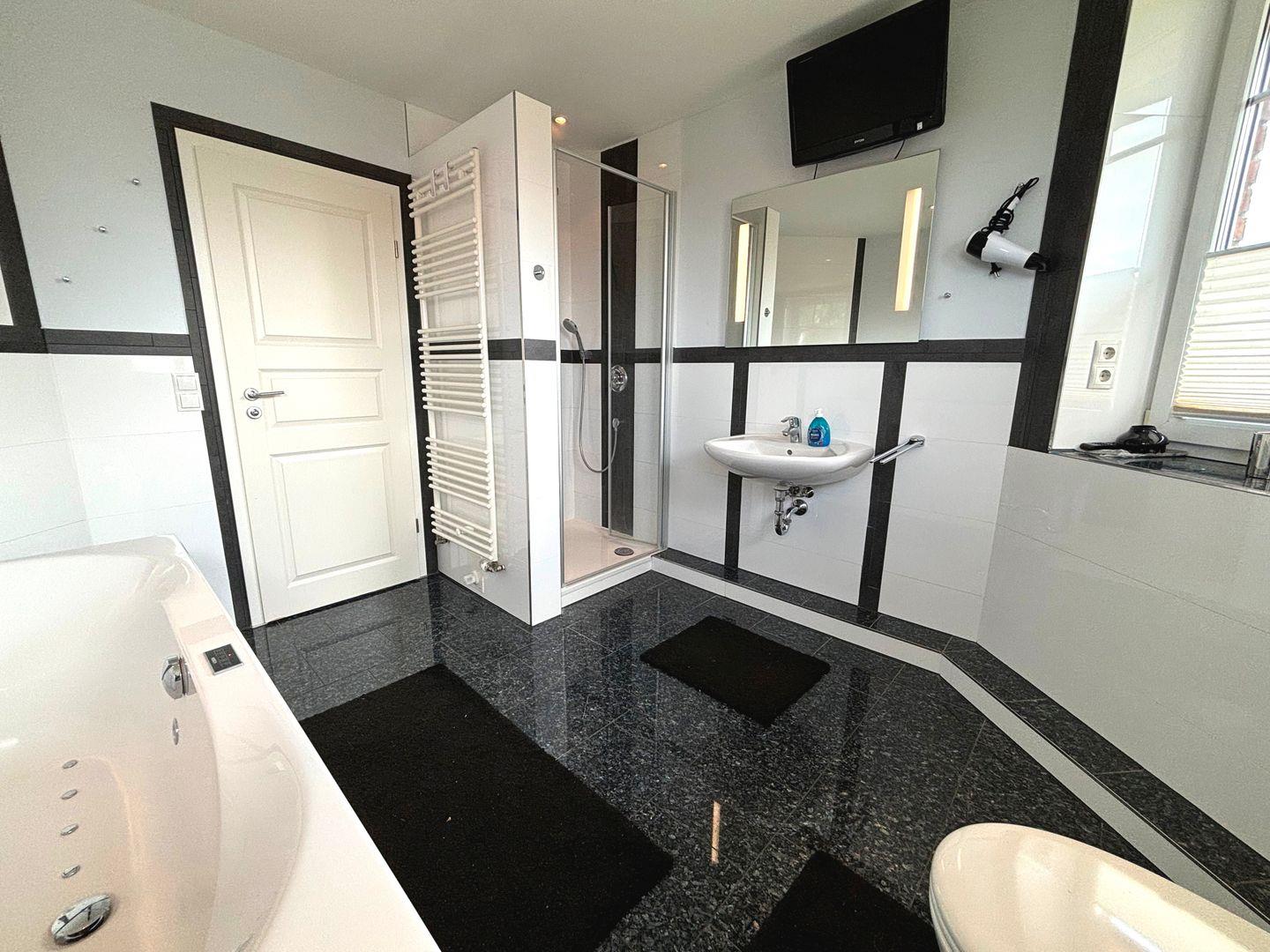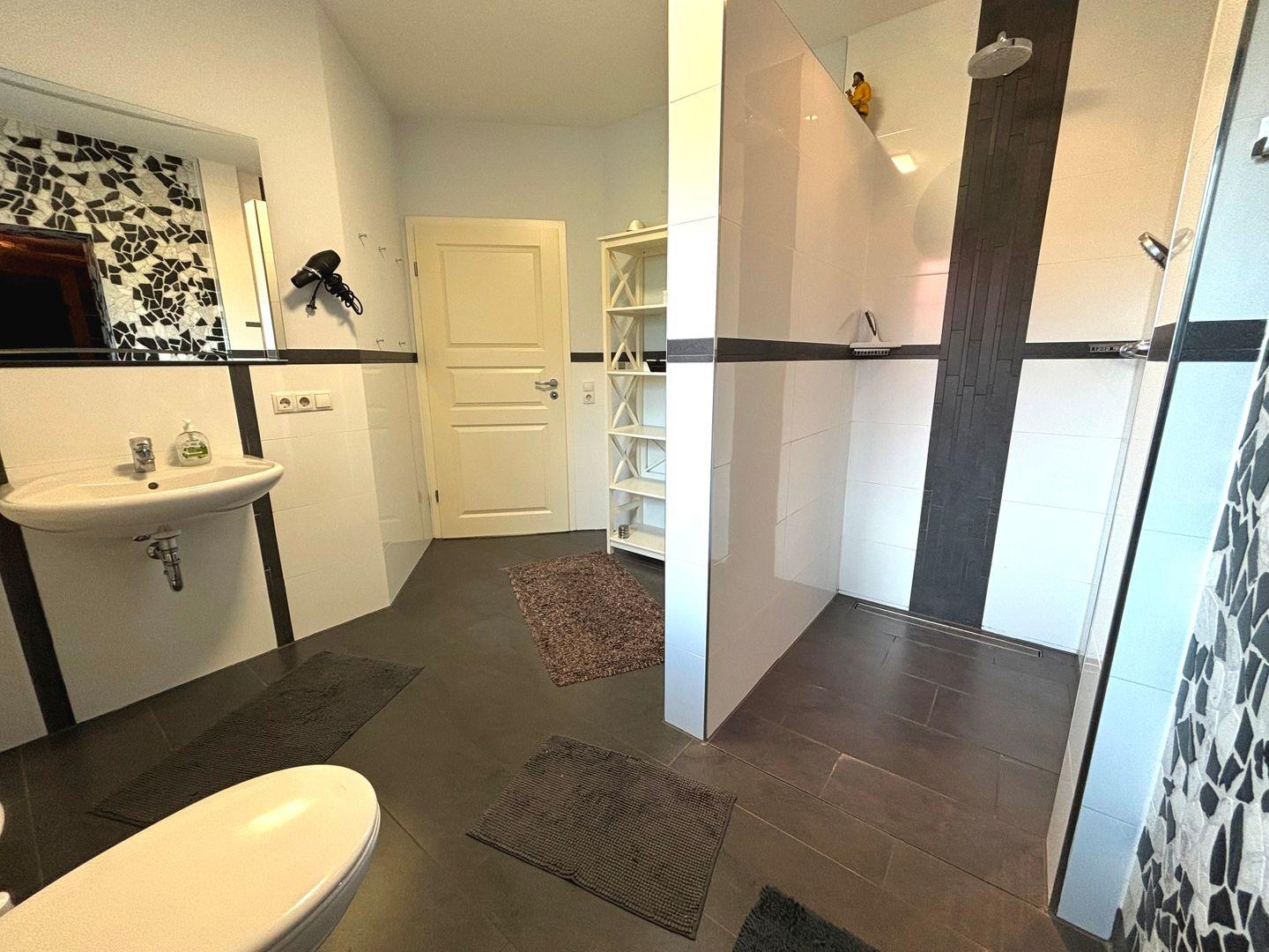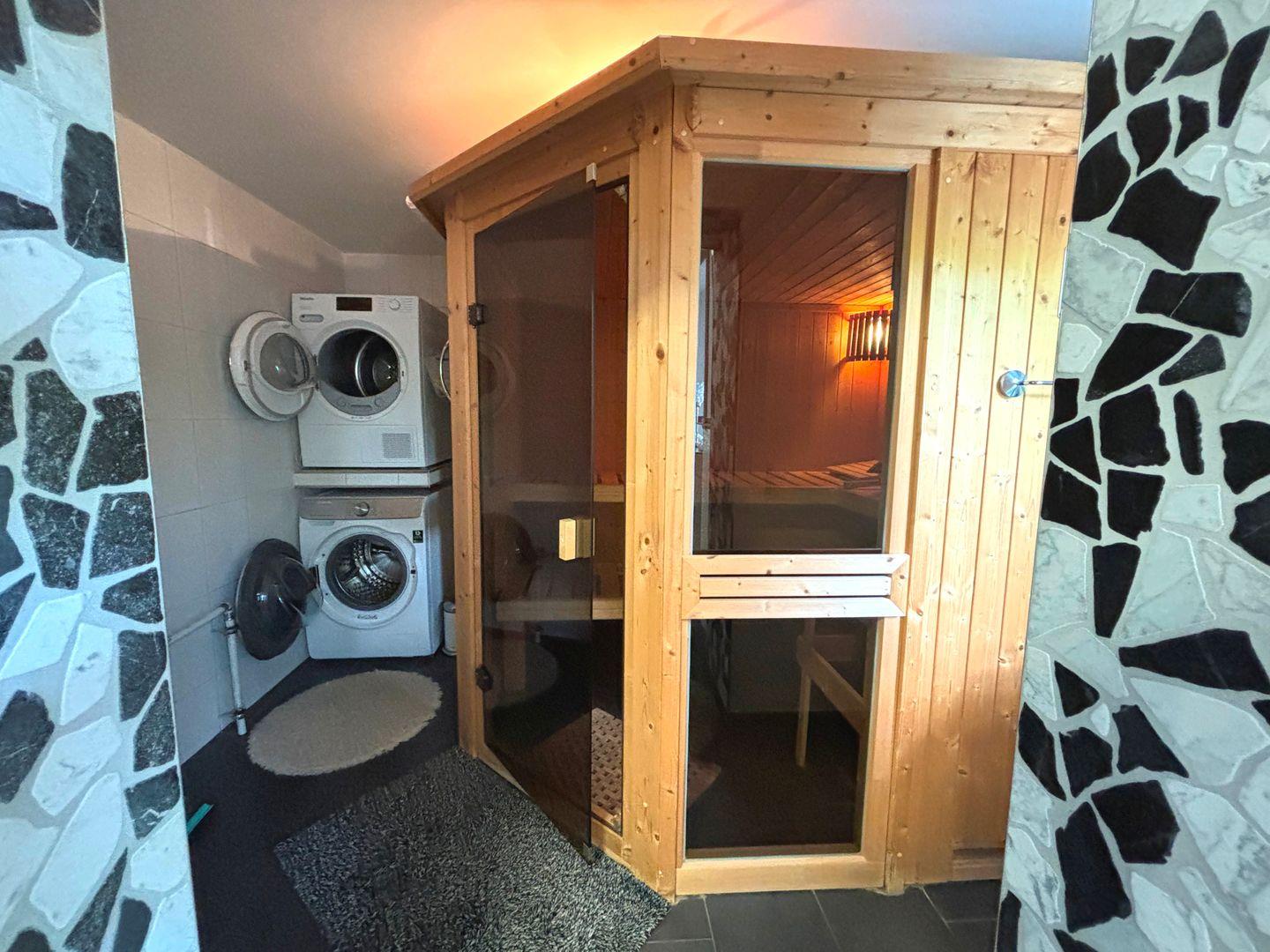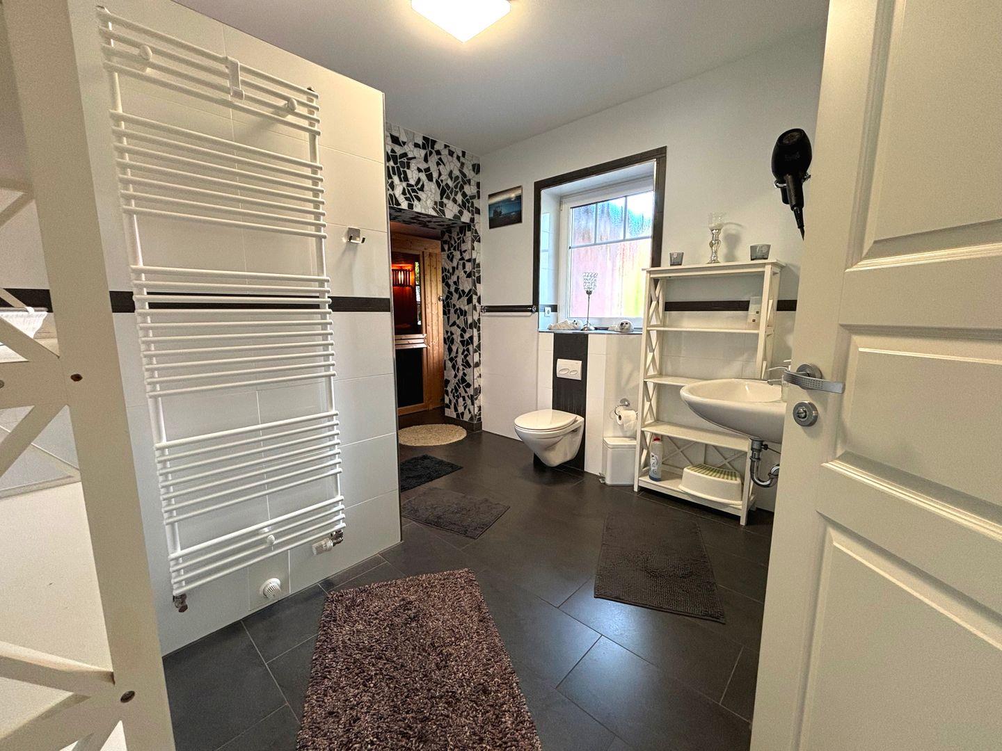 Das Ferienhaus verfügt über zwei Badezimmer: Im Erdgeschoss finden Sie ein modernes Badezimmer mit angrenzender Sauna sowie Waschmaschine und Trockner. Im Obergeschoss erwartet Sie ein weiteres Badezimmer mit einer einladenden Badewanne – ideal für entspannende Stunden.