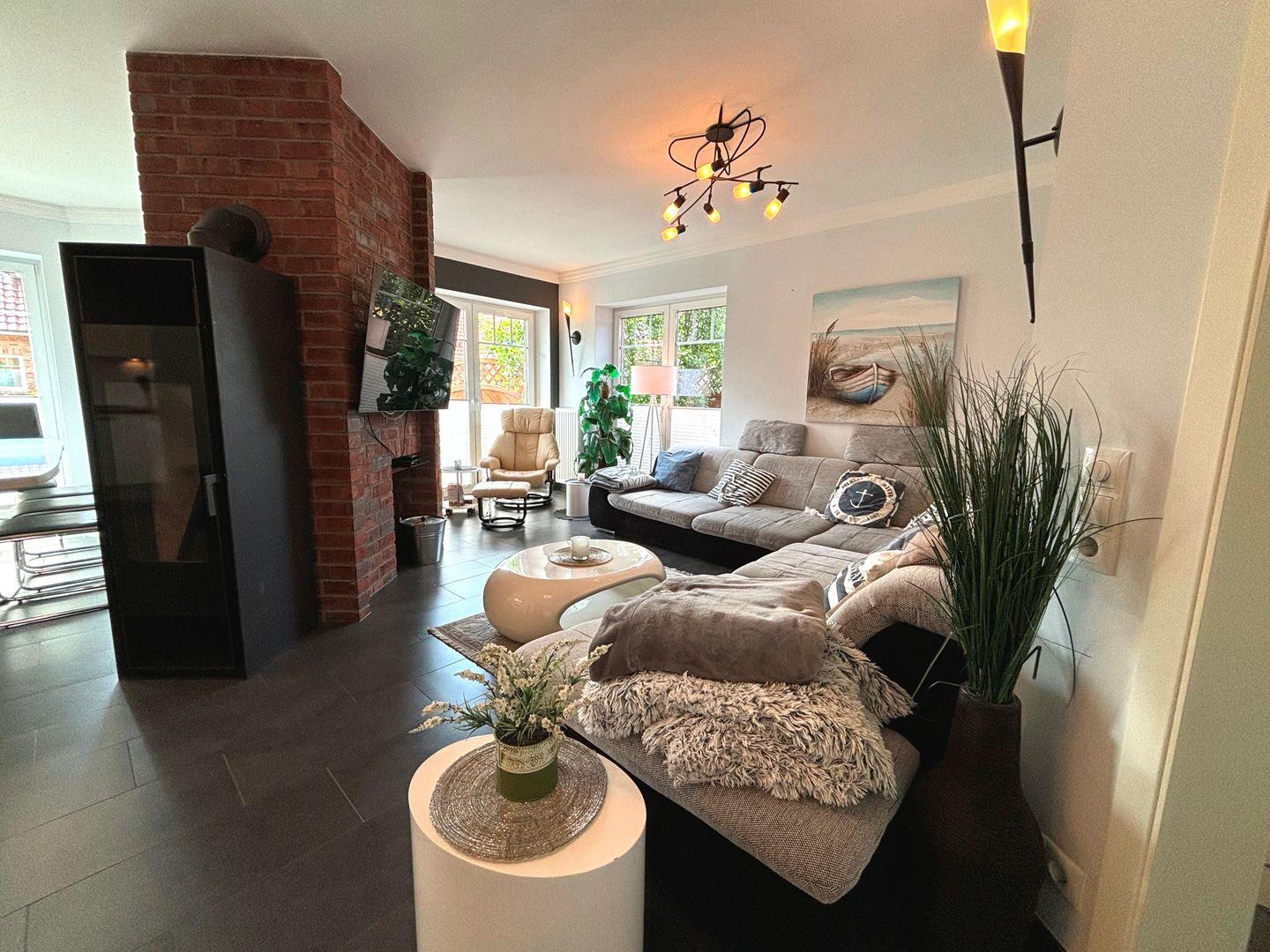 Im gemütlichen Wohnzimmer finden Sie ein Sofa, einen Relaxsessel, einen Tisch und einen Fernseher. Der Kamin sorgt an kühleren Tagen für eine behagliche Atmosphäre und lädt zu entspannten Abenden ein.