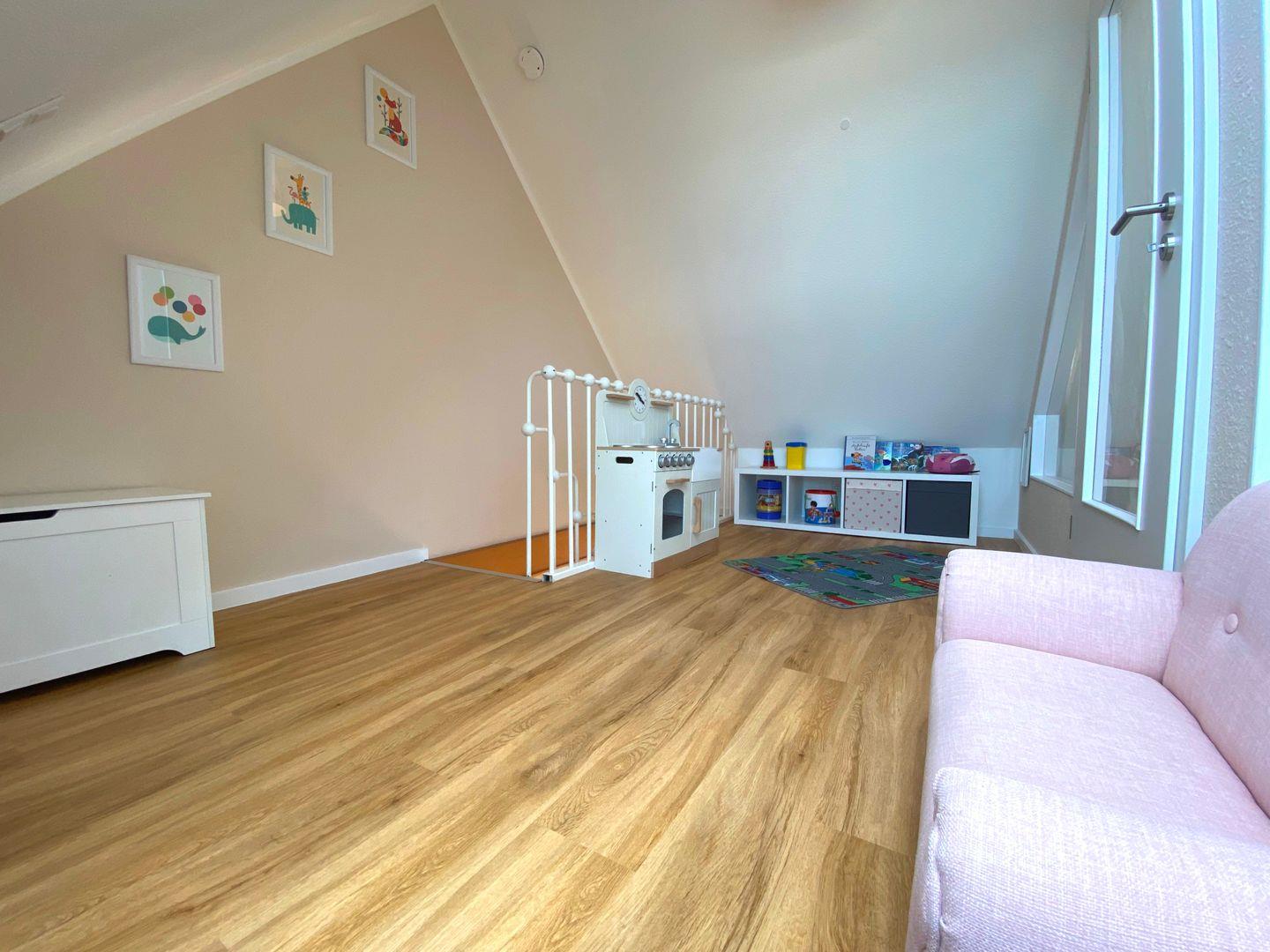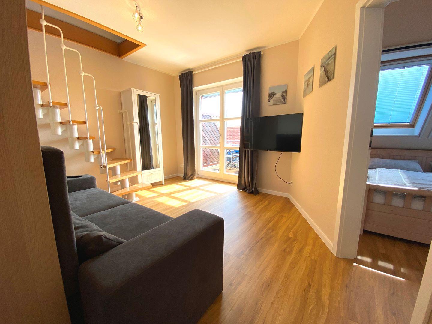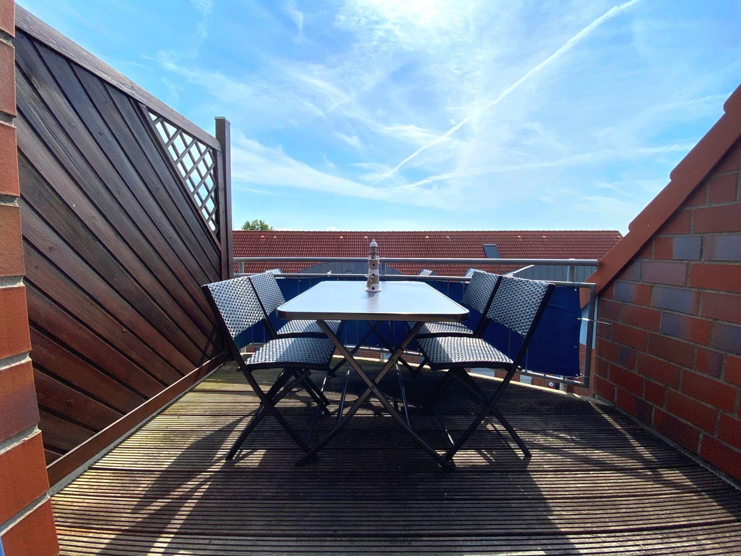 Ein weiteres Highlight ist der möblierte Süd-Balkon, auf dem Sie sonnige Stunden genießen können. Für die kleinen Gäste bietet das Dachgeschoss ein liebevoll eingerichtetes Spielzimmer, das für Spaß und Unterhaltung sorgt.
