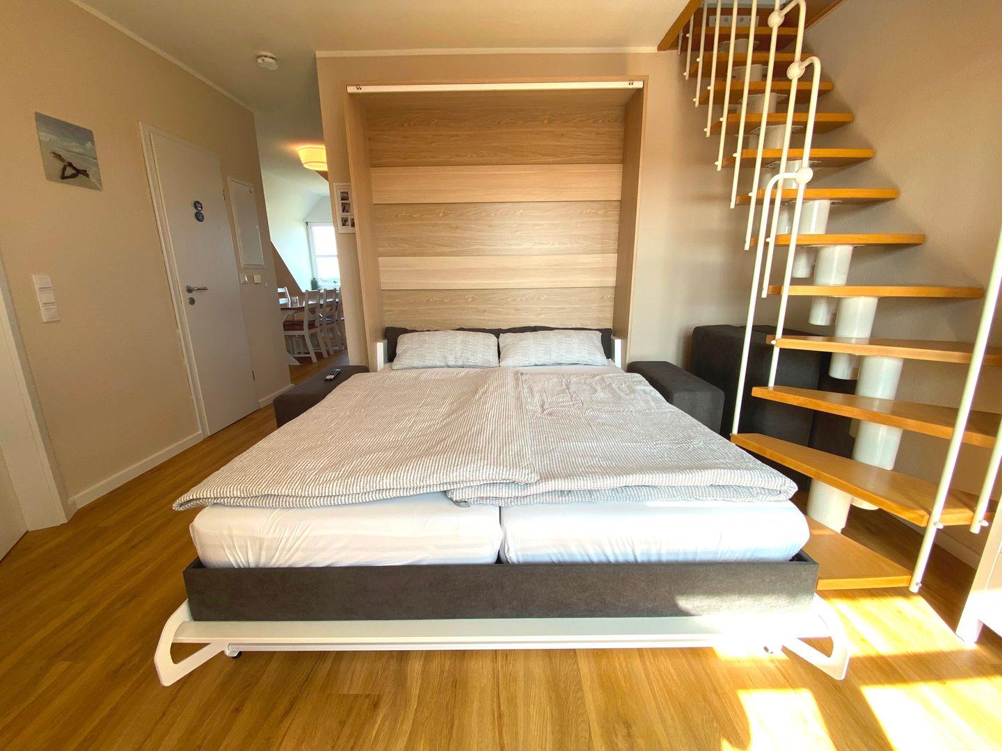 Im hinteren Bereich der Wohnung erwartet Sie ein gemütliches Schlafzimmer mit einem bequemen Doppelbett mit Rausfallschutz für Kleinkinder und einem geräumigen Kleiderschrank. Das angrenzende Wohnzimmer kann bei Bedarf mühelos in ein weiteres Schlafzimmer verwandelt werden, sodass auch Familien oder befreundete Paare genügend Platz finden. Das moderne Duschbad mit Fenster bietet die Möglichkeit, sich nach einem langen Tag am Strand zu erfrischen.