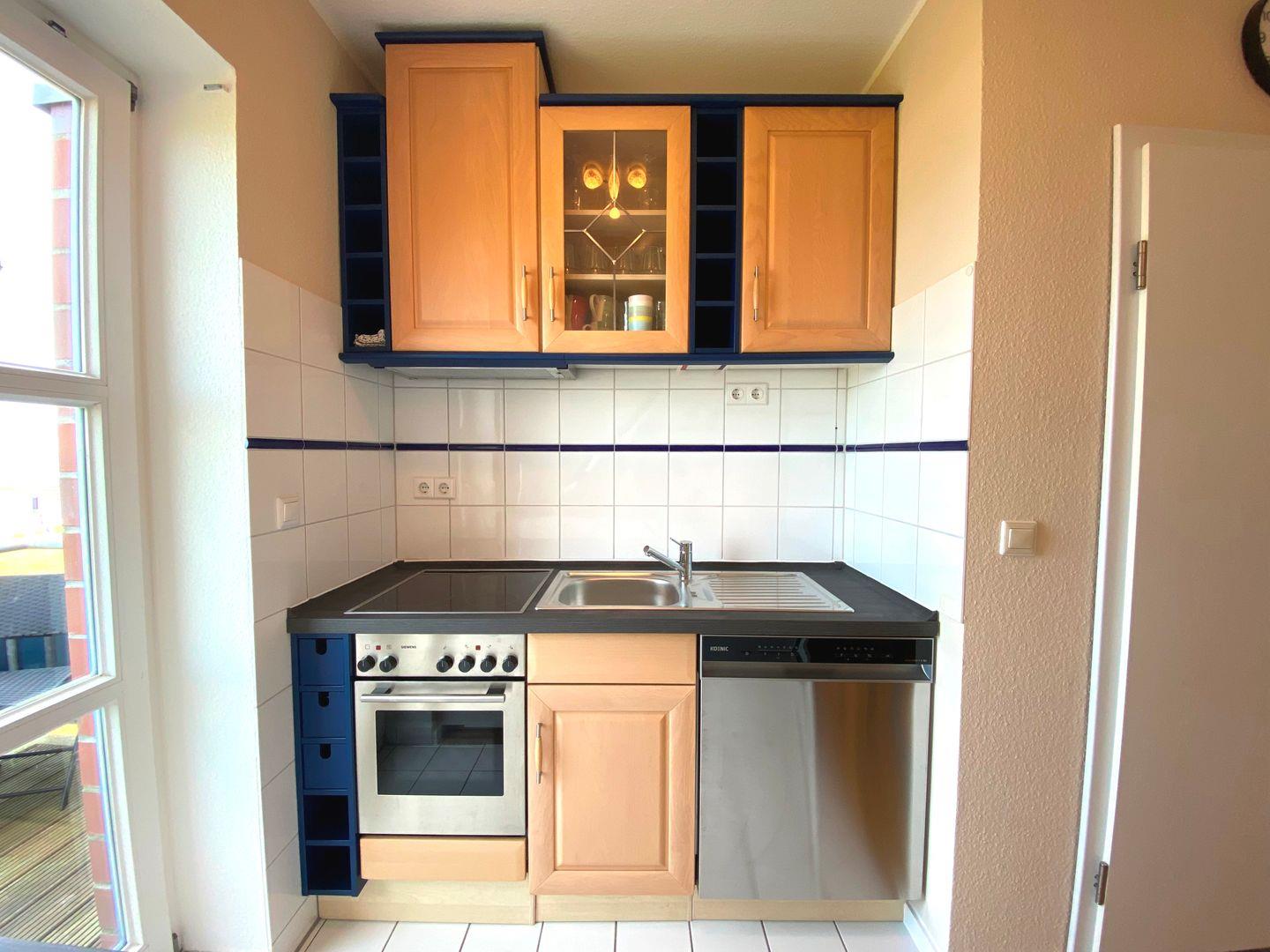 Im vorderen Teil der Wohnung ist das geschmackvoll eingerichtete Esszimmer mit einem charmanten Elektrokamin, der eine warme und einladende Atmosphäre schafft. Angrenzend befindet sich eine große Theke sowie eine komplett ausgestattete Küchenzeile, die keine Wünsche offenlässt: Backofen, Spülmaschine und ein Kühlschrank mit Gefrierfach gehören u.a. zur Ausstattung. Von hier aus gelangen Sie direkt auf den möblierten Balkon, der zum Verweilen und Genießen des Meeresblicks einlädt.