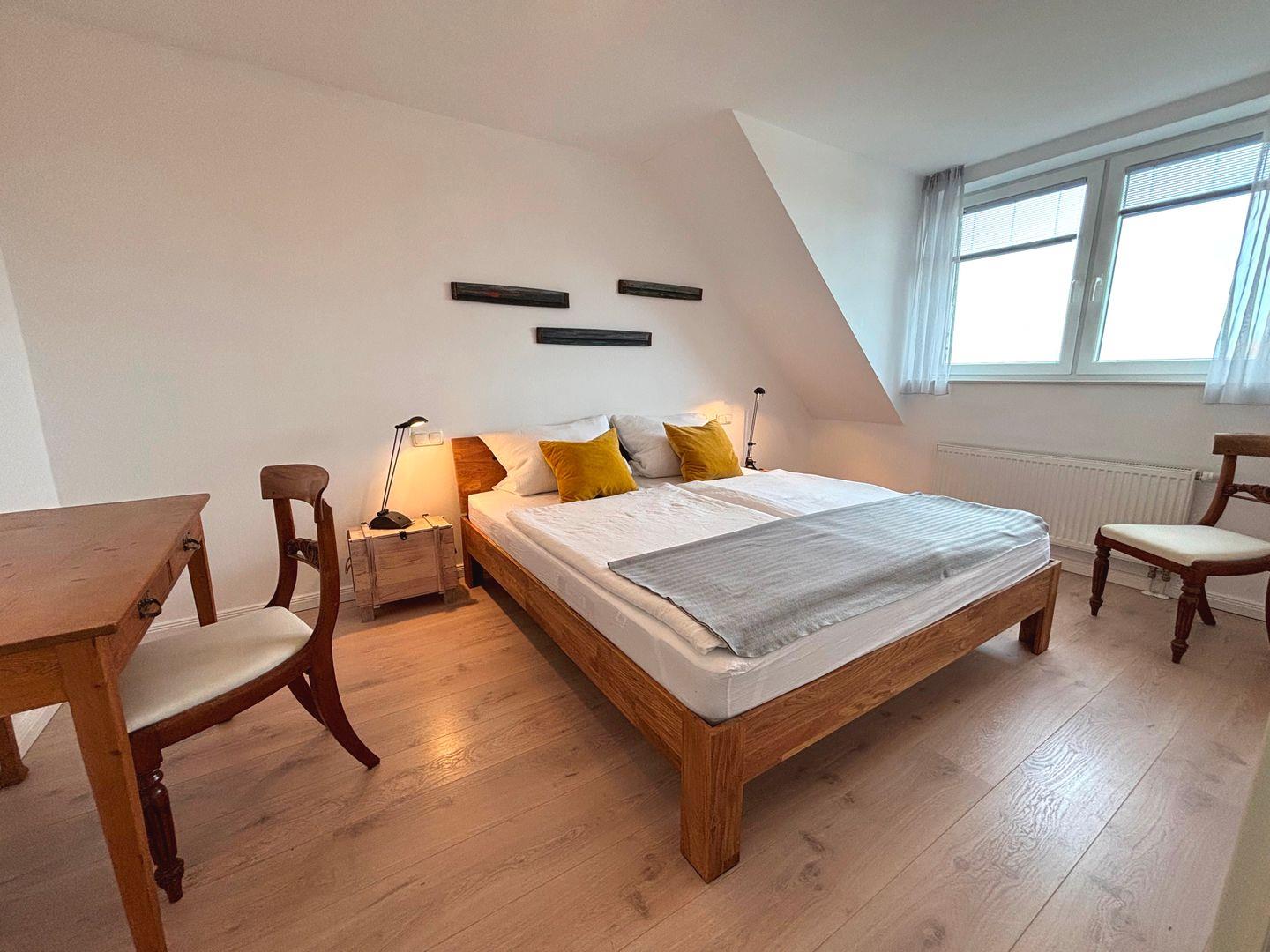 Die Wohnung besticht durch drei stilvolle Schlafzimmer, die alle mit komfortablen Laminatböden ausgestattet sind. Jedes Zimmer lädt zum Träumen und Entspannen ein. Das großzügige Wohn- und Esszimmer ist der ideale Ort, um gemeinsame Zeit zu verbringen oder die Abende stimmig ausklingen zu lassen. Hier finden Sie ein bequemes Sofa, einen großen Esstisch und einen Kamin, der für eine angenehme Atmosphäre sorgt.