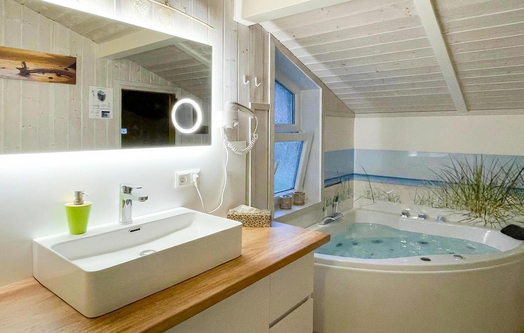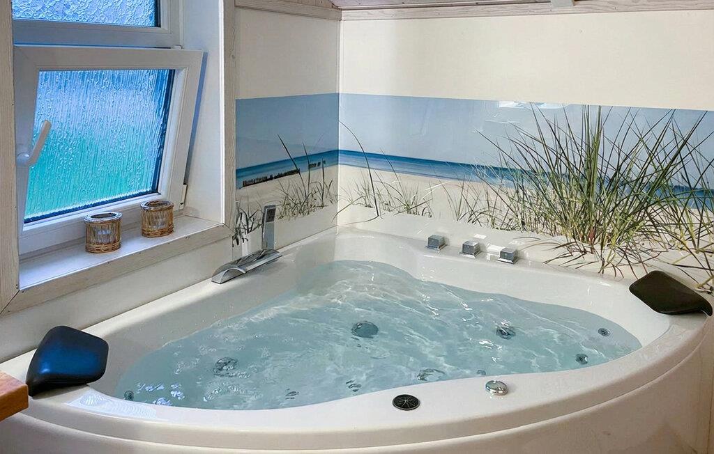 - Nogle billeder er eksempler. Gulvbelægningen, farven på huset og indretningen kan variere. Whirlpool og sauna er identiske i alle huse af denne type.
