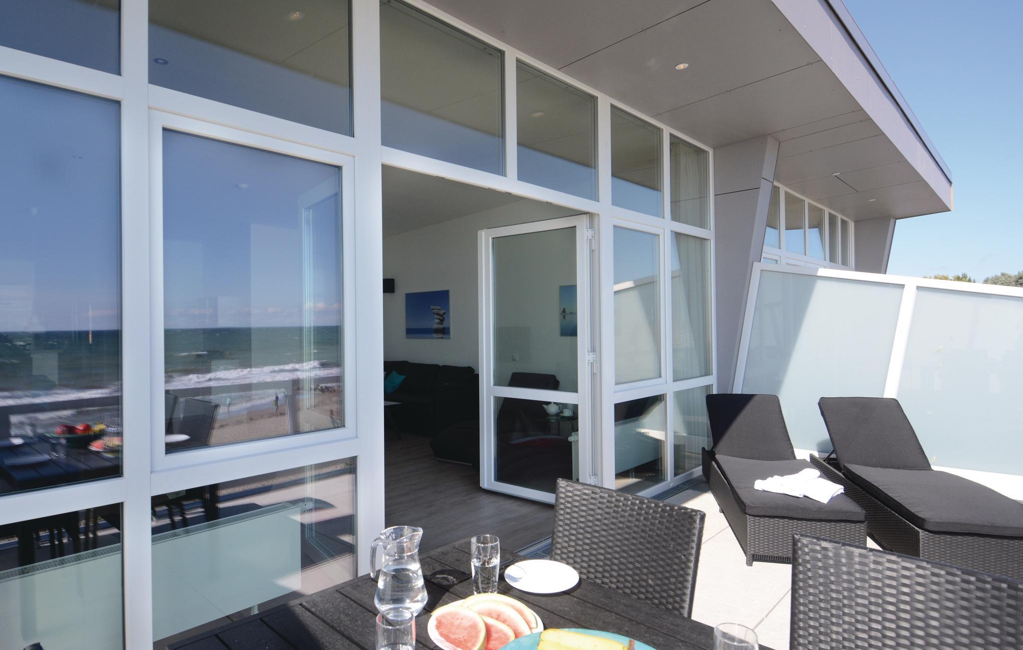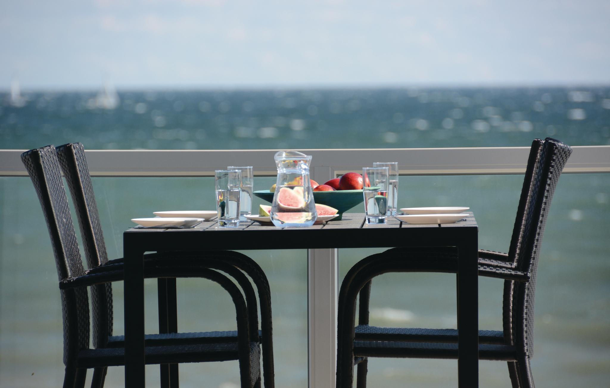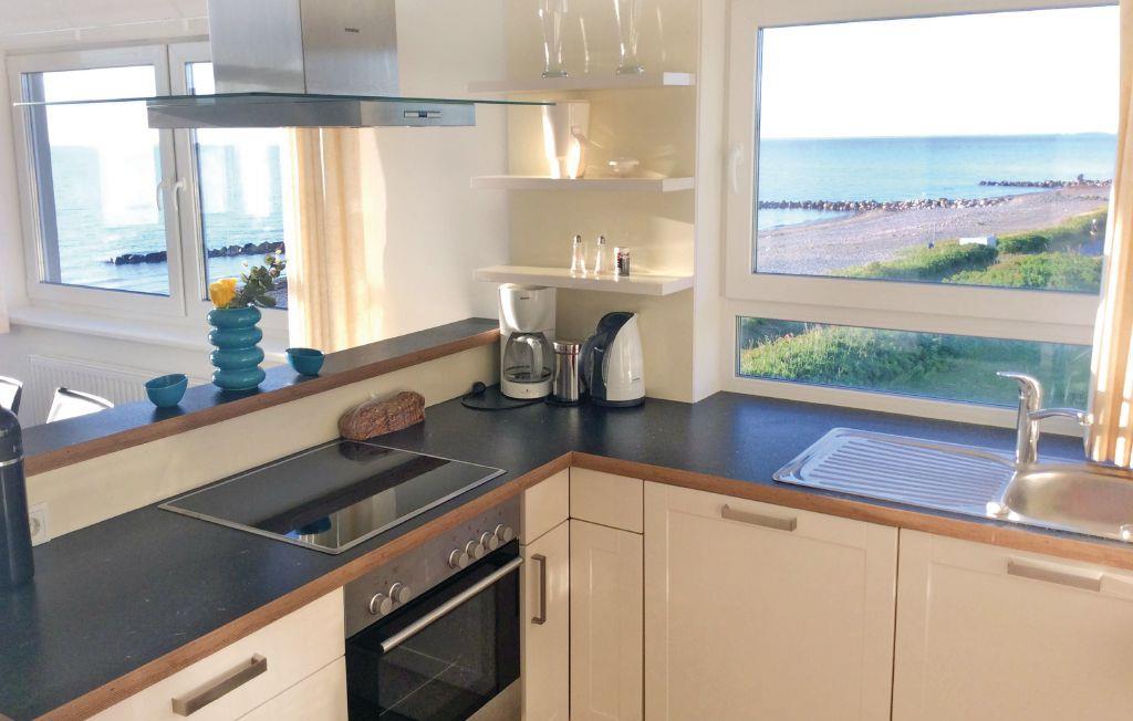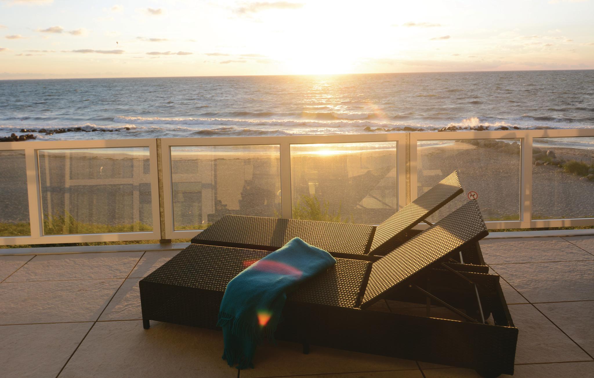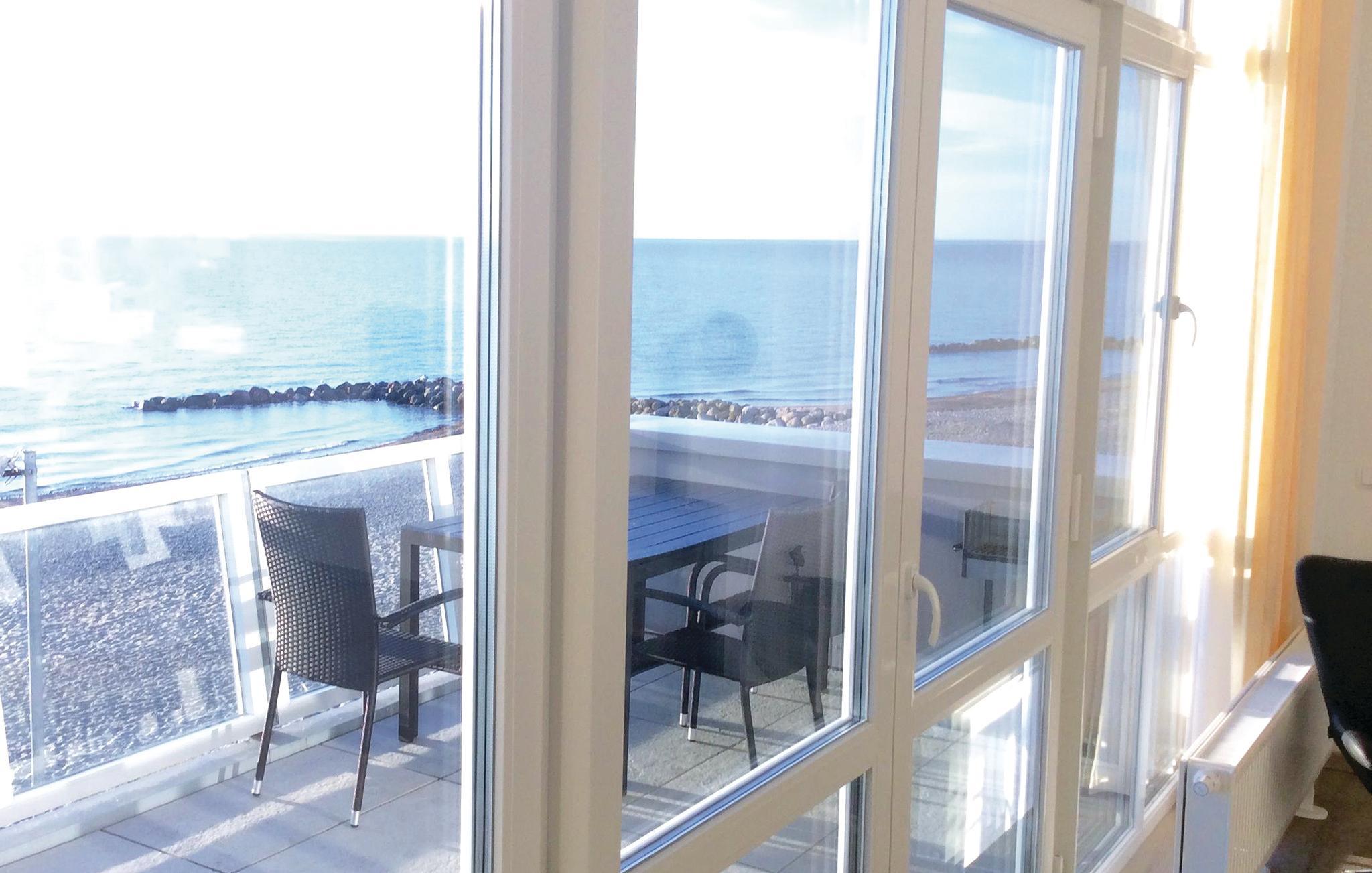 På den anden side er svalegangen med indgang til de i alt seks lejligheder i huset. Fordi svalegangen er så stor, kan den også bruges som loggia. Her har I bord og havestole, hvor I kan nyde den varme aftensols sidste stråler. Ferielejligheden har med sine 110 m² meget plads til op til seks personer (to sovepladser på sofaen til at trække ud, i opholdsområdet) og har sin egen lille wellnessoase med topersoners whirlpool og sauna. Om vinteren sørger den skandinaviske kamin for en særligt hyggelig atmosfære - her kan I foruden den knitrende kaminild nyde panoramaudsigten over den stormfulde Østersø.