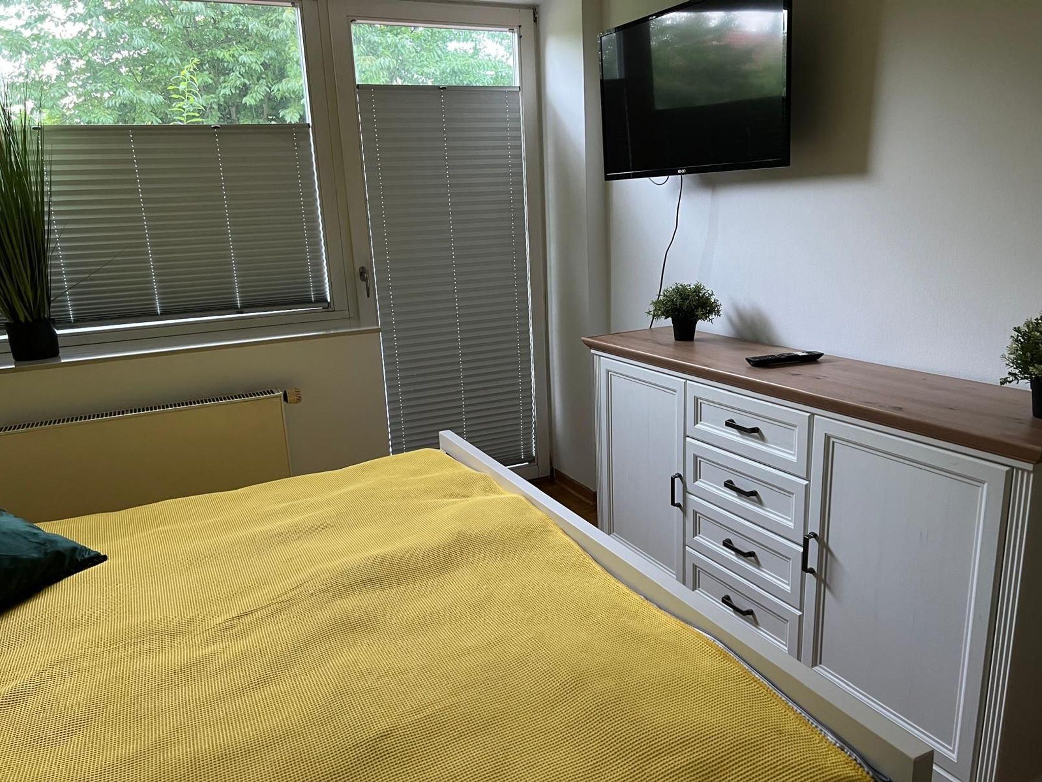 Das Schlafzimmer ist ausgestattet mit einem Doppelbett (180cm x 200cm) und einem zusätzlichen Flachbild-TV.