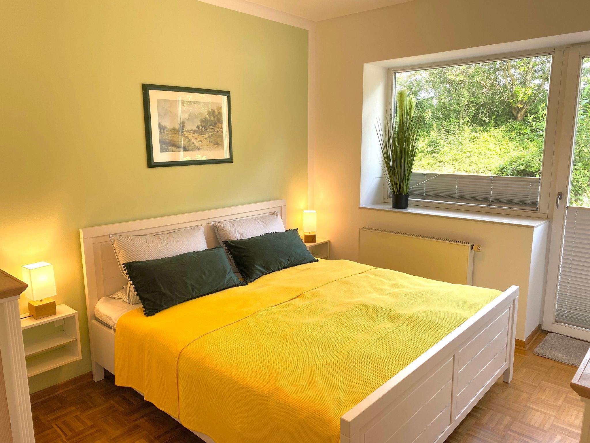 Die 2-Zimmer-Ferienwohnung mit ca. 63 m² Wohnfläche ist aufgeteilt in: Schlafzimmer mit Doppelbett (180cm x 200cm/getrennte Matratzen) und Flachbild-TV; komb. Wohn-/Schlafraum mit Essplatz und Schlafcouch (140cm x 200cm), Kinderbett und Hochstuhl vorhanden; offene, voll ausgestattete Einbauküche; Bad mit Wanne/Dusche/WC; möblierte Terrasse; kostenfreies WLAN; PKW-Stellplatz; abschließbarer Fahrradraum; Nichtraucher!; Haustier auf Anfrage. Ohne Bett- und Handtuchwäsche.