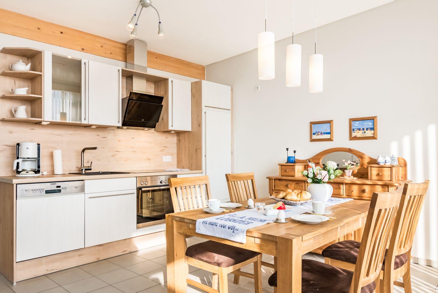 Die Einbauküche wurde mit neuen Gläsern, Geschirr und Kochtöpfen eingerichtet. Sie besteht aus einem Kühlschrank mit Eisfach, Ceranfeld, einer Dunstabzugshaube und einem Geschirrspüler. Außerdem sind eine Kaffeemaschine, ein Elektrogrill, eine Senseo Padmaschine, Toaster, Wasserkocher, Bügeleisen, Bügelbrett und ein Fön vorhanden.