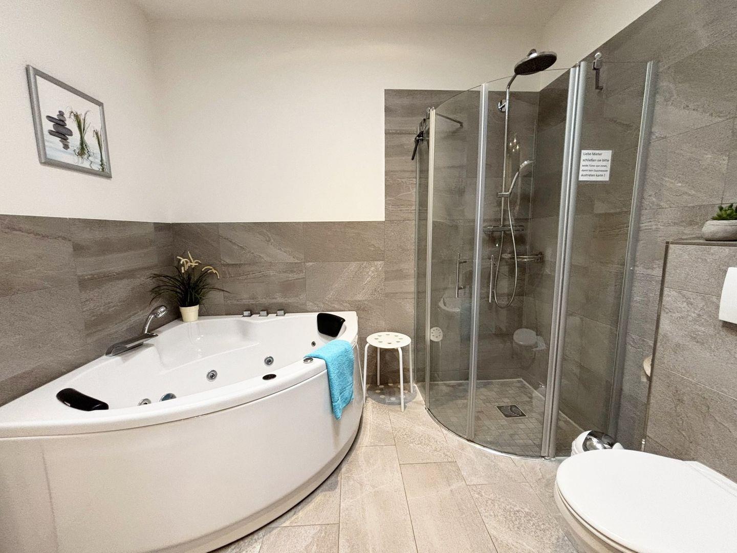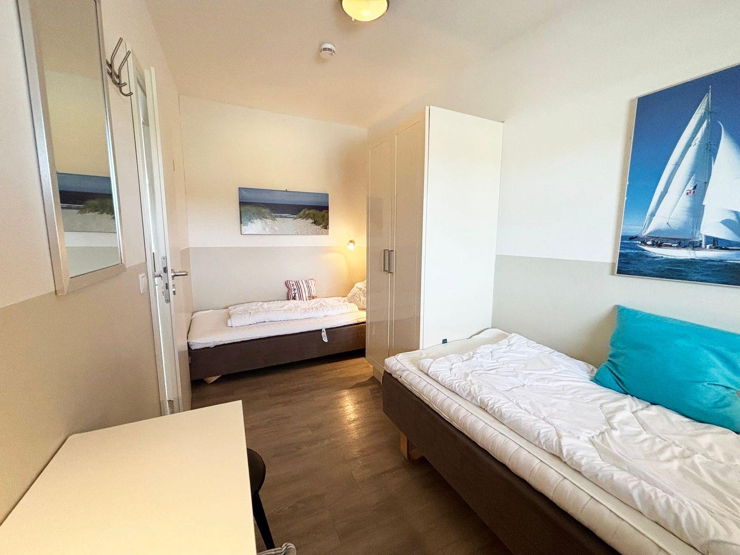 Ein echtes Highlight ist der private Wellnessbereich mit eigener Sauna und Whirlwanne – ein Ort zum Abschalten, Entspannen und neue Kraft tanken. Ob nach einem langen Strandtag oder an einem rauen Herbstnachmittag – hier genießen Sie Ihre ganz persönliche Auszeit. Das moderne Badezimmer bietet eine bodengleiche Dusche, einen stilvollen Waschtisch und einen Haartrockner für maximalen Komfort.