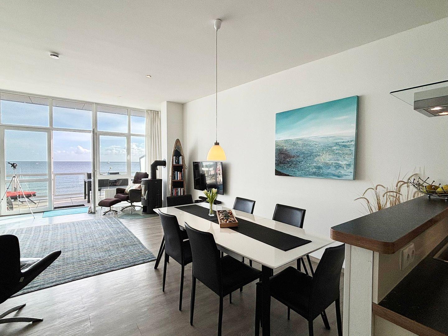 Der offen gestaltete Wohn- und Essbereich verbindet modernes Design mit wohnlicher Gemütlichkeit. Die voll ausgestattete Küche lässt keine Wünsche offen – ob Cerankochfeld, Backofen, Mikrowelle, Kaffeemaschine, Padmaschine, Toaster oder Geschirrspüler: Alles ist vorhanden, um entspannt zu kochen oder das Frühstück mit Meerblick zu genießen. Im angrenzenden Wohnbereich laden ein bequemes Sofa und ein Sessel zum Zurücklehnen ein. Für Unterhaltung sorgen Sat-TV, DVD- und CD-Player, eine kleine Auswahl an Büchern und Filmen sowie kostenfreies WLAN. An kühleren Tagen schafft der skandinavische Kaminofen eine wohlige Atmosphäre – perfekt, um sich nach einem Spaziergang an der frischen Seeluft mit einem heißen Getränk aufzuwärmen.