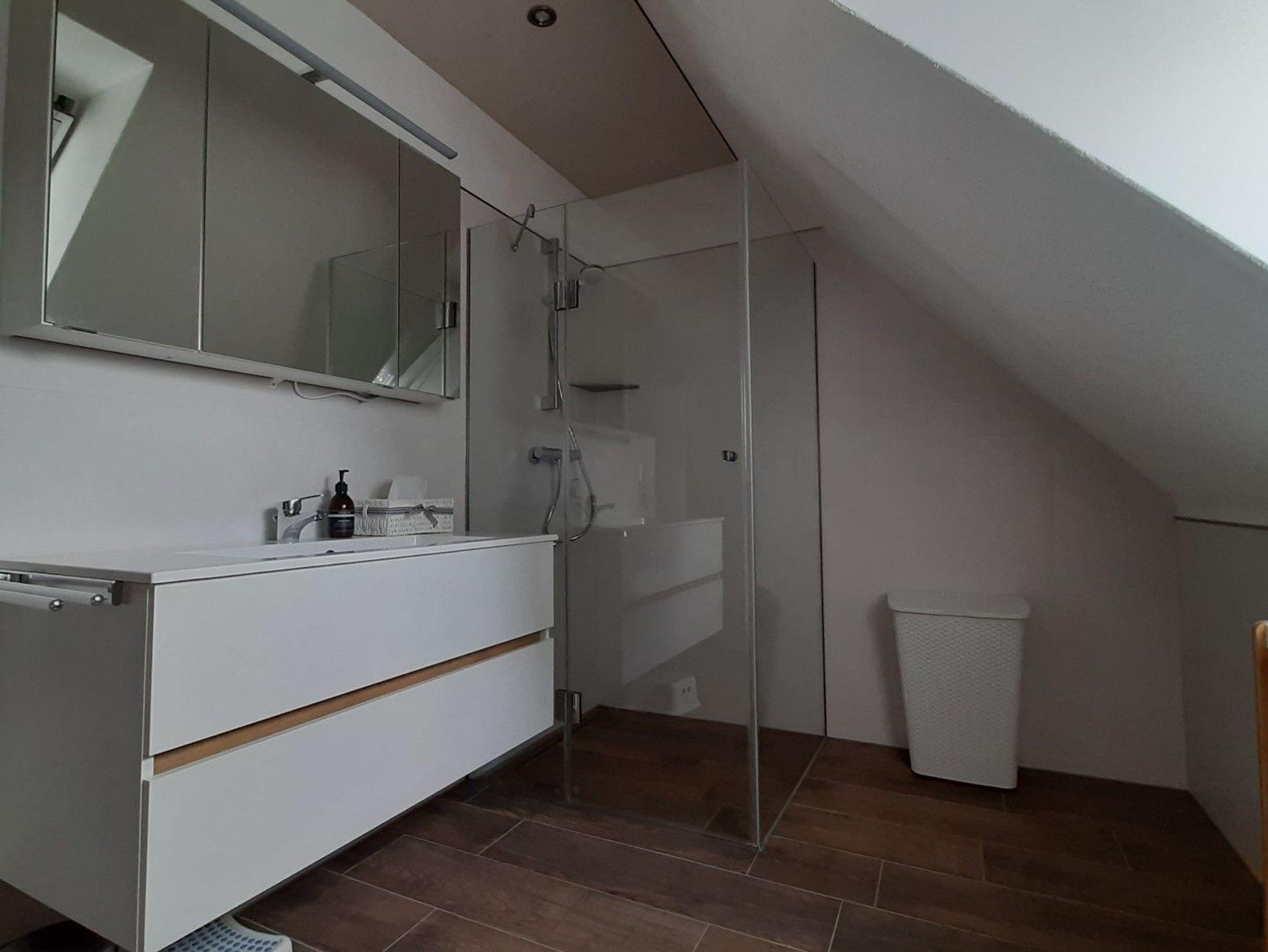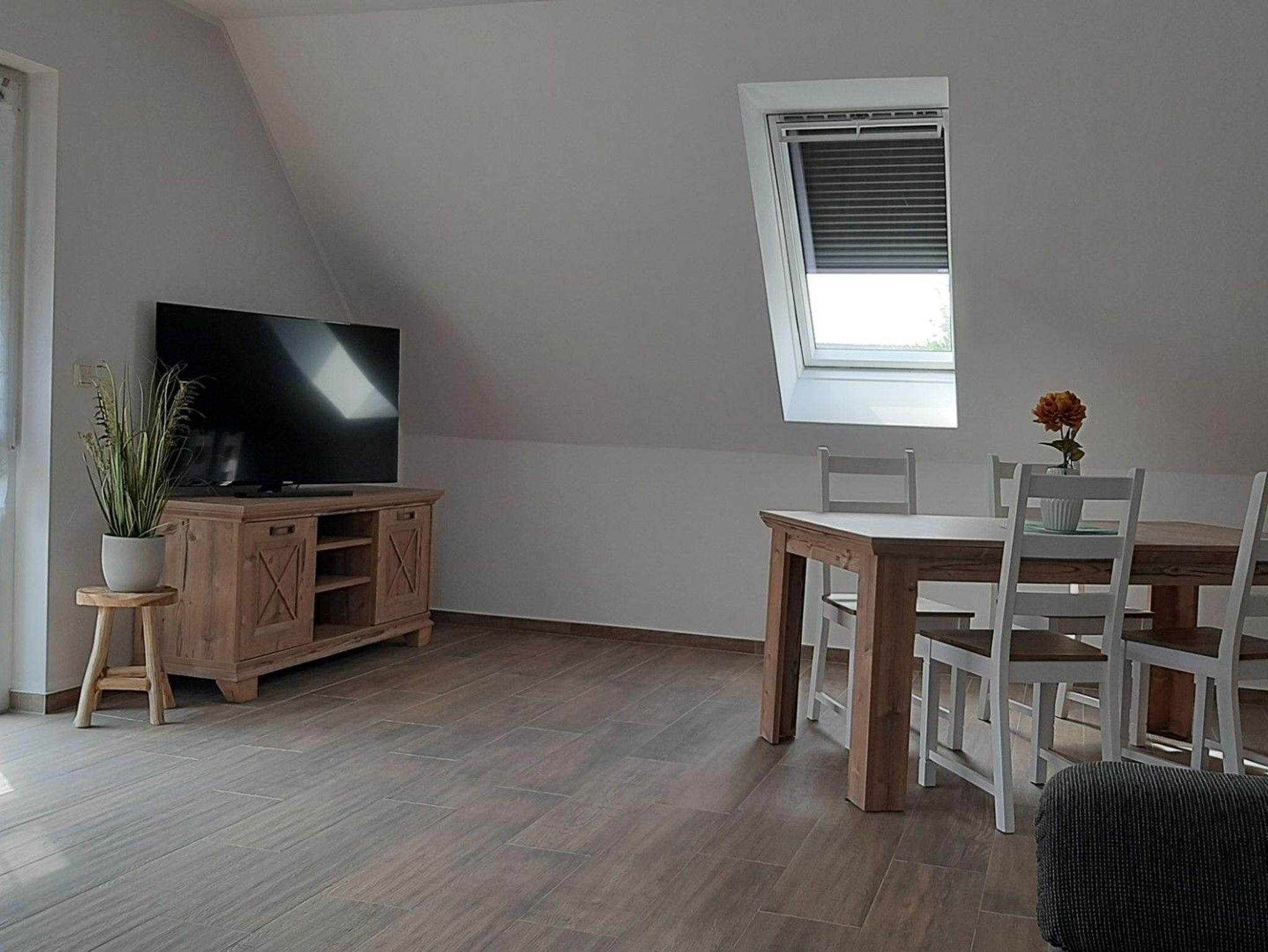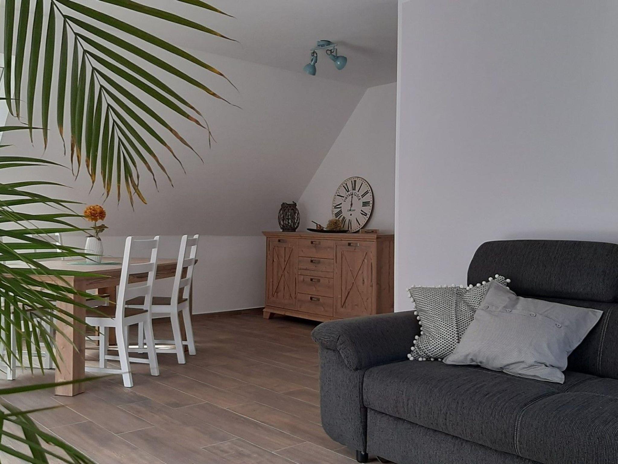 Es steht den Gasten die komplette obere Etage zur Verfügung. Die 81 m² große Ferienwohnung hat einen Wohnraum, ein Schlafraum, ein Kinderzimmer und zwei Bäder.