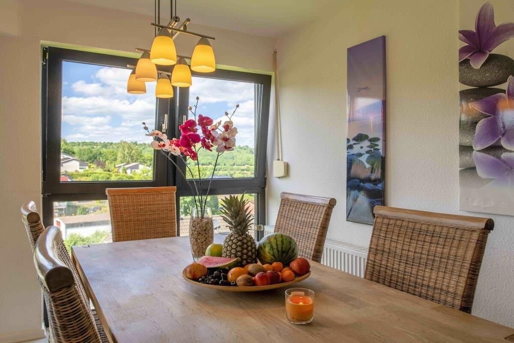Ferienwohnung Seeblick Diese Ferienwohnung ist hell, modern und elegant eingerichtet. Sie hat einen herrlichen Blick auf den See und den Ort Tal. Bis zum See und dem Ortskern sind es nur wenige Gehminuten. Alle Informationen auch auf unserer Website: www.villa1.de Die Wohnung liegt in einem schönen Wohngebiet. Es handelt sich um eine Nichtraucherwohnung (Raucher bitte auf den überdachten Bakon ausweichen). Die elegante Ferienwohnung verfügt über kostenlosen Internetzugang mit Wlan, Waschmaschine und ein Trockner können im nahe gelegenen Maarberg Resort benutzt werden. Ferienwohnung Seeblick: Die Wohnung ist ca. 76 qm groß und für 2 bis 6 Personen geeignet. Großer Wohn-Schlafraum mit Doppelschlafsofa, Essecke mit See- und Panoramablick, 2 separate Schlafräume, davon ein Schlafraum mit großem Doppelbett (2,00 m x 1,80 m) und ein Schlafraum mit franz. Doppelbett (1,40 m breit), hochwertige Küche mit Spülmaschine, 4 Platten-Ceranfeld, Backofen, Kühlschrank mit Gefrierfach, 2 Kaffeemaschinen: 1 x Kaffeemaschine Sanseo und 1 x Filtermaschine, Abstellraum mit Reinigungsmittel etc. Dusche und WC und Waschtisch, zusätzliches Gäste-WC mit kleinem Waschtisch, Diele, Garderobe, Zentralheizung, Im Wohnraum: Digitalfernsehen mit Flachbildschirm (107 cm, HD-Fernsehen, 2 Satelliten: Astra und Hotbird mit sehr vielen deutschen und internationalen Sendern), Digital-Radio mit vielen deutschen und internationalen Sendern, Die Wohnung verfügt über einen WIFI Internetzugang. Internet / Wlan / Wifi: Kostenlos nutzbar in allen Räumen! DVD-Player, CD-Player, Stereoanlage, Spiele, separater Eingang. Fernseher auch in beiden Schlafzimmern Außenbereich: Großer überdachter Balkon Richtung Westen, ins Tal und Richtung See, mit herrlichem Blick auf den See und den Ort, Gartenmöbel und Esstisch auch auf dem Balkon, Zugang zum Balkon von Wohnzimmer, von Essecke und von dem kleineren Schlafzimmer aus, Parkraum direkt vor dem Hauseingang. Zudem ist eine Garage für Fahrräder oder Motorräder nutzbar. Zur Ausstattung der Wohnung gehören: Mikrowelle, 2 Kaffeemaschinen, Toaster und Wasserkocher. Töpfe und Pfannen sowie Besteck und Geschirr für die höchstmögliche Personenzahl sind selbstverständlich vorhanden. Kinderbett und Hochstuhl können kostenlos bereitgestellt werden. Toilettenpapier ist selbstverständlich vorhanden. Die Wohnung hat eine Zentralheizung und natürlich einen separaten Eingang. Zahlung: Sie können bei uns in folgender Form zahlen: - Per Überweisung im Vorfeld - Per Einzug mit Kreditkarte (Visa, Mastercard) - Per Paypal über unsere e-mail Adresse - Bei kurzfristig getätigten Buchungen können Sie auch vor Ort an unserer Reception im Haupthaus (Maarberg Resort in Schalkenmehren) in bar, mit EC-Karte oder mit der Kreditkarte (Visa, Mastercard) zahlen. Die Anreise kann ab 13 Uhr erfolgen. Die Abreise sollte bis 10.00 Uhr erfolgen. In Einzelfällen können Ausnahmen abgesprochen werden Alle Infos direkt auf unserer website: www.villa1.de