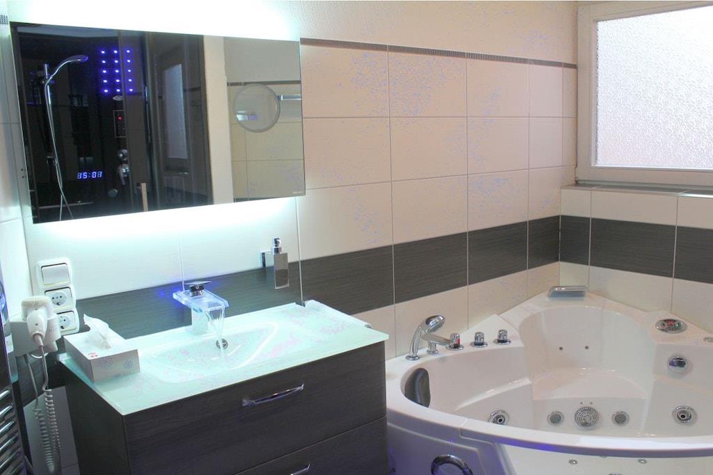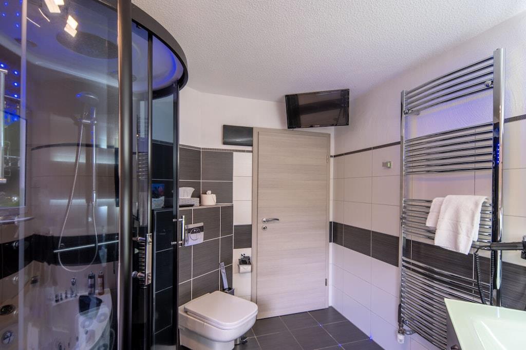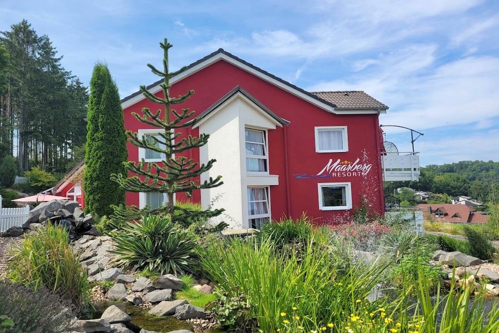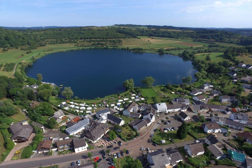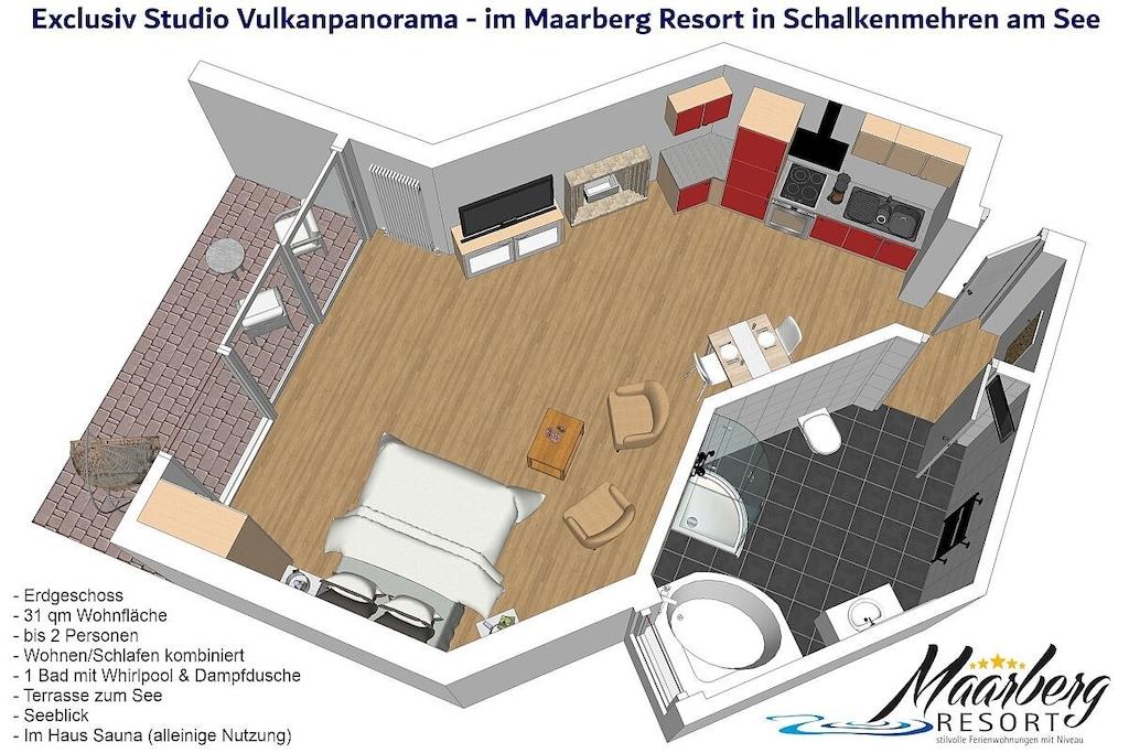 Studio Vulkanpanorama im Maarberg Resort Elegantes Studio in der Apartmentanlage "Maarberg Resort" in Schalkenmehren am See. Herrlicher Seeblick. Mit 2 Personen-Whirlpool und Dampfdusche! Nichtraucherwohnung Die Apartmentanlage "Maarberg Resort" liegt ruhig am Ortrand von Schalkenmehren am See in Hanglage am Ende einer Wohngebietsstrasse. Direkt am Waldrand. Bis zum See und zum Ortskern sind es nur ca. 600 m. Im Ort gibt es gute Restaurants, Cafes und eine Einkaufsmöglichkeit. In der 5 km entfernten Kreisstadt Daun finden Sie zusätzlich viele Einkaufsmöglichkeiten und Supermärkte. Internet / Wlan / Wifi: Kostenlos nutzbar in allen Räumen! Im Haus: Empfangshalle mit Reception, Sitzmöglichkeiten und Spielen (liegen zur Nutzung bereit). Eine neue Sauna und Jacuzzi befinden sich im Untergeschoss (kostenlose Nutzung). Sie können diese Einrichtungen auch alleine nutzen (abschließbar). Zudem steht im Untergeschoss ein Raum mit Waschmaschine, Wäschetrockner, Bügeleisen und Bügelbrett zur Verfügung. In der Empfangshalle erhalten Sie neben Wanderkarten und Ansichtskarten auch kostenloses Informationsmaterial zu den vielen Ausflugszielen und Freizeitmöglichkeiten in der Region. Zudem befindet sich in der Empfangshalle ein Getränkekühlschrank mit Getränken zur Wegnahme auf Vertrauensbasis. Der Außenbereich wird Sie begeistern! Zwei wundervoll und aufwendig angelegte Zierteiche mit Kois und anderen Fischen, 2 Wasserfälle, 2 Bachläufe und eine gepflegte Zierkiesanlage gehören zur Anlage. In den Teichen befinden sich auch Schildkröten. Sitzen Sie gemütlich bei einem Kaffee oder einem Cocktail auf dem Balkon oder der Terrasse und schauen Sie den Fischen und den Schildkröten zu. Oder blicken Sie ins Tal auf den See. Weiter im Außenbereich zu finden: genügende Parkmöglichkeiten, ein Fahrradabstellplatz. Ein Grillplatz mit Blick auf den See befindet sich hinter dem Haus. Studio Vulkanpanorama im Maarberg Resort: Elegantes Studio für 2 Personen. ca. 31 qm Wohnfläche, Terrasse Richtung See und Zierteich. Das Studio Vulkanpanorama liegt ebenerdig (3 Stufen vor der Terrasse) und bietet einen schönen Blick auf den See, die herrliche Landschaft und den gepflegten Zierteich. Sitzen Sie in der Wohnung oder auf der Terrasse und lassen Sie sich von dem Blick verzaubern. Im schönen Wohn/Schlafraum finden Sie ein hochwertige Boxspringbett (180 x 200 cm Doppelbett). Zudem gibt es einen großen, 127 cm HD/3D Fernseher der neuen Generation. Sie haben die Auswahl von ca. 3.000 verschiedenen Fernseh- und Radiosendern in vielen Sprachen von 4 verschiedenen Satelliten. Zudem gibt es einen 3D Blueray-Player und DVD-Player. Auch eine Musikanlage mit Radio, CD usw. befindet sich auf der Wohnung. Es gibt einen kostenfreien Internetzugang mit WIFI (Wlan). Die hell und freundlich eingerichtete Wohnung vermittelt Ihnen eine naturverbundene Atmosphäre (mit Holz und Stein). Es handelt sich um eine Nichtraucherwohnung (Raucher bitte die Terrasse oder Außenbereich benutzen) Die Einbauküche hat einen 4 Plattenherd (Ceranfeld) und Backofen, Spülmaschine, Kühlschrank mit Gefrierfach, Mikrowelle, 2 Kaffeemaschinen (Filter und eine Bosch-Tassimo Maschine). Toaster, Wasserkocher usw. Töpfe und Pfannen sowie Besteck und Geschirr für die höchstmögliche Personenzahl sind selbstverständlich vorhanden. Ein Kinderbett und Hochstuhl können kostenlos bereitgestellt werden. Die Essecke ist für 2 Personen geeignet. Der Schrank verfügt über einen Ganzkörperspiegel. Sie können mit einem Schlüßel der Terrassentüre über die Terrasse und den Zierteich (kleine Brücke) direkt zum Parkplatz oder ins Freie gehen. Somit haben Sie nochmals einen separaten Eingang über die Terrasse. Das Bad ist besonders exklusiv gestaltet! Es verfügt über einen 2 Personen-Whirlpool. Verwöhnen Sie sich selbst im Whirlpool zusätzlich mit einer Lichttherapie, und vielen weiteren Funktionen. Auch ein Radio ist integriert. Spezielles Badesalz für den Whirlpool ist kostenlos vorhanden. Im Bad befindet sich auch ein DVD-Player. Schauen Sie beim gemütlichen Bad einen schönen Film. Für den besonderen Genuss haben wir eine DVD mit Kaminfeuer, Sonnenaufgängen oder Aquariumfischen bereitliegen. Eine separate Dampfdusche sorgt für einen besonderen Genuss. Integriert ist hier eine Dampffunktion, ähnlich einer Dampfsauna (mit Sitz), zudem eine Regendusche, seitliche Massagedüsen und Fußmassagedüsen. Radio, Lichttherapie usw. Die im gesamten Bad, blau leuchtenden Boden-LED´s bieten eine tolle Atmosphäre. Waschplatz mit einem modernem Glaswaschbecken, Schubladenunterschrank. Ein großer, beleuchteter Spiegel mit Schminkspiegel und digitaler LED-Uhr, ein Hotelföhn und eine Personenwaage sind vorhanden. Moderne Heizung (Chrom) mit Handtuchwärmer. Modernes WC mit Absenktechnik. Zur Wohnung gehört eine Terrasse mit 2 Loungesesseln und einem Cocktail- bzw. Kaffeetisch. Falls Sie auf der Terrasse auch richtig gut Essen möchten, finden Sie einen weiteren Esstisch als Klapptisch zur Wegnahme auf jeder Etage vor den Wohnungen. Die Wohnung hat eine Zentralheizung und 2 separate Eingänge. 1 x über den Haupteingang des Hauses (Treppenhaus) und zudem direkt über eine Brücke über den Teich nach außen. Zahlung: Sie können bei uns in folgender Form zahlen: - Per Überweisung im Vorfeld - Per Einzug mit Kreditkarte (Visa, Mastercard) - Per Paypal über unsere e-mail Adresse - Bei kurzfristig getätigten Buchungen können Sie auch vor Ort an unserer Reception im Haupthaus (Maarberg Resort in Schalkenmehren) in bar, mit EC-Karte oder mit der Kreditkarte (Visa, Mastercard) zahlen.