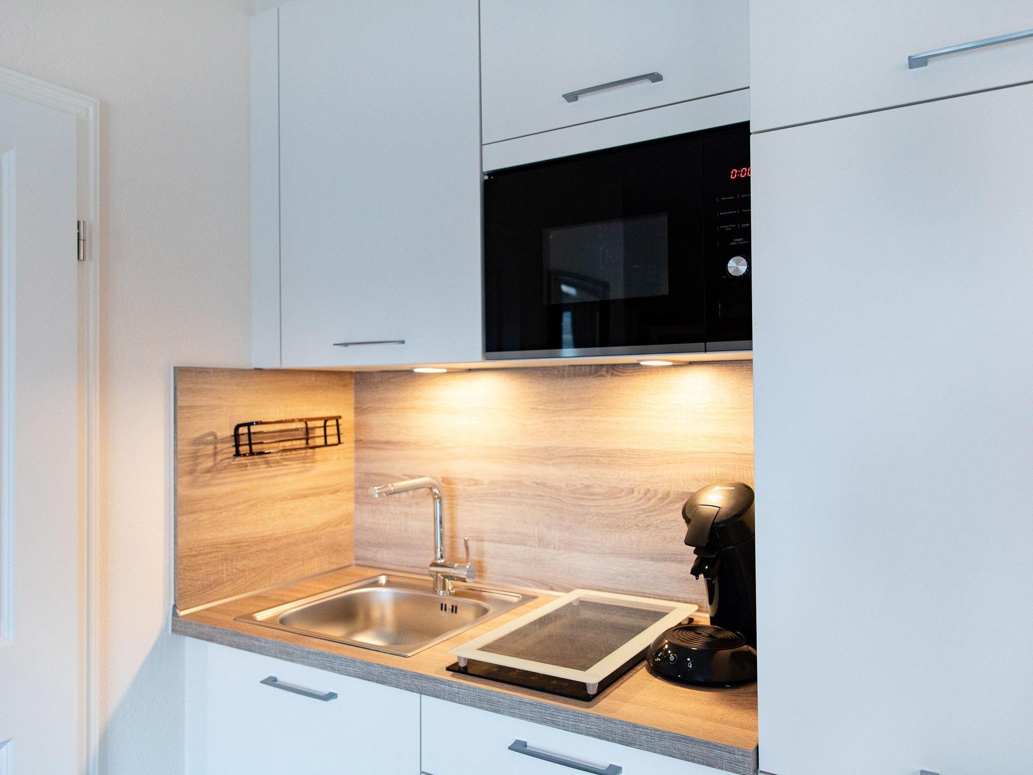 • Kleine, komplett ausgestattete Küchenzeile mit Mikrowelle mit Grillfunktion, Induktionskochfeld, Senseo Kaffeemaschine