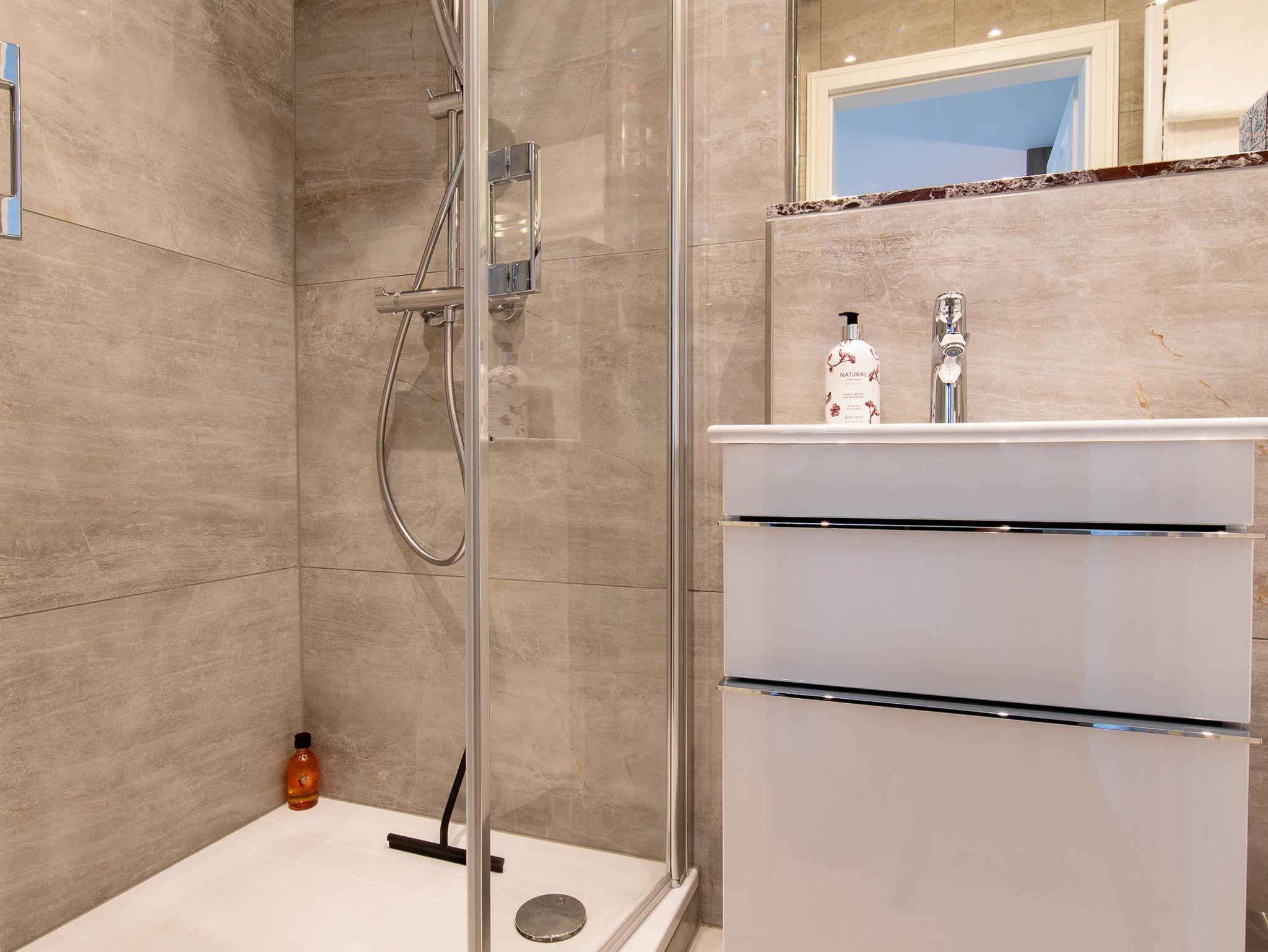 • Exklusives Marmorbad mit ebenerdiger Dusche und WC, Föhn – pro Person ein Badetuch, 2 Handtücher, Gästetuch und Waschlappen