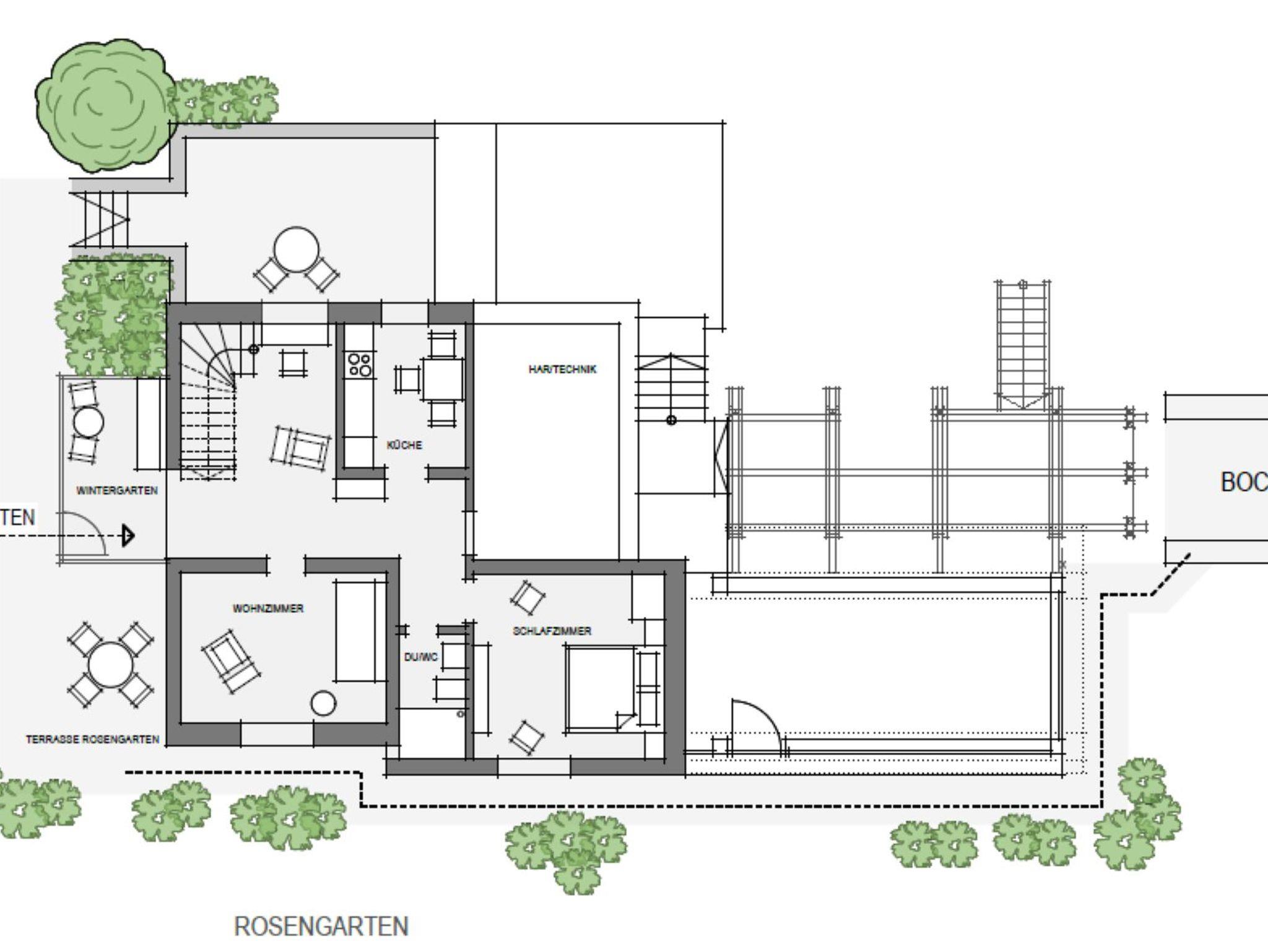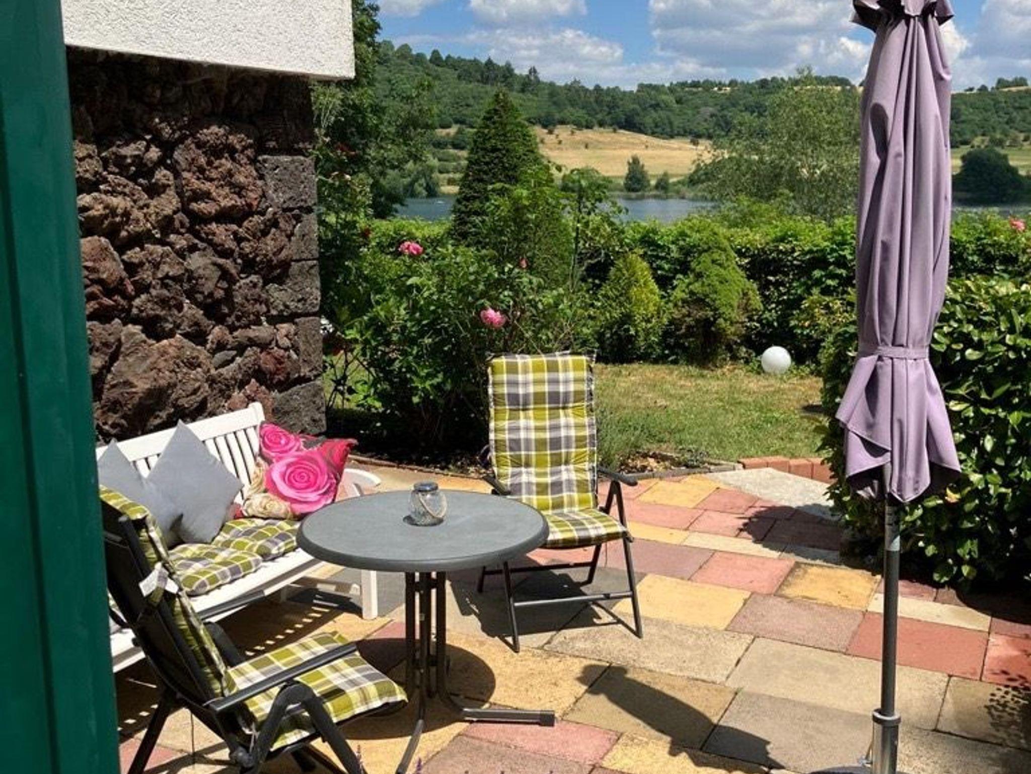 In der ersten Etage mit traumhaftem Blick aufs Schalkenmehrener Maar und Zugang zum grosszügigen Garten, der mit vielfältigen Sitz- und Liegemöglichkeiten und Boccia Bahn zum entspannten Verweilen einlädt.