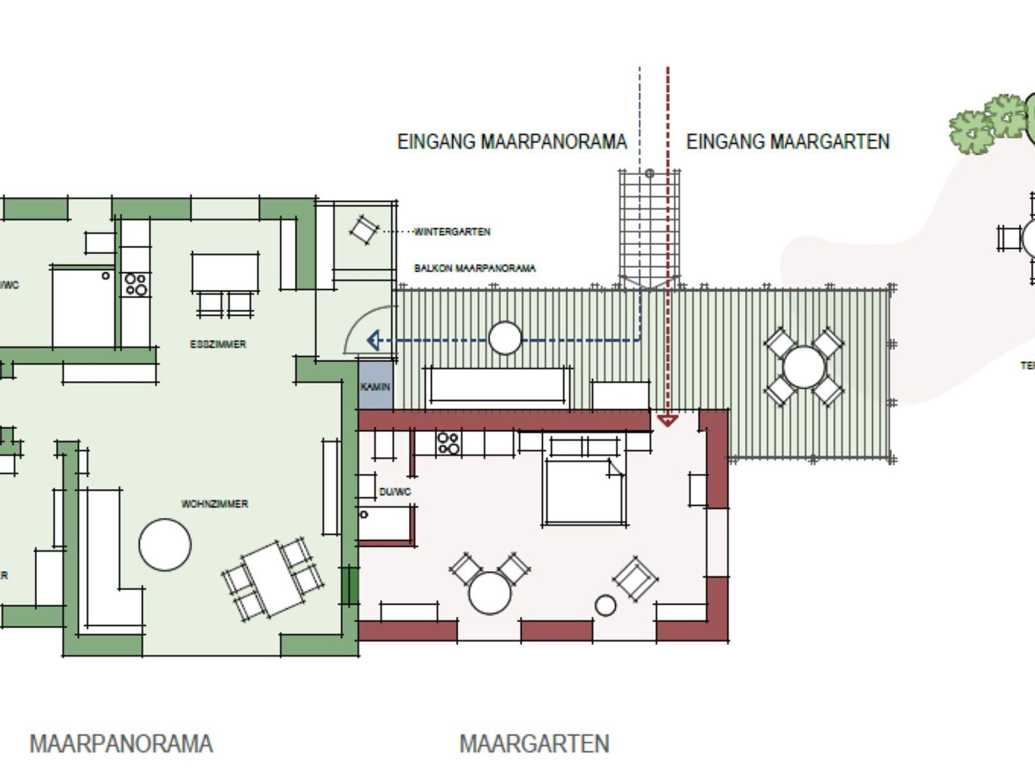2 Wohneinheiten im ersten Stock gelegen, mit 2 separaten Eingängen und einem grossen gemeinsamen Balkon mit grandioser Aussicht in die Gartenanlage und aufs Schalkenmehrener Maar und eine Wohneinheit ebenerdig mit direktem Zugang zum Garten und tollen Terrassen.