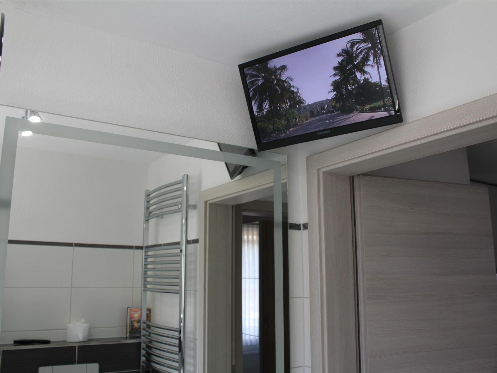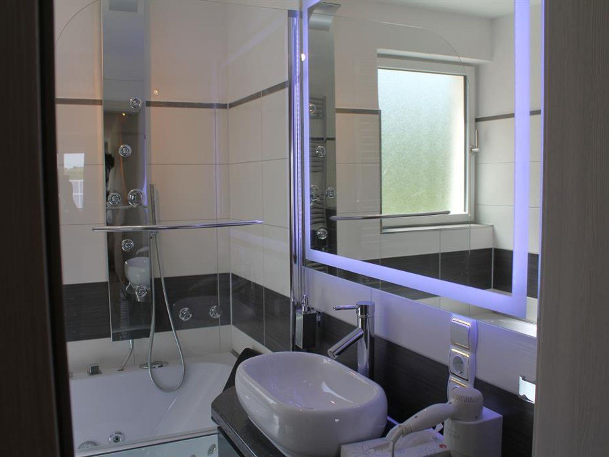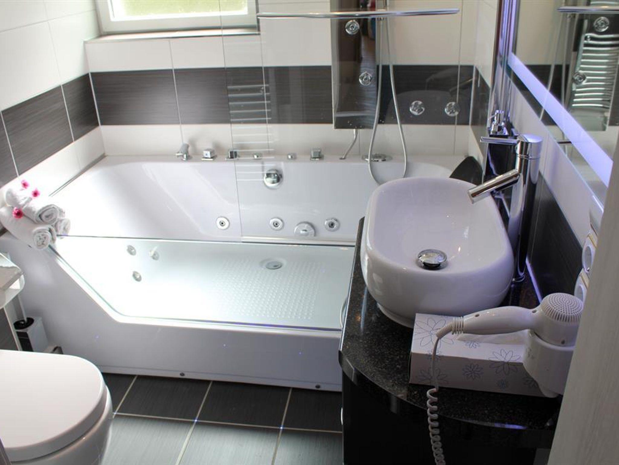 Im hellen Bad finden Sie einen Whirlpool. Verwöhnen Sie sich selbst im Whirlpool. Das Bad verfügt über Sat. TV mit DVD Player.