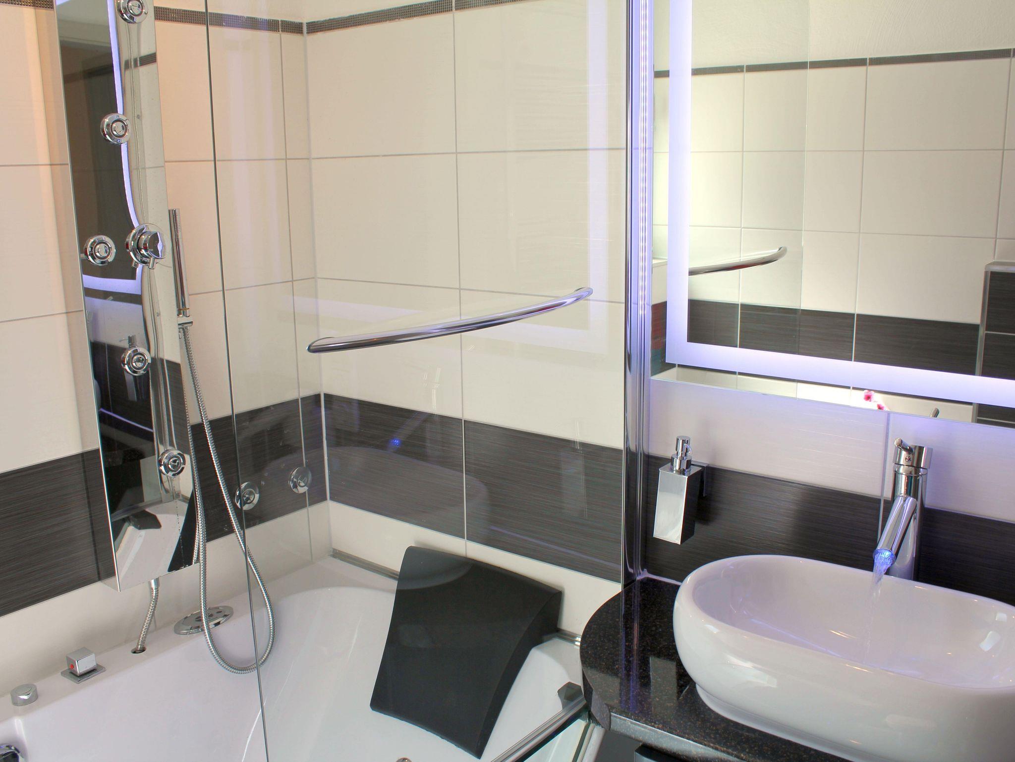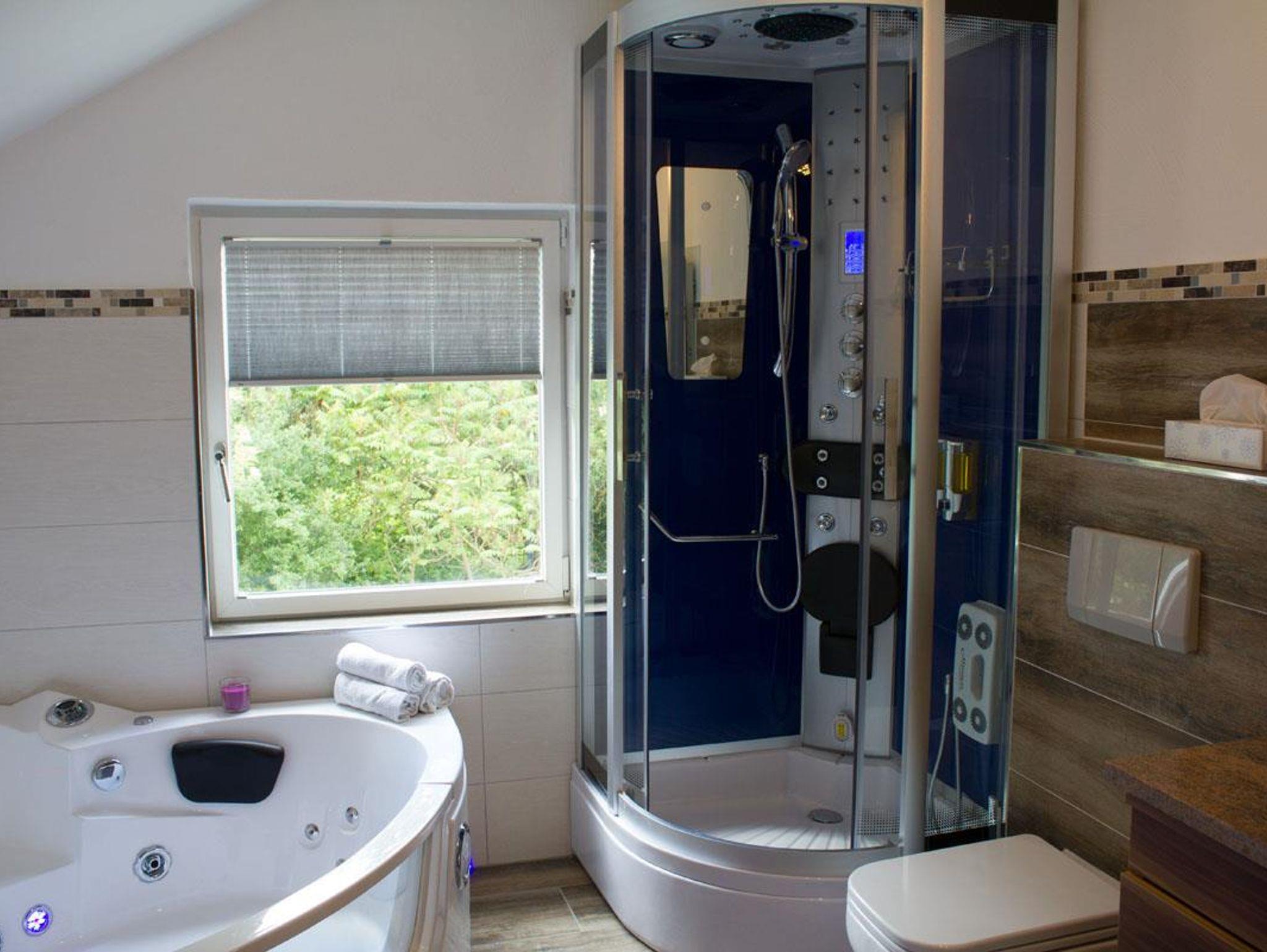 Die im gesamten Bad, blau leuchtenden Boden-LED´s bieten eine tolle Atmosphäre. Ein großer, beleuchteter LED Spiegel, ein Hotelfön und eine Personenwaage sind vorhanden. Moderne Heizung mit Handtuchwärmer.